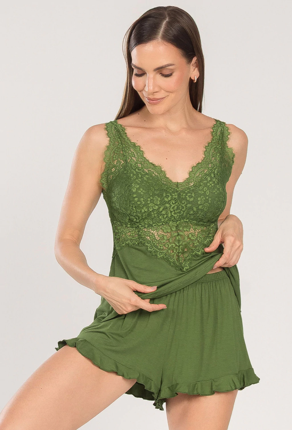 Confeccionado em Malha de viscose anti-pilling e renda o baby-doll Jaíla exala feminilidade e conforto. Uma peça perfeita para quem busca uma noite tranquila de sono. Seus detalhes em renda na parte do busto e das alças deixam um ar de sensualidade, mas sem abrir mão do conforto. Já a parte do shortinho tem a delicadeza dos babados na barra e elástico na cintura. Trazendo praticidade ao vestir.