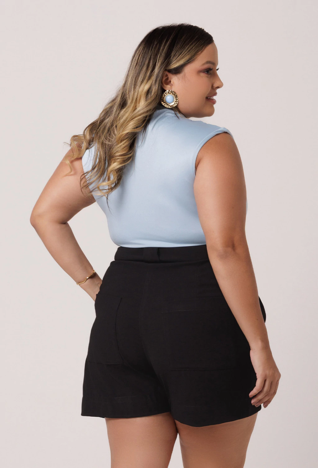 Bermuda confeccionada em crepe satin. A bermuda Noemi é uma peça clássica e atemporal. Com modelagem mais soltinha e com comprimento um pouco acima do joelho esta peça oferece conforto e estilo. Para quem deseja um look mais sério ou para compor looks mais despojados. Seu fechamento no cós é em colchete e sua braguilha possui fechamento em zíper. Na parte da frente tem duas pregas que adicionam um charme a mais a peça.