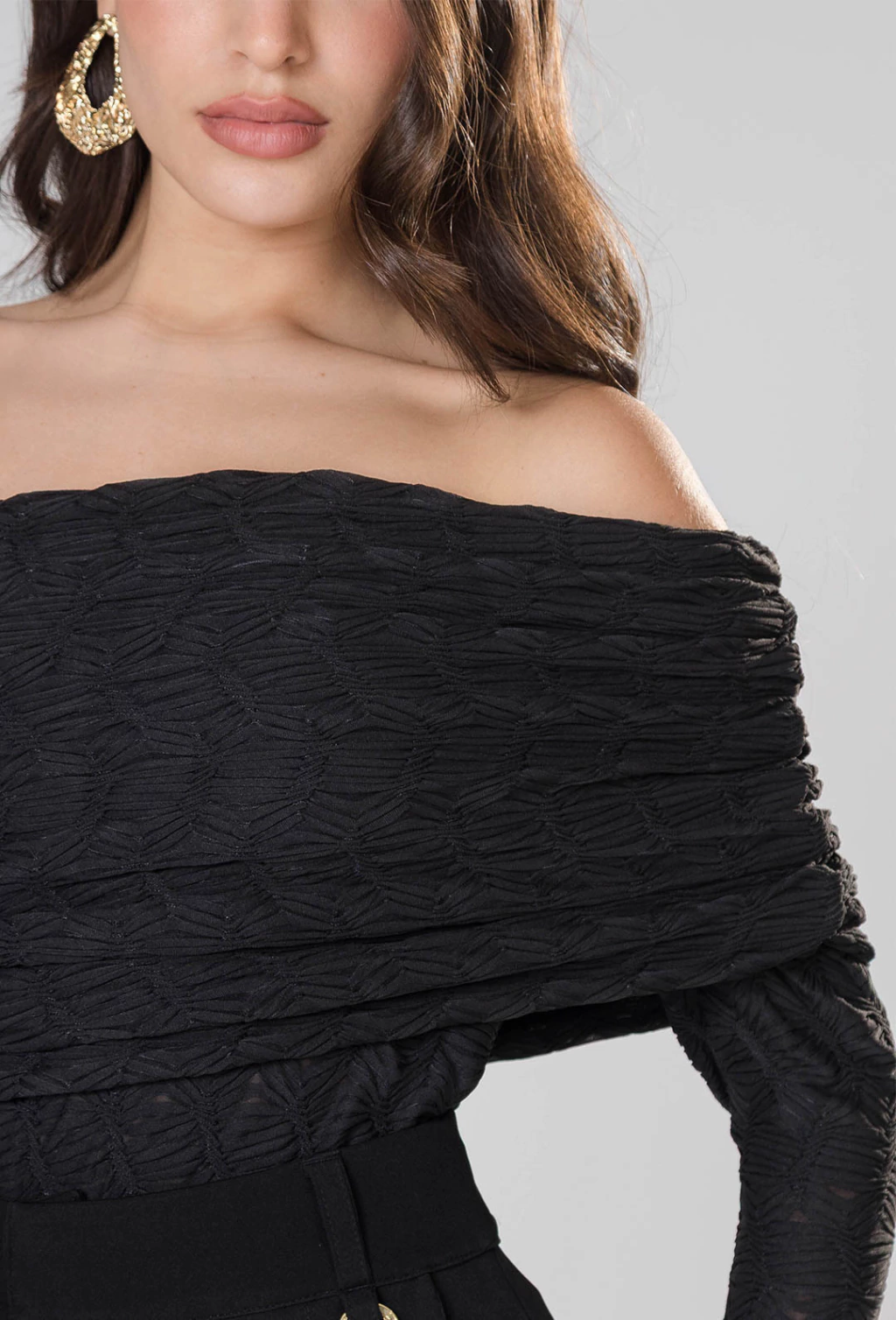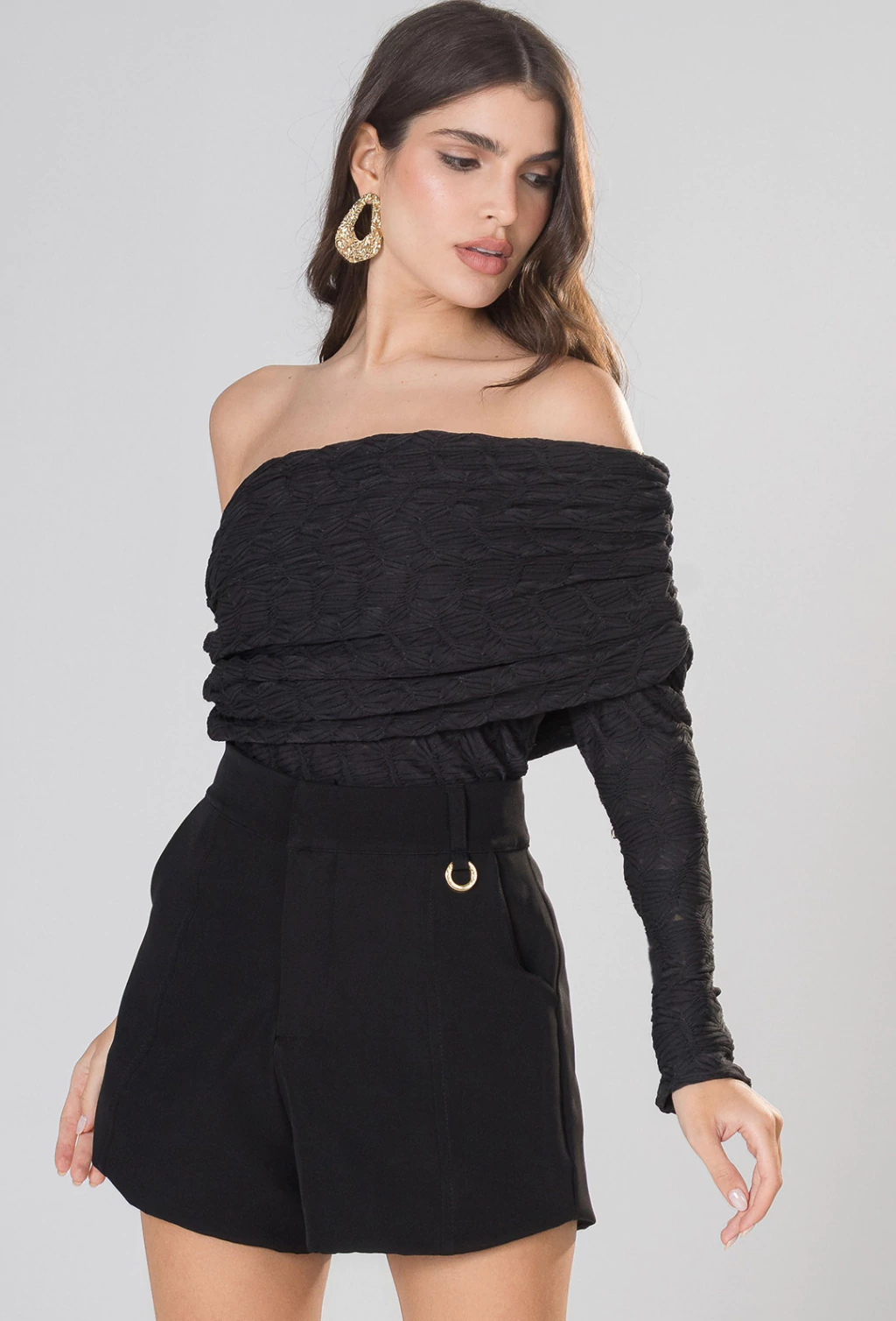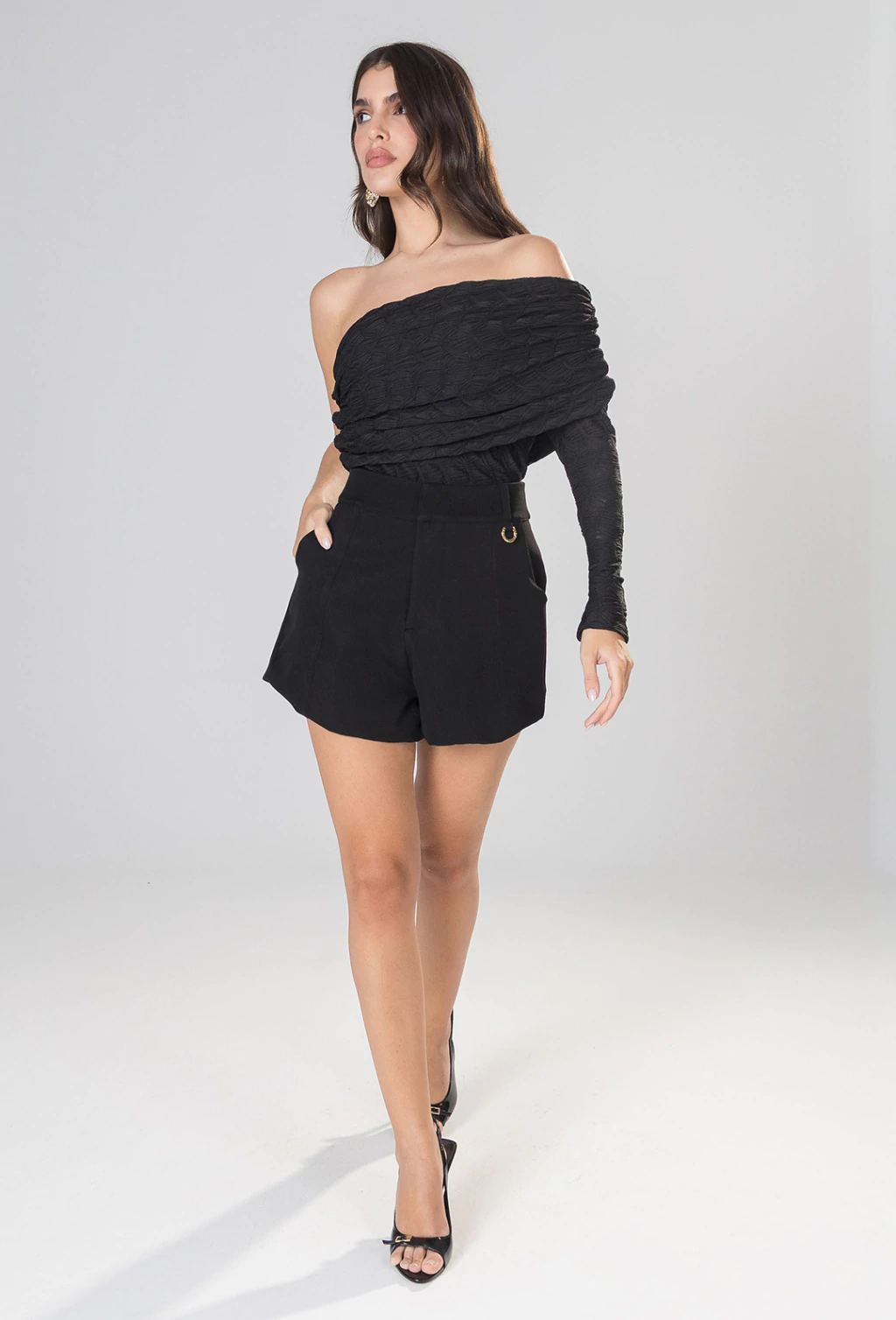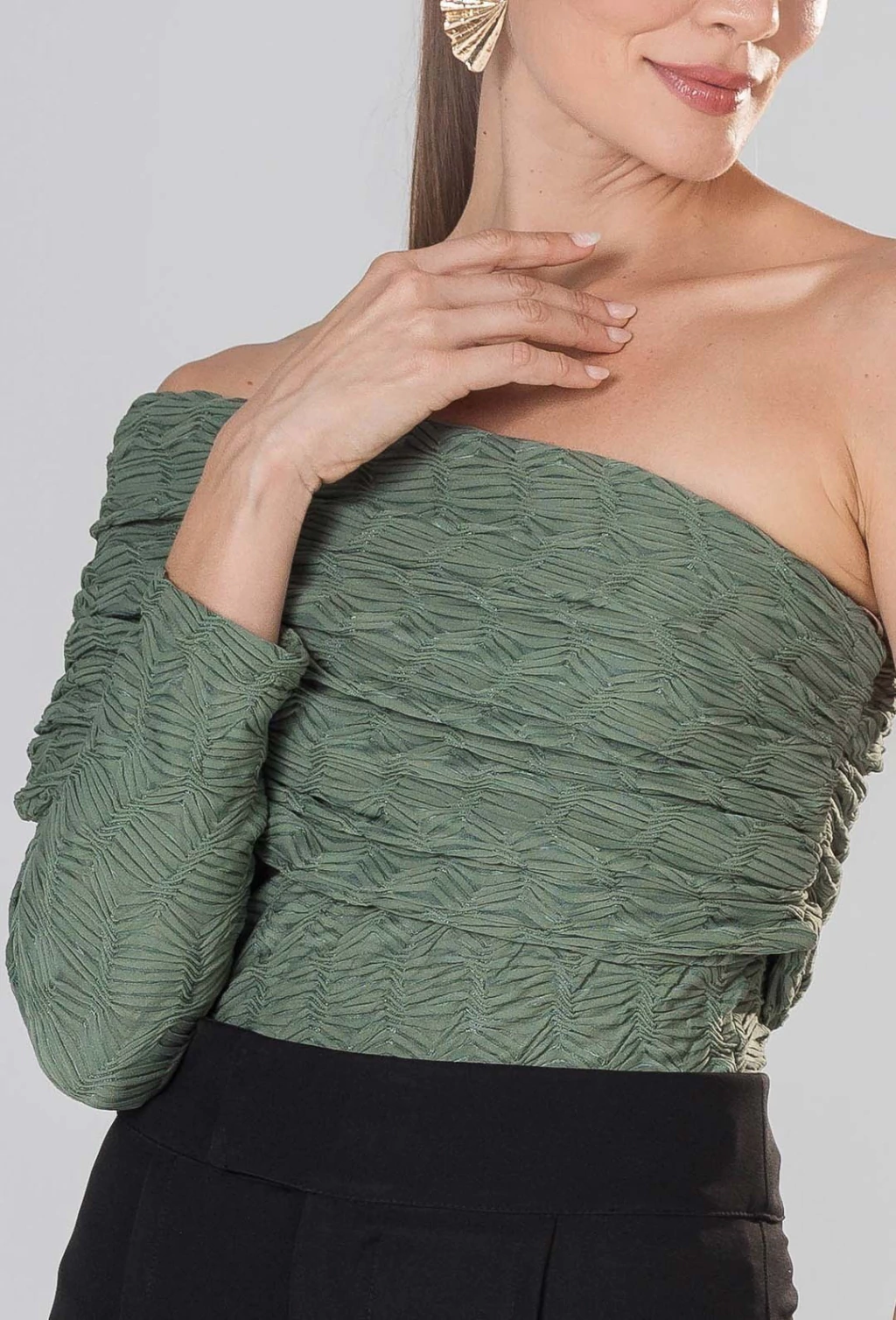 Blusa feminina confeccionada em tecido diferenciado com textura, que agrega sofisticação e um toque moderno à peça. Com modelagem ajustada ao corpo e com uma manga só, valoriza a silhueta de forma elegante, proporcionando um caimento impecável. O destaque fica por conta do detalhe de sobreposição com drapeado, que confere movimento e charme ao visual, criando um efeito visual refinado e atual.