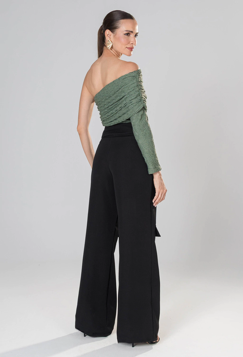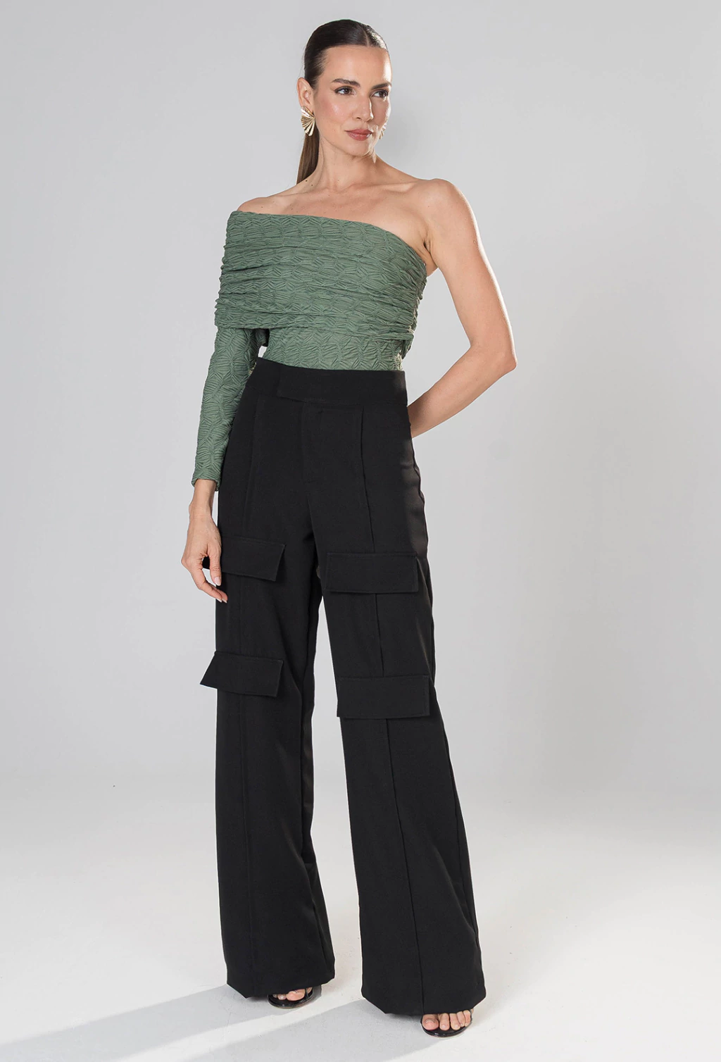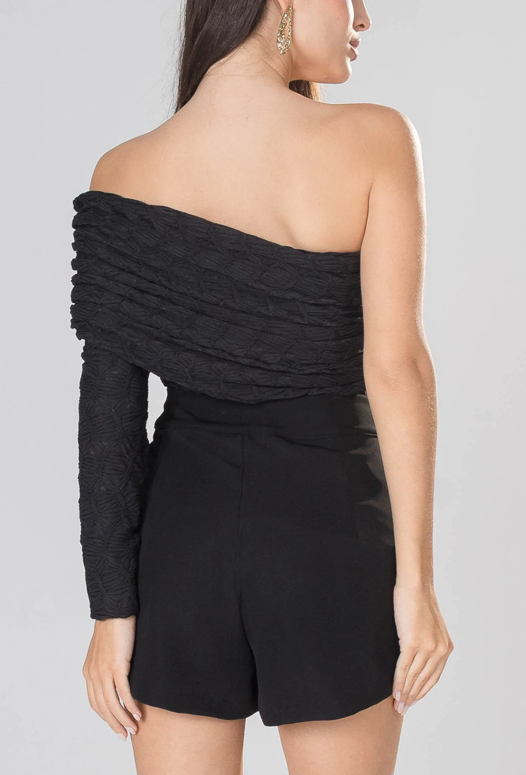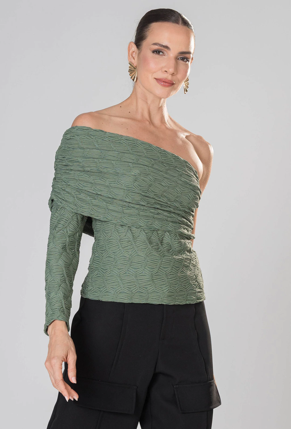CARACTERISTICAS: Blusa com uma manga em tecido texturizado e detalhe de sobreposção drapeada