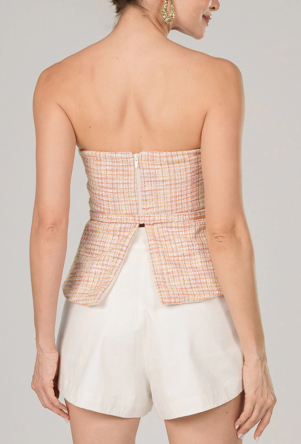Elegante e estruturada, a blusa tomara que caia em tweed é a escolha perfeita para compor looks modernos com um toque clássico. Confeccionada em tweed encorpado, possui um decote diferenciado que valoriza o colo com sofisticação, trazendo um ar contemporâneo à peça. O cinto no mesmo tecido, removível, marca a cintura com delicadeza e permite diferentes formas de uso ¿ com ou sem o acessório, adaptandose à proposta do look.