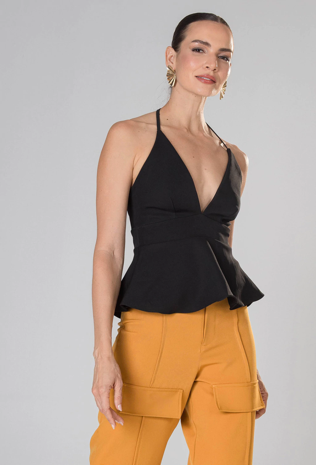 CARACTERISTICAS: Blusa peplum com decote frontal e amarração no pescoço