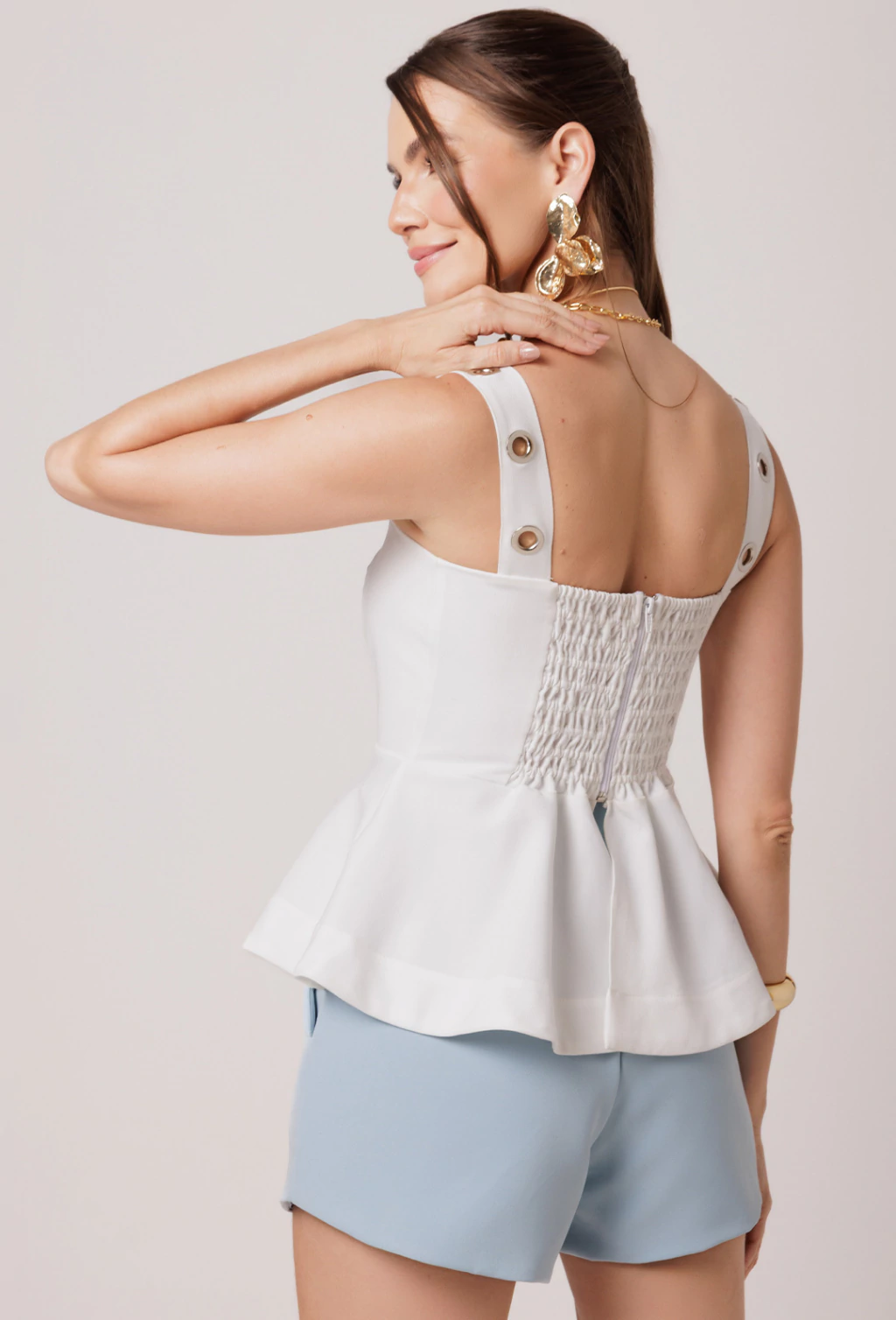 Blusa Confeccionada em Alfaiataria de alta gramatura. A blusa Jeny tem modelagem peplum com decote mais retinho e com recortes. Suas alças são largas e possui aplicação de ilhós deixando a peça ainda mais despojada e estilosa. Seu fechamento é nas costas com zíper destacável com elástico proporcionando mais conforto ao vestir. Uma peça ótima para compor looks despojados e estilosos. Características: Blusa peplum com aplicação de ilhós nas alças.