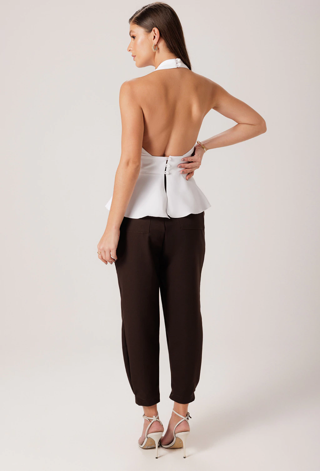 Confeccionado em alfaiataria de alta gramatura, o shape trapézio da Blusa Lena cria uma silhueta sofisticada, que se equilibra belamente com a pala franzida que a une com um peplum levemente godê, criando um efeito um toque de delicadeza e feminilidade, perfeito para complementar um visual refinado e moderno. Ideal para quem busca estilo sem abrir mão do conforto e da elegância em qualquer ocasião.