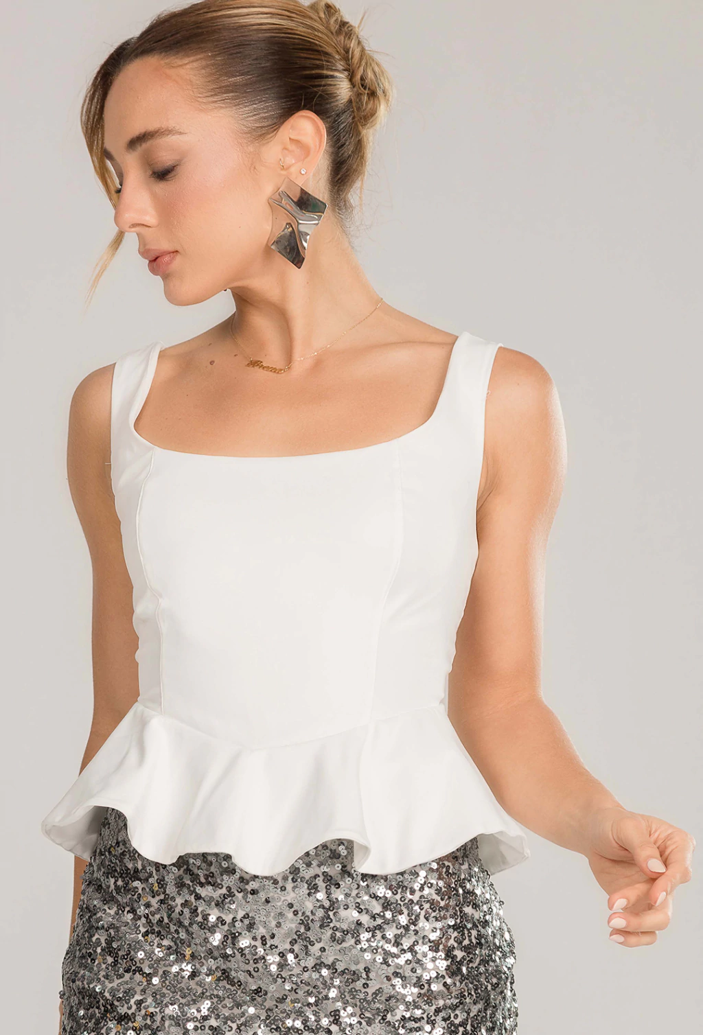 Blusa confeccionada em alfaiataria de toque macio, com decote quadrado elegante e recortes estratégicos no busto, que valorizam a silhueta. Possui peplum na barra, conferindo sofisticação e caimento impecável. Uma peça moderna e estruturada, perfeita para produções formais ou looks elegantes do dia a dia.