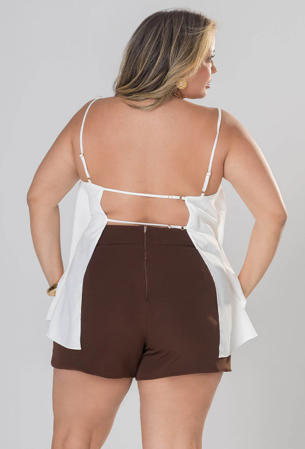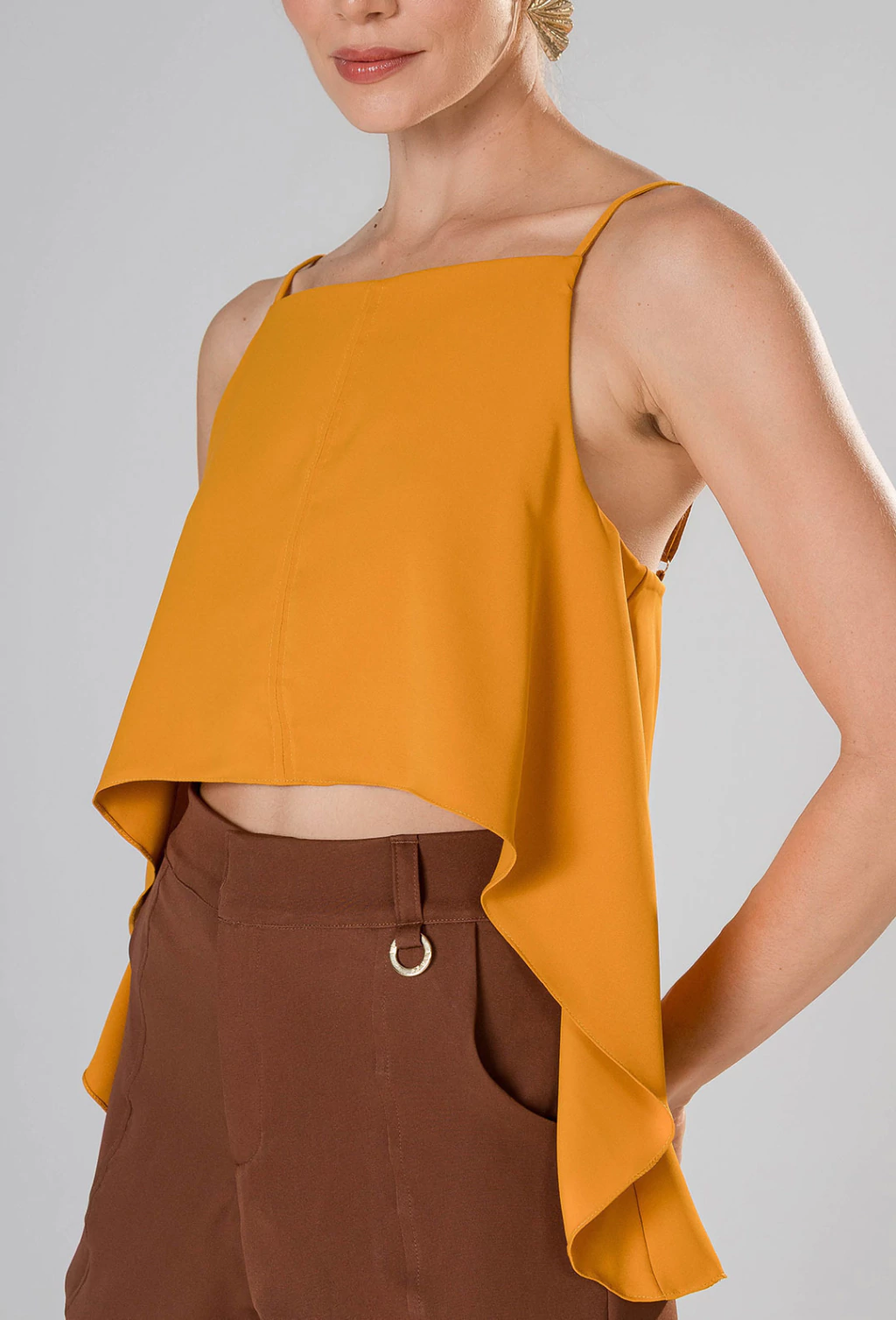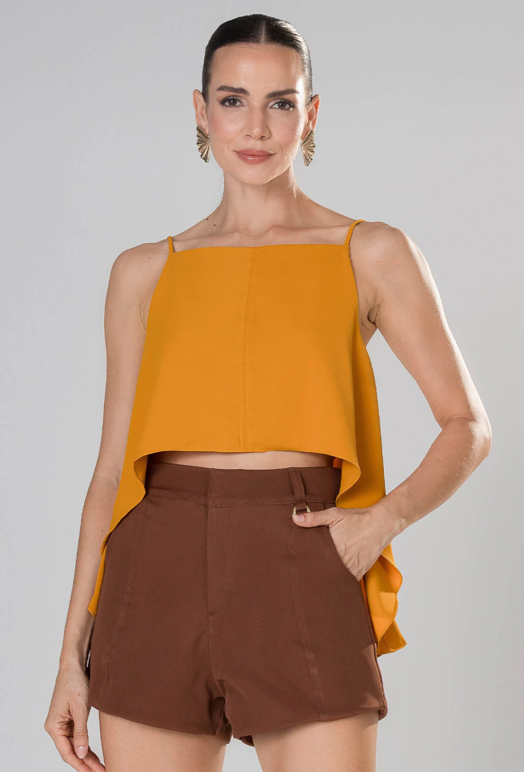 Blusa confeccionada em alfaiataria leve, com caimento fluido e acabamento sofisticado. O design assimétrico apresenta a parte da frente mais curta e a parte de trás alongada, criando um visual moderno e elegante. Nas costas, o destaque fica por conta do decote acentuado, que traz sensualidade na medida certa. A peça conta ainda com duas tiras ajustáveis com regulador, que proporcionam melhor caimento e um toque contemporâneo ao look.