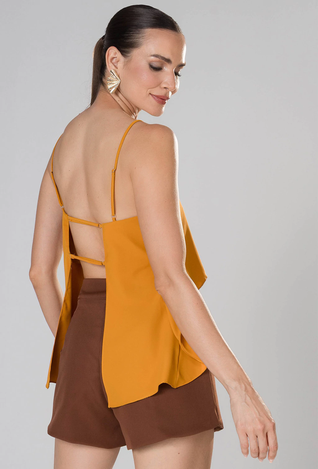 CARACTERISTICAS: Blusa com decote frontal tipo trapézio e decote acentuado nas costas com duas tirinhas com regulador.