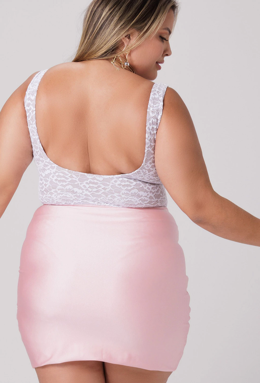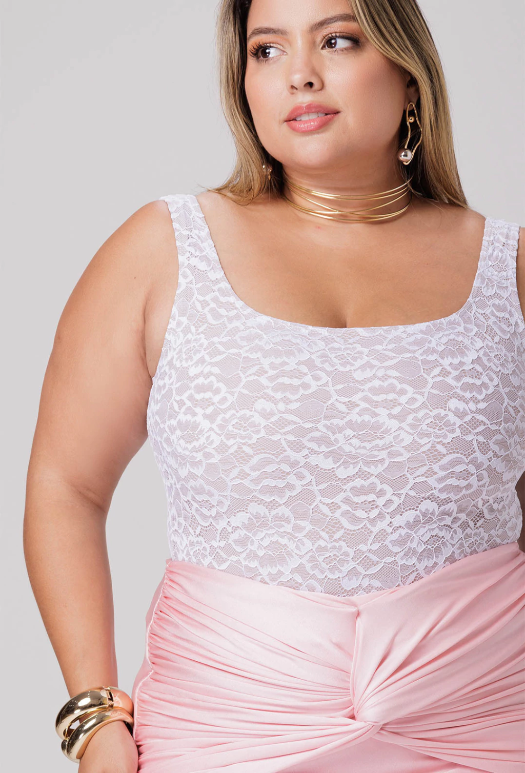 Body confeccionado em renda com forro em malha na cor bege. Possui decote arredondado na frente e nas costas, sendo o das costas mais acentuado. Seu fechamento é no fundilho com dois botões de pressão e forro de algodão. Esta peça é perfeita para ambientes mais descontraídos, para quem busca conforto e elegância em um só look.