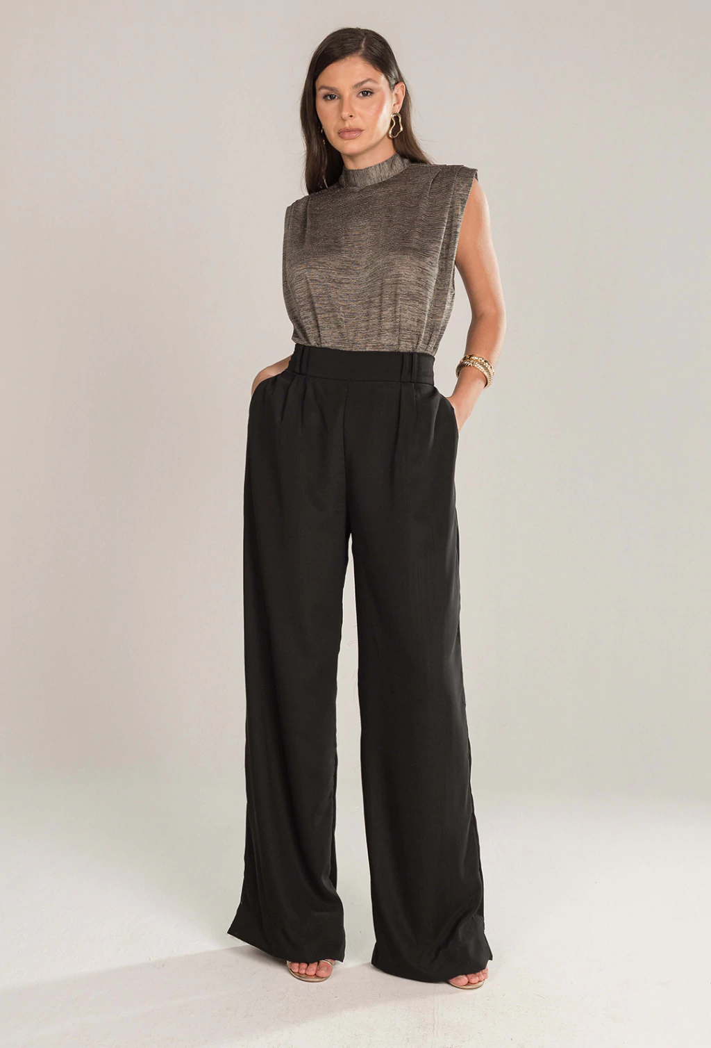 Body confeccionado em malha de lurex, com leve brilho e toque macio. Possui modelagem soltinha, gola alta com fechamento posterior em dois botões encapados e drapeado nos ombros, que acrescenta elegância e sofisticação ao visual. Uma peça versátil e moderna, perfeita para compor produções refinadas com saias ou calças de cintura alta.