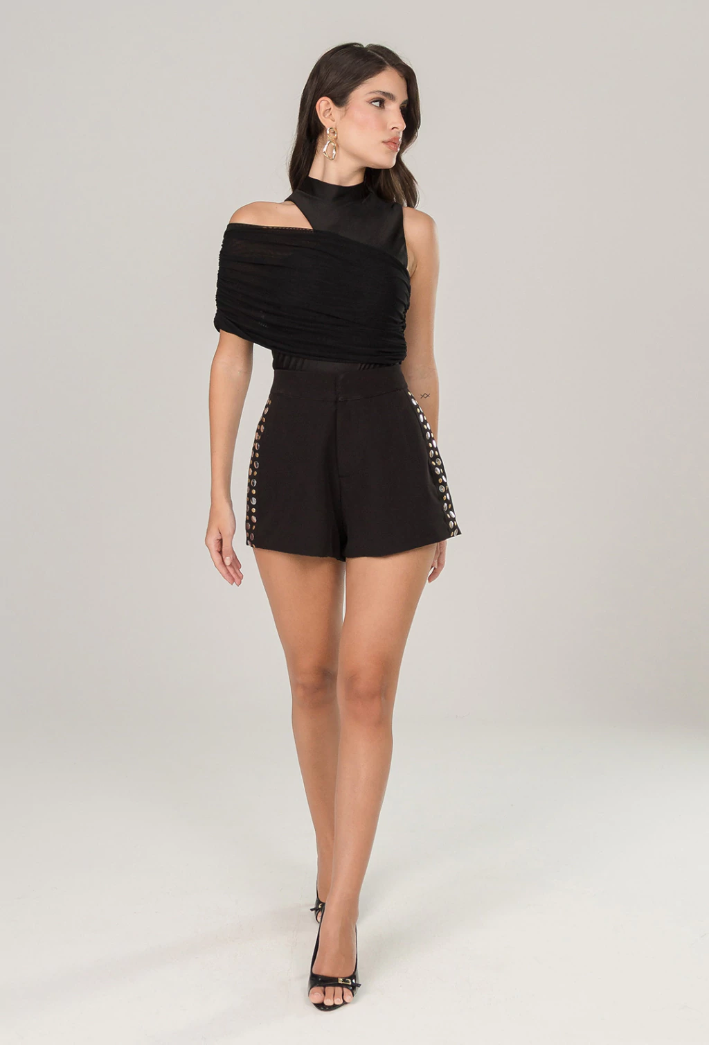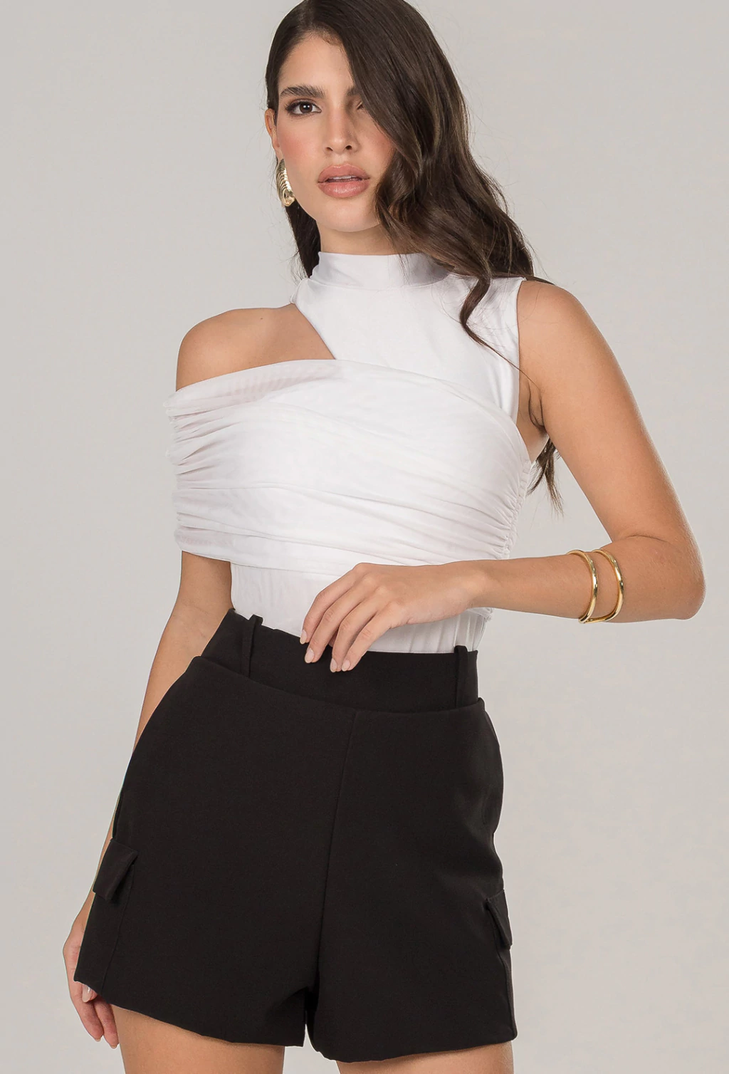 CARACTERISTICAS: Body com transpasse em tule e gola alta