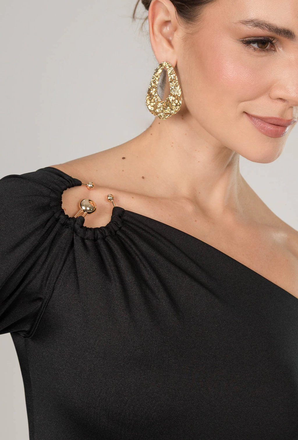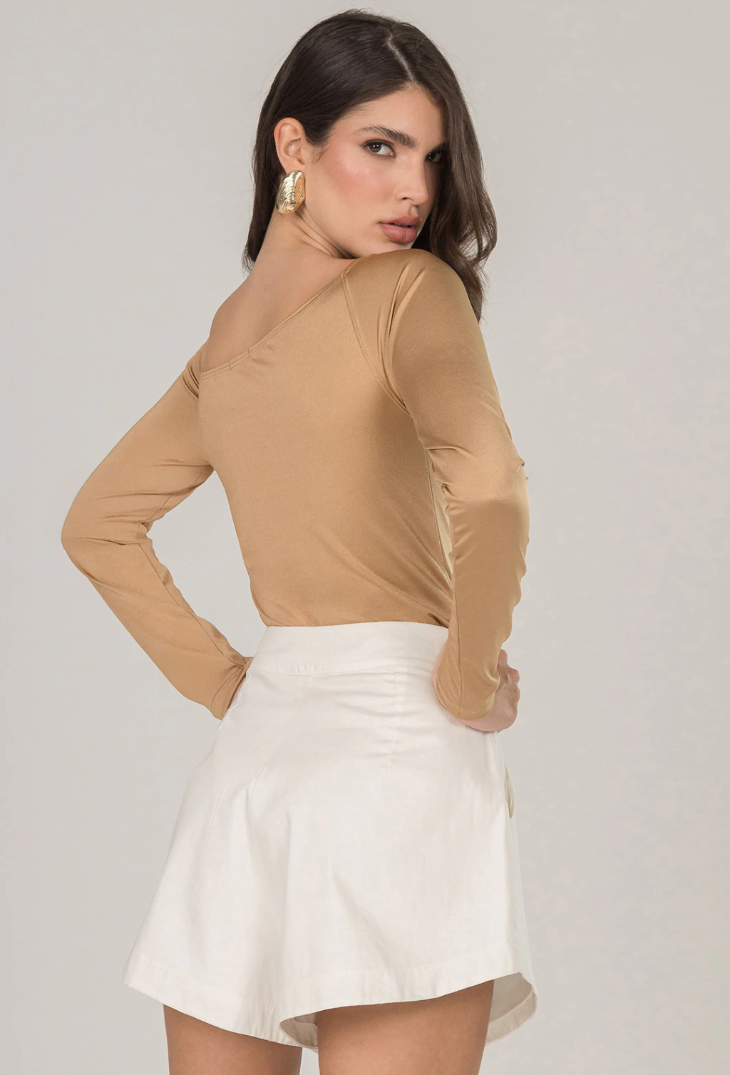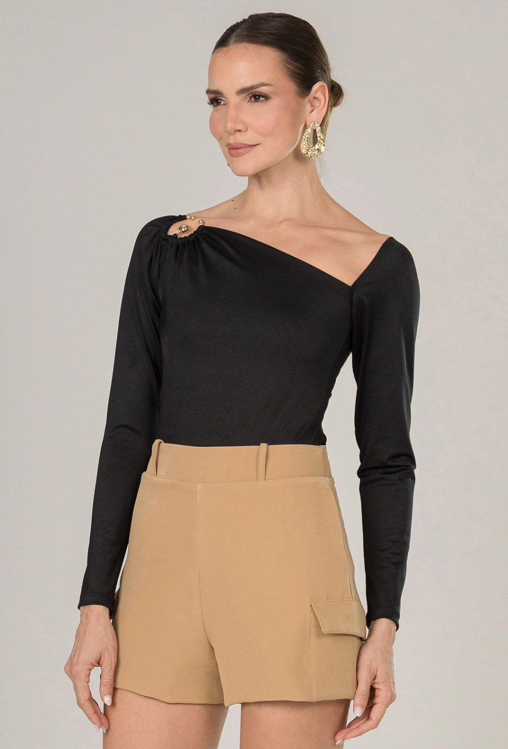Body confeccionado em malha satinada. Sua modelagem é ajustada ao corpo com manga longa e um recorte no ombro. Seu charme está na meia argola no ombro que valoriza muito os ombros. Seu fechamento é em dois botões de pressão e o forro é 100% algodão.