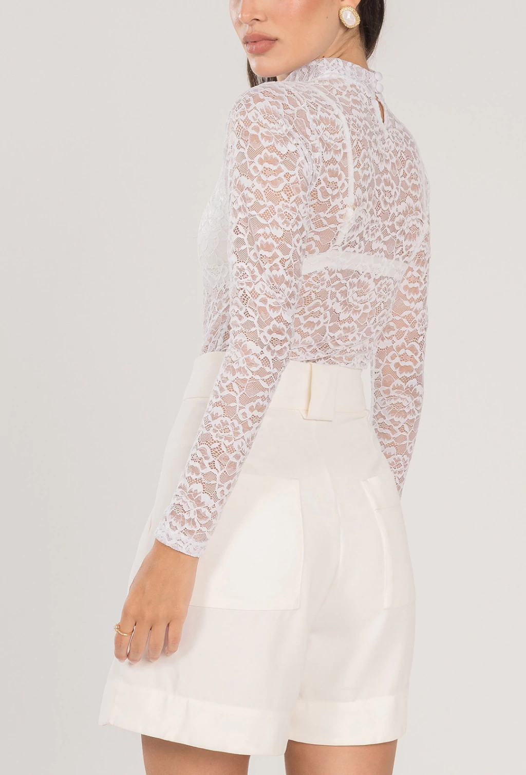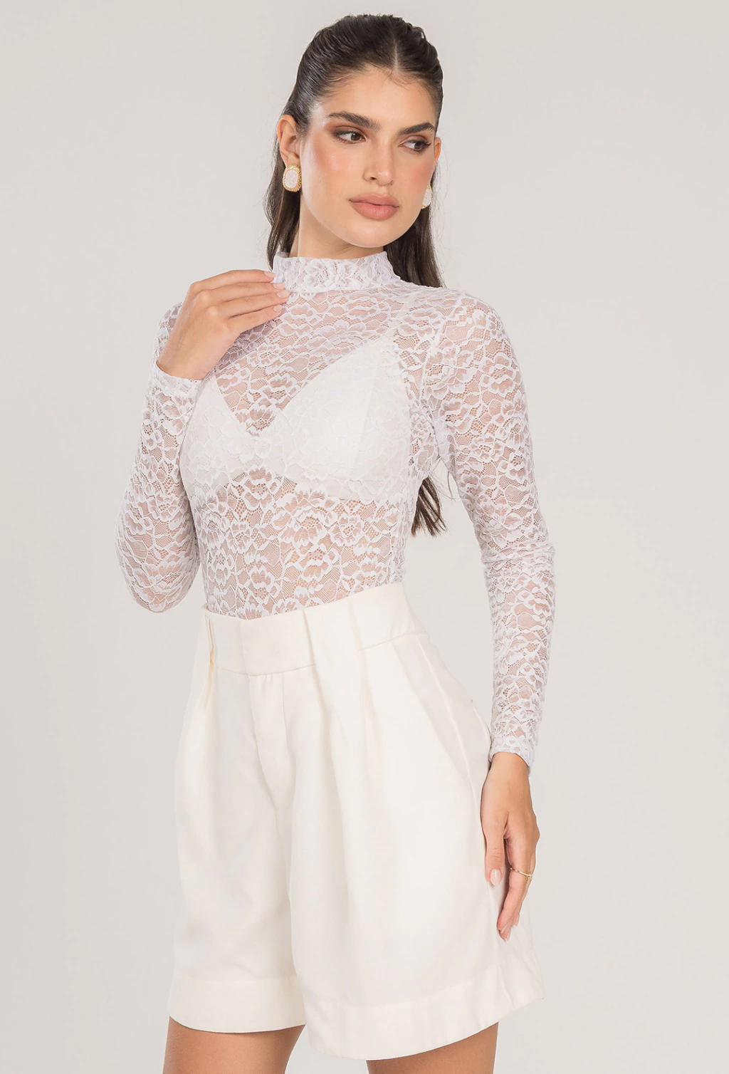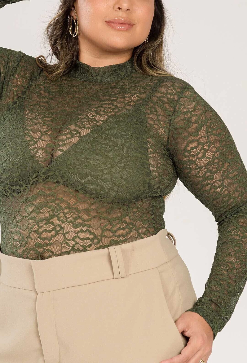 Confeccionado inteiramente em renda delicada, o body Geisy possui transparência sutil que traz sensualidade e elegância na medida certa. A peça possui gola alta, que confere um ar refinado e alonga a silhueta, além de mangas longas, que equilibram a proposta ousada da renda com um toque de sofisticação. A modelagem ajustada ao corpo valoriza as curvas com conforto, enquanto o acabamento em renda realça os detalhes florais e o trabalho minucioso do tecido. Possui fechamento inferior com botão de pressão para maior praticidade no uso. Ideal para composições noturnas, produções fashionistas ou como peçachave em sobreposições com blazers, tops ou peças em alfaiataria.