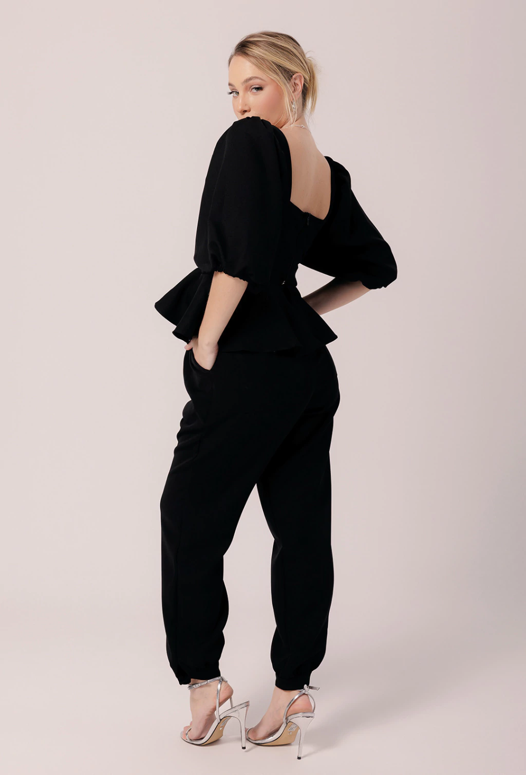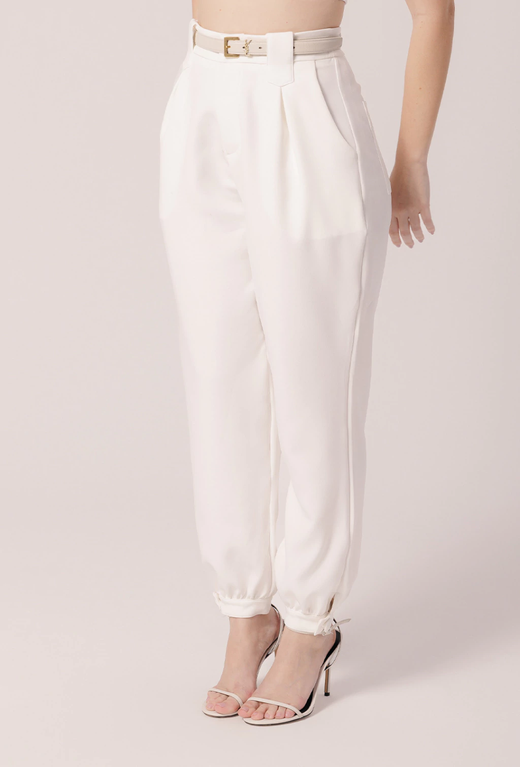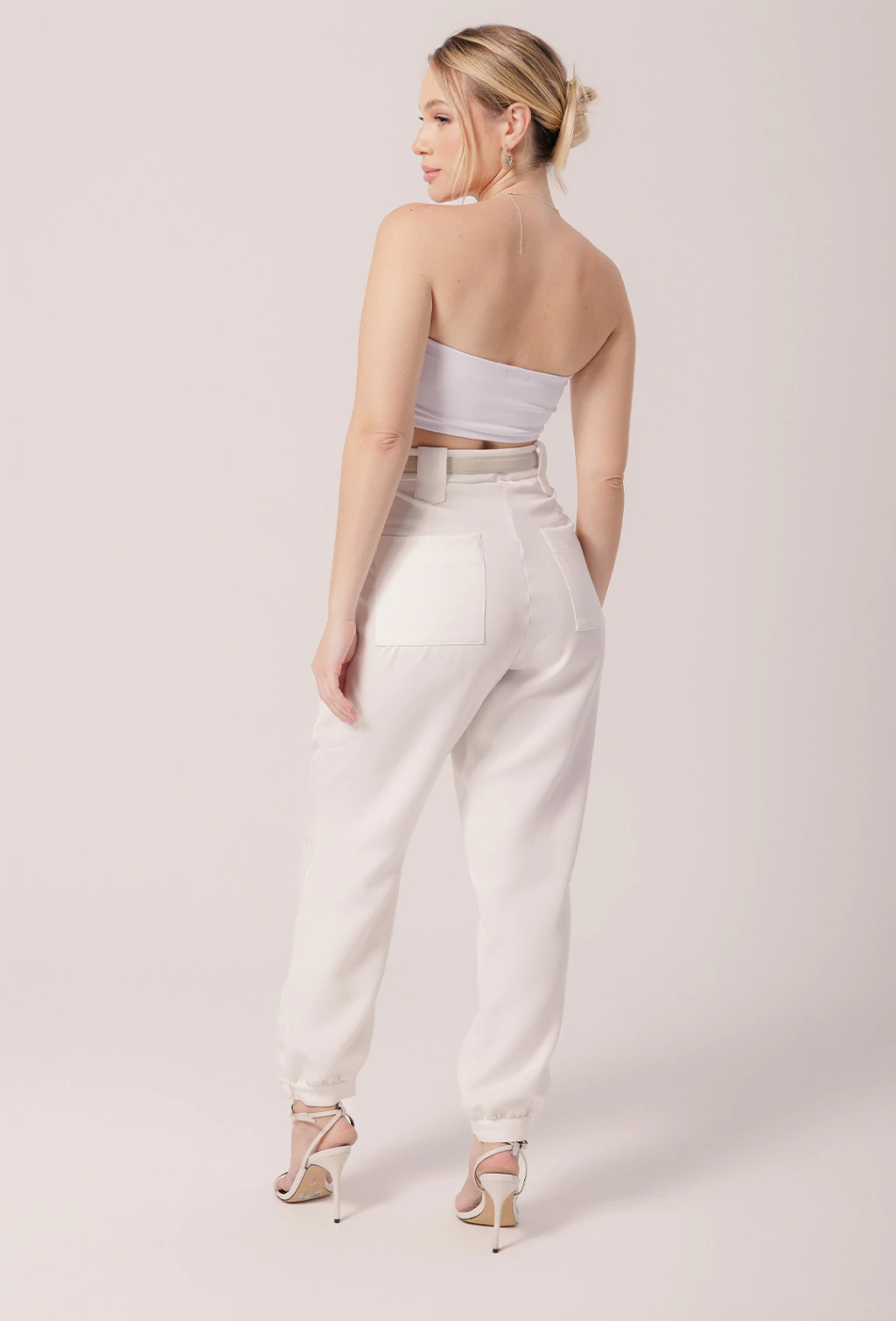 Confeccionado em alfaiataria de alta gramatura, a calça Glenda é uma peça sofisticada e versátil, possui modelagem estilo cenoura que valoriza bem o quadril e seu cós possui passantes largos que dão um charme especial à peça, com braguilha na frente e colchetes para fechamento. Possui barra franzida com fechamento por botão e bolsos traseiros perfeitos para o uso do dia a dia.