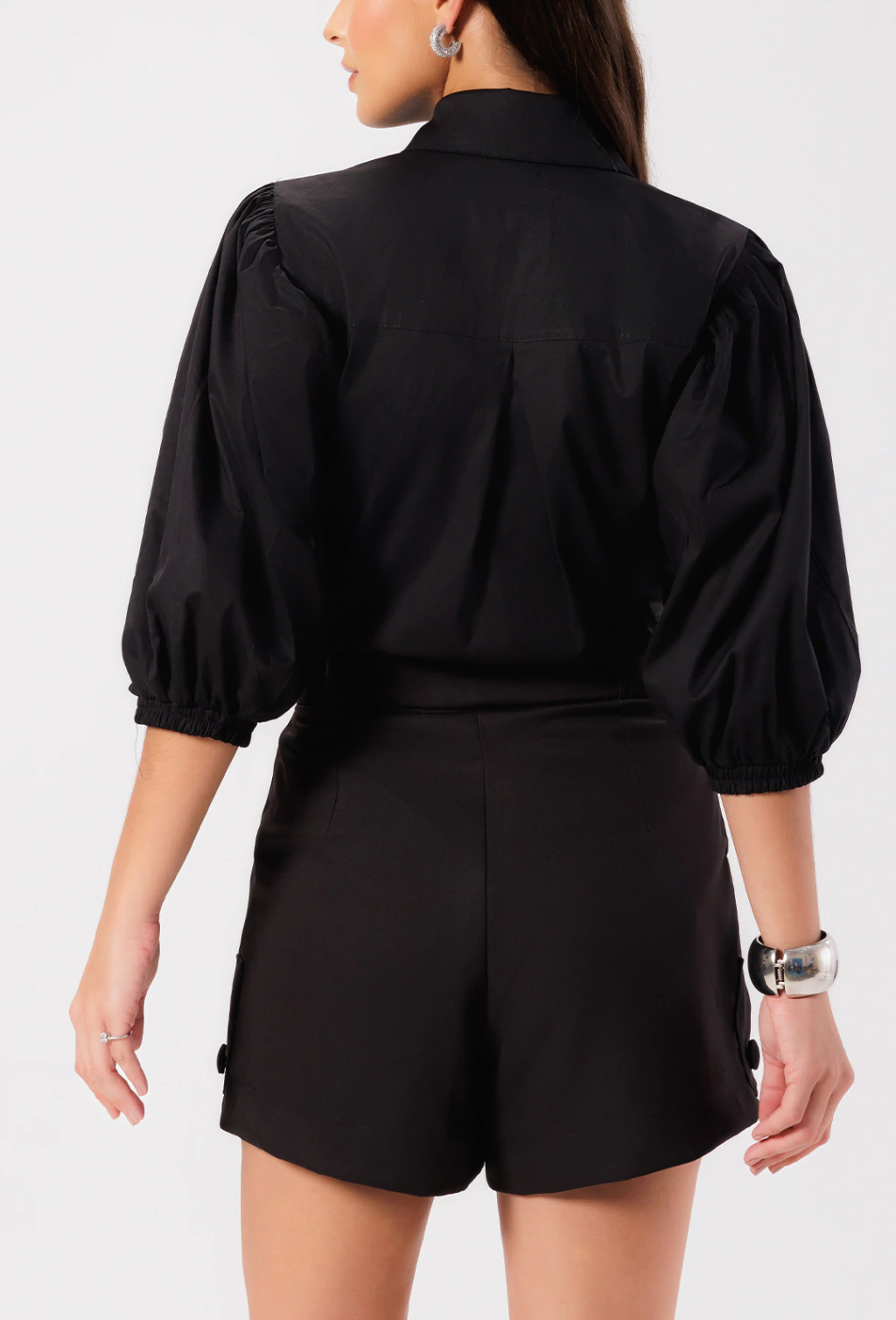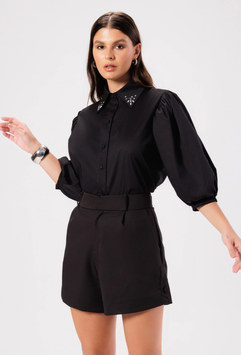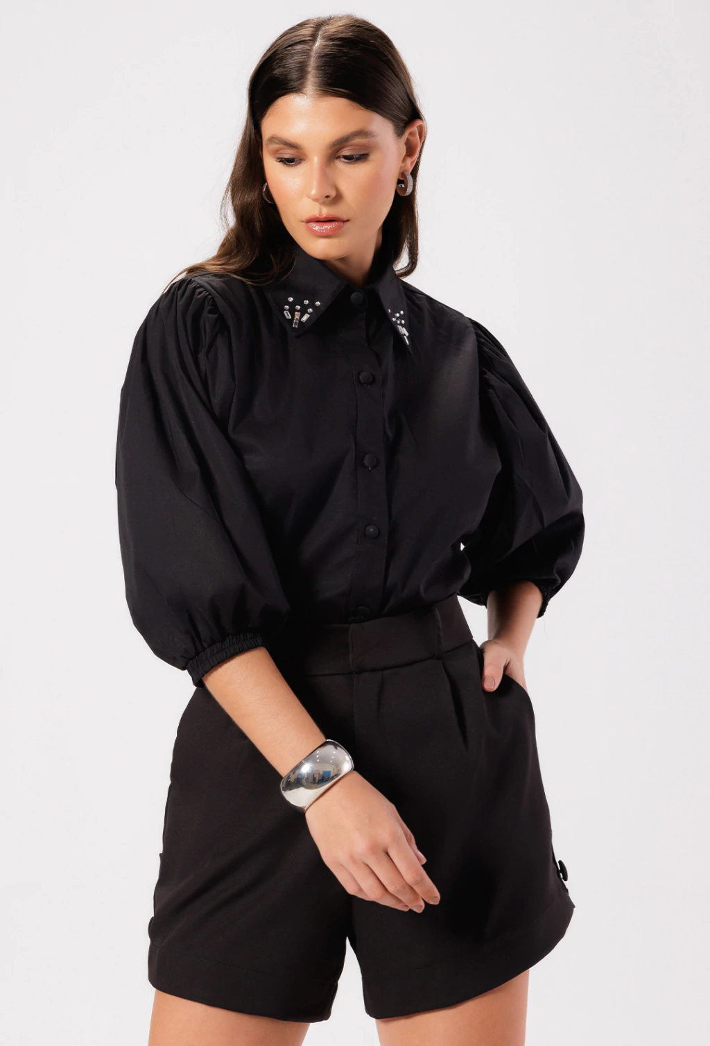 Confeccionado em Tricoline, a camisa Brenda é uma peça versátil e adaptável que se destaca por sua capacidade de ser usada de diversas maneiras. Desde uma sobreposição até um estilo formal completamente abotoado, ou casualmente meio aberto. Sua modelagem ampla e caimento soltinho combinam perfeitamente com as mangas bufantes 3/4, conferindo elegância e modernidade ao visual. Com fechamento frontal por botões, tapeta e gola colarinho, esta peça apresenta um toque especial: um detalhe em strass prateado na ponta da gola, adicionando um charme sofisticado e singular.