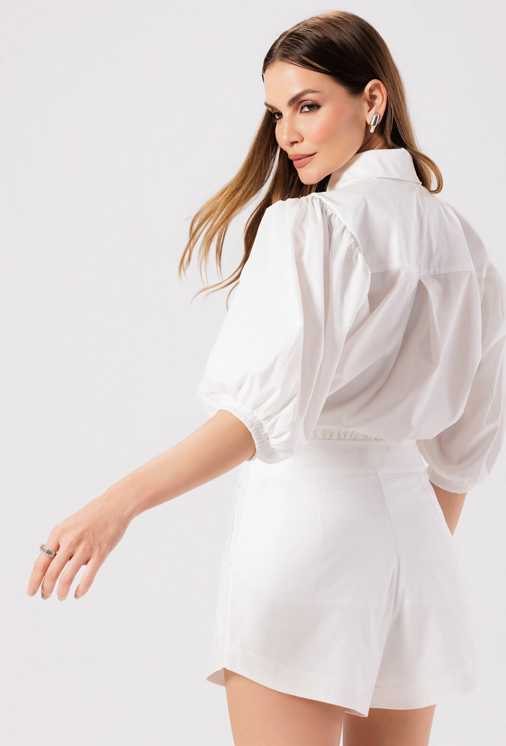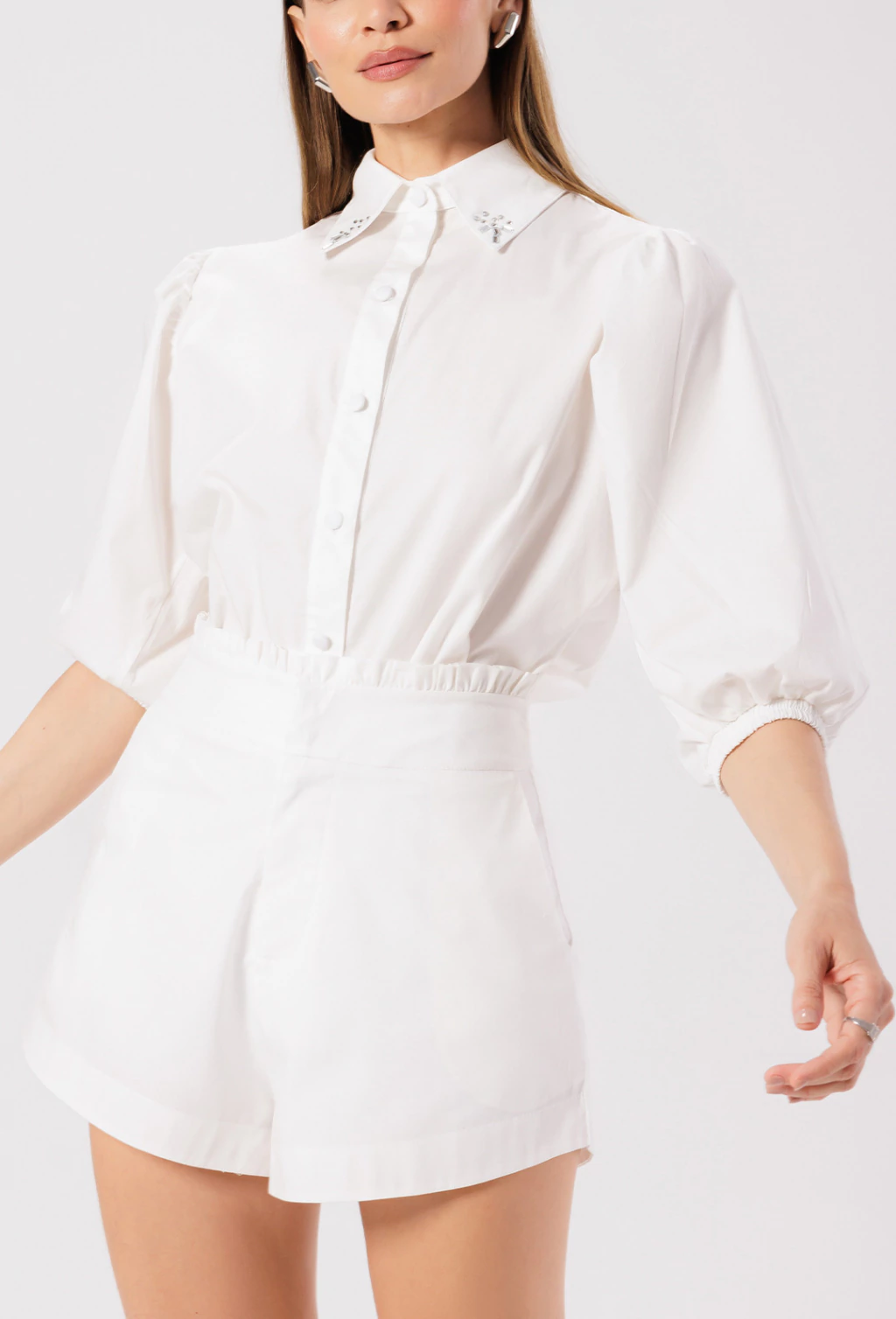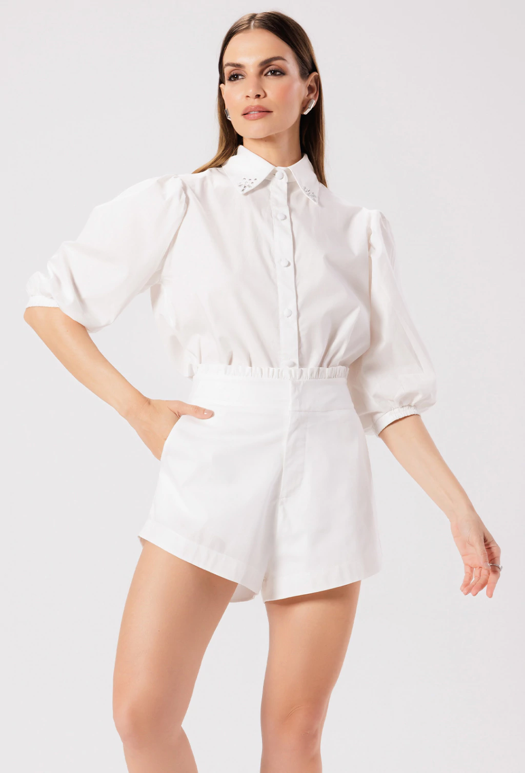 Confeccionado em Tricoline, a camisa Brenda é uma peça versátil e adaptável que se destaca por sua capacidade de ser usada de diversas maneiras. Desde uma sobreposição até um estilo formal completamente abotoado, ou casualmente meio aberto. Sua modelagem ampla e caimento soltinho combinam perfeitamente com as mangas bufantes 3/4, conferindo elegância e modernidade ao visual. Com fechamento frontal por botões, tapeta e gola colarinho, esta peça apresenta um toque especial: um detalhe em strass prateado na ponta da gola, adicionando um charme sofisticado e singular.