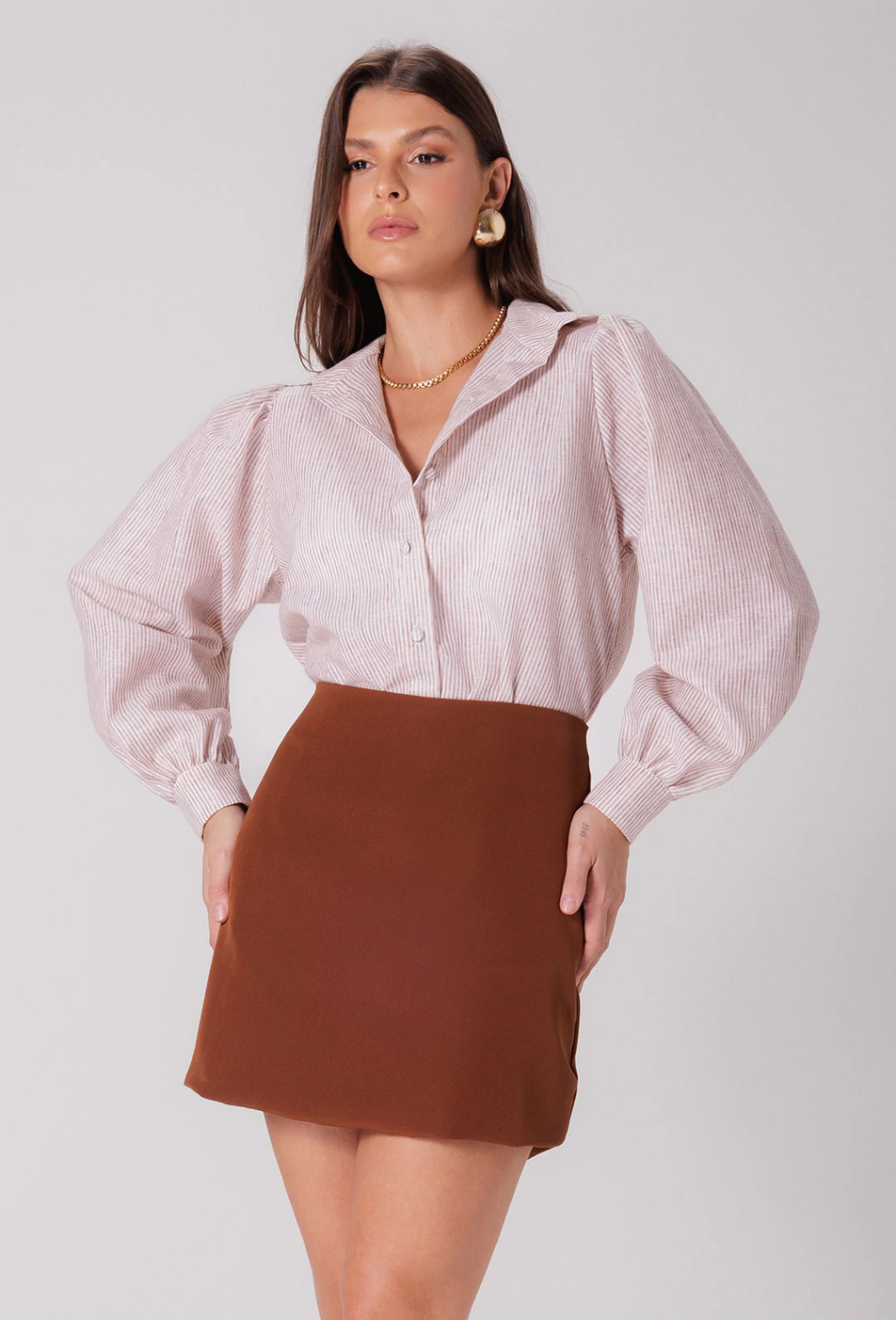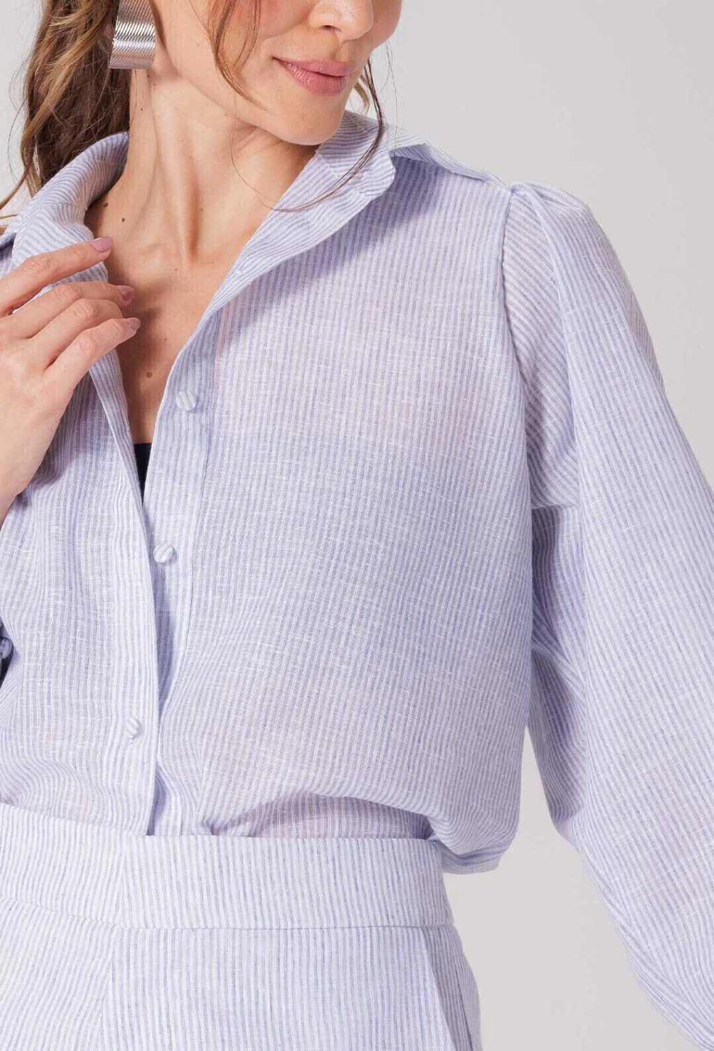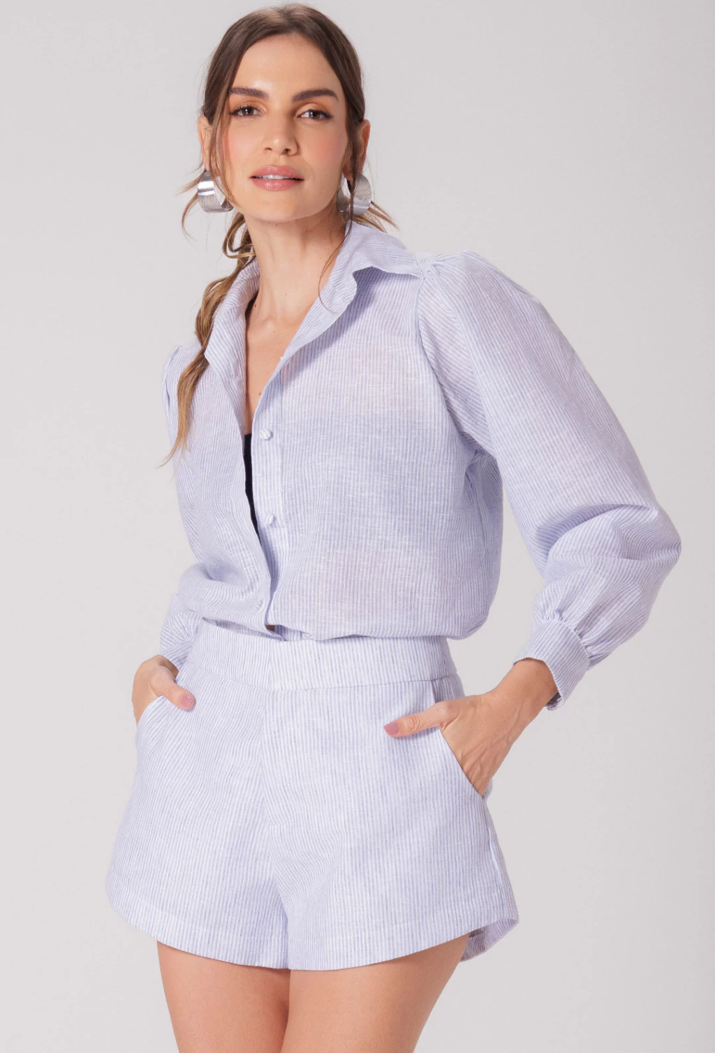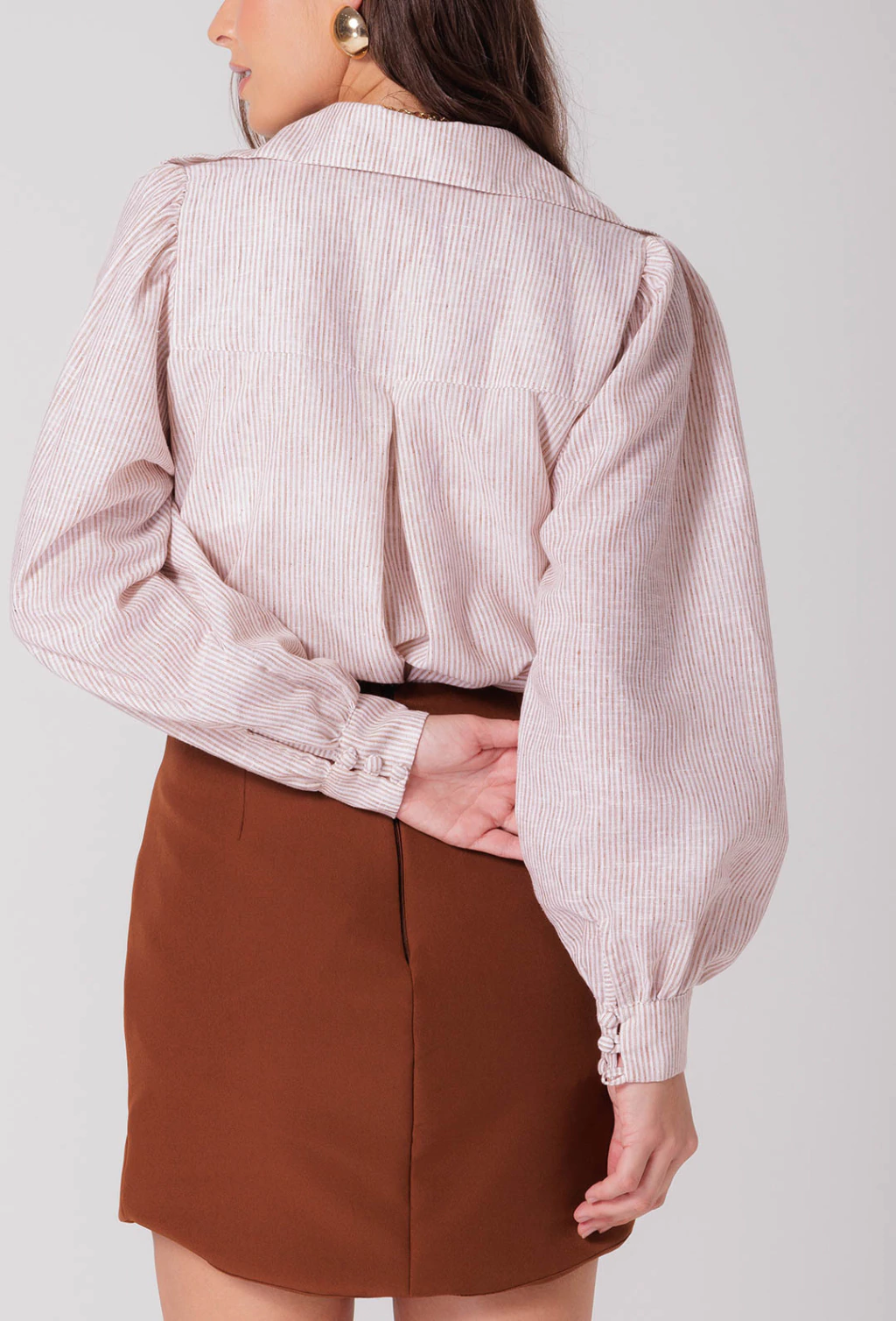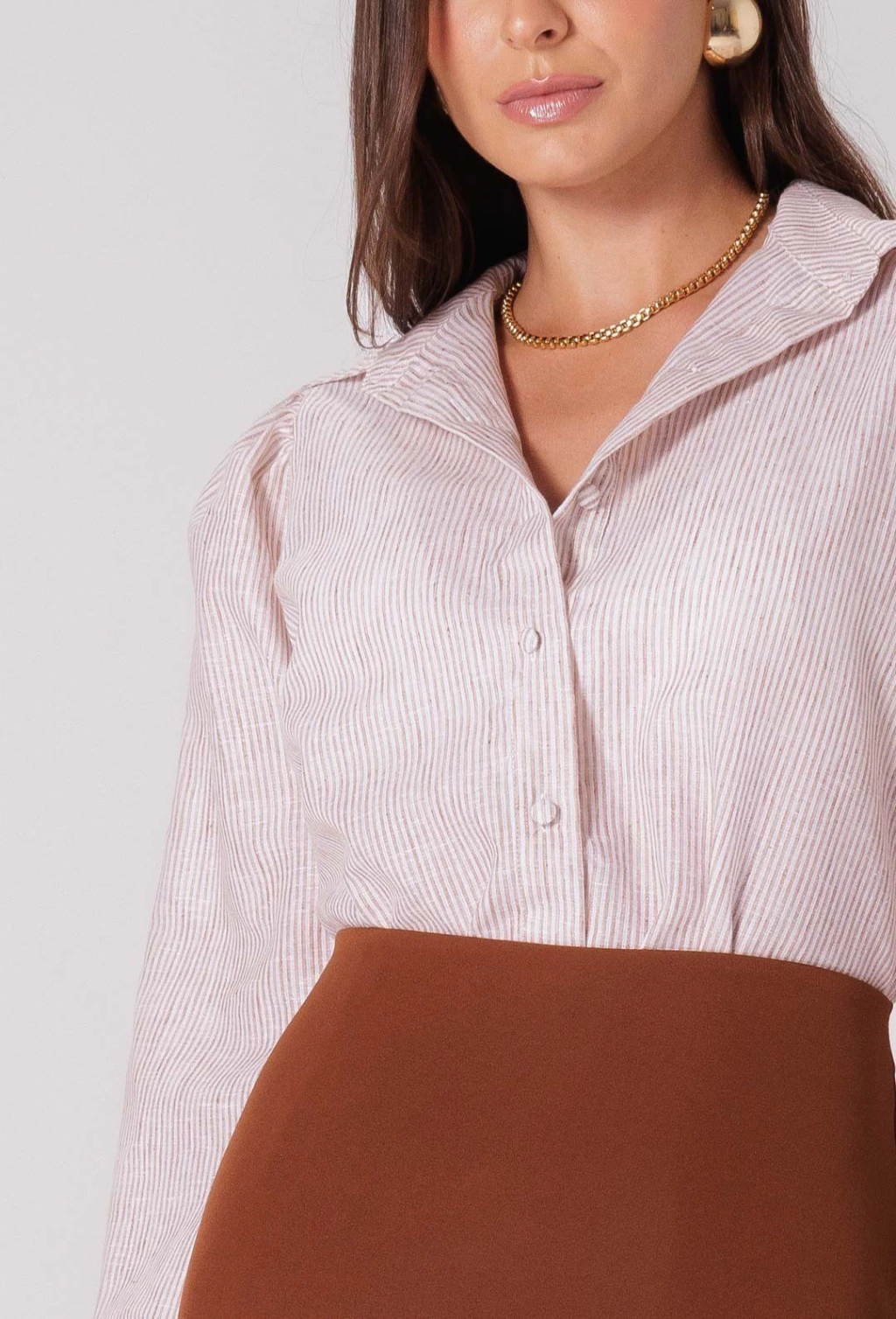 Confeccionada em alfaiataria de algodão listrada, a Camisa Ester é o toque de elegância descomplicada que você precisava. Possui uma modelagem levemente soltinha no corpo, mangas longas bufantes e volumosas com punho largo ajustado - um verdadeiro clássico ¿must have¿ no armário de toda mulher. Pode ser usada de diversas formas: como sobreposição, usando-a aberta numa pegada mais casual ou toda abotoada, num estilo mais clássico e formal. A peça também traz fechamento com botões na frente cobertos por uma tapeta dupla e gola com colarinho.