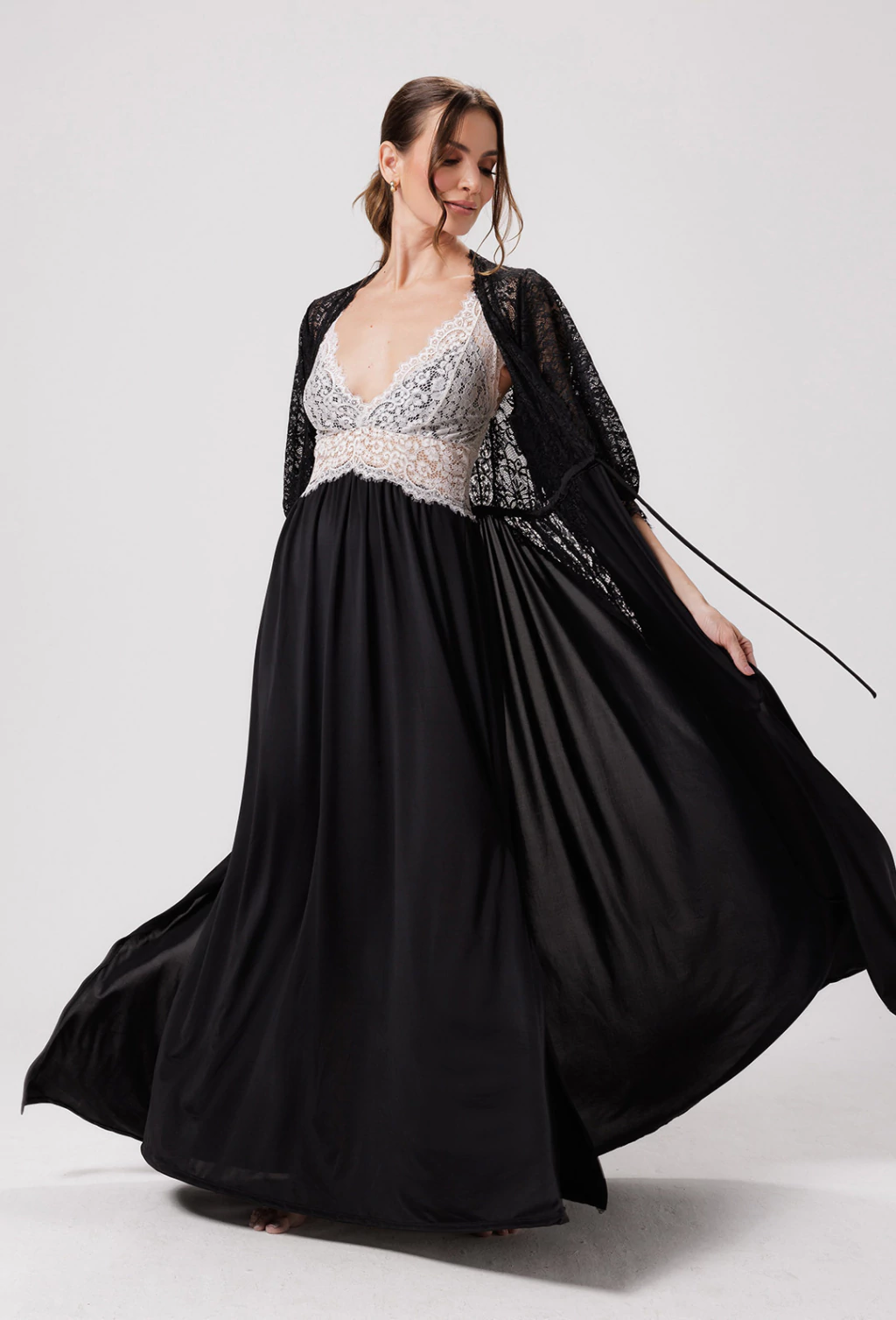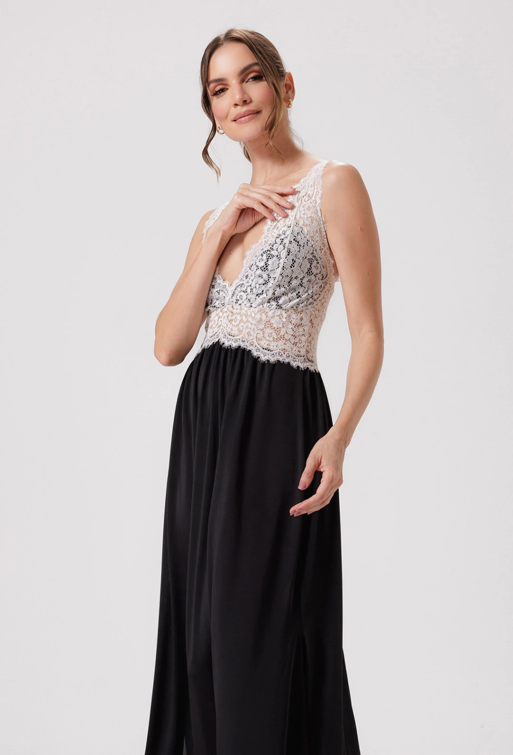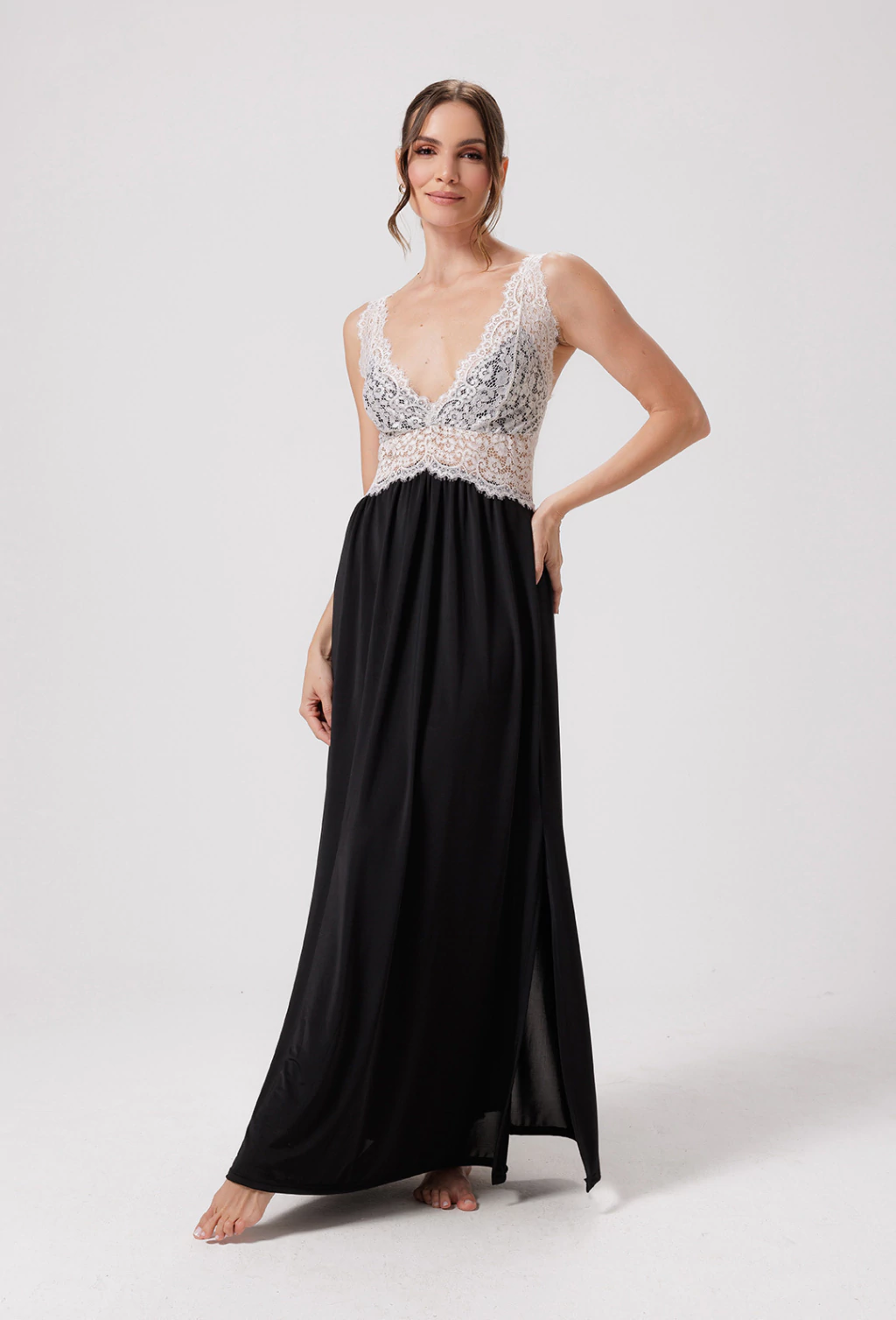 Confeccionado em microfibra premium e renda, a camisola Clara oferece sensualidade e elegância com muito conforto. Essa peça possui modelagem soltinha, comprimento longo com fendas laterais e decote em ¿v¿ na frente com pala em renda vazada na cintura. Suas costas possuem detalhes em renda com alças finas ajustáveis e as fendas laterais também são emolduradas com os matames da renda.
