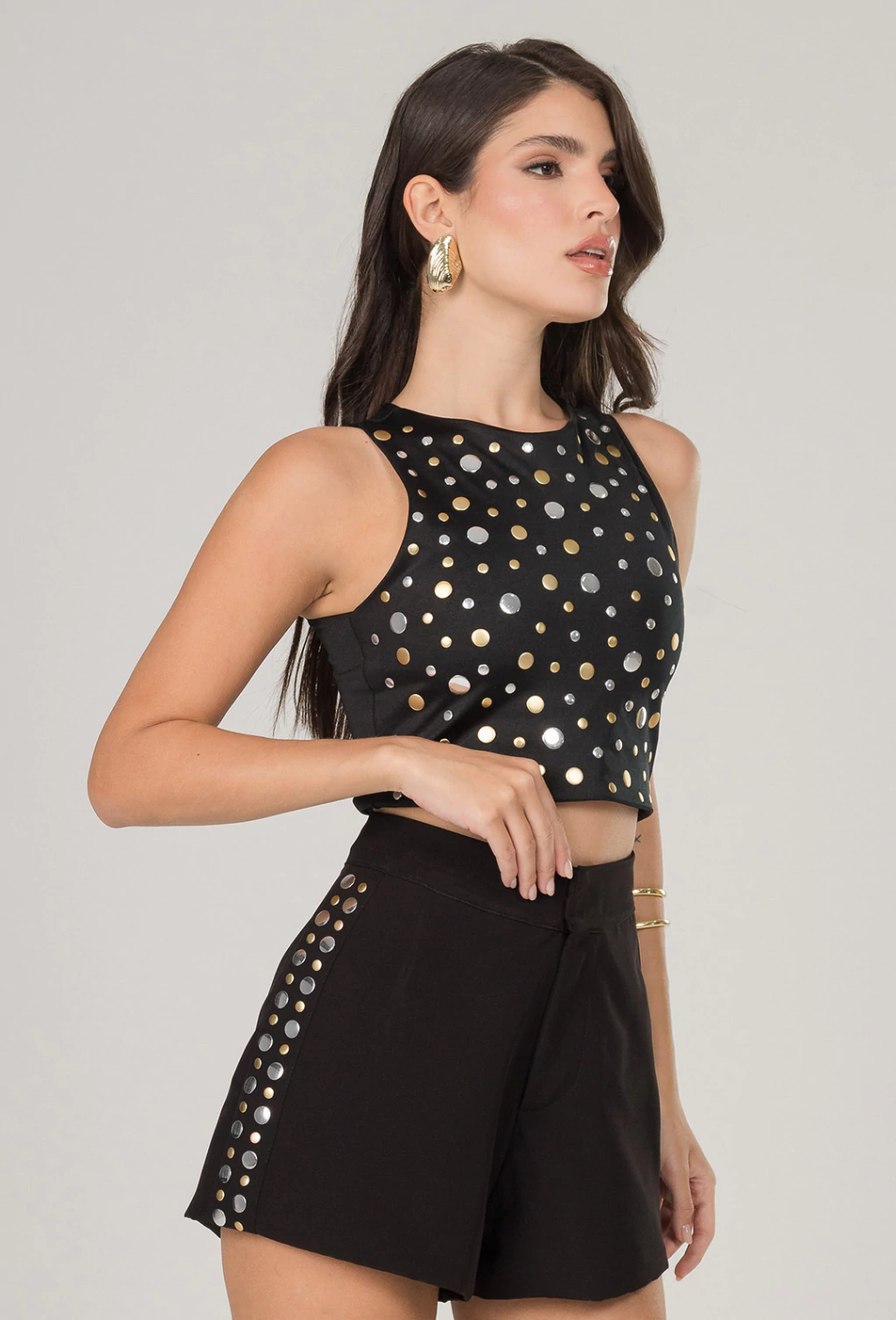 Cropped confeccionado em malha satinada, que proporciona brilho acetinado e toque macio, conferindo um visual elegante e sofisticado. A peça possui aplicação de termocolante por toda a extensão, criando um efeito reluzente e moderno, ideal para compor looks noturnos ou produções mais ousadas. O caimento ajustado valoriza a silhueta, enquanto o acabamento elástico garante conforto e flexibilidade. Pode ser usado tanto sozinho quanto como sobreposição, compondo estilos que vão do fashion ao glam.