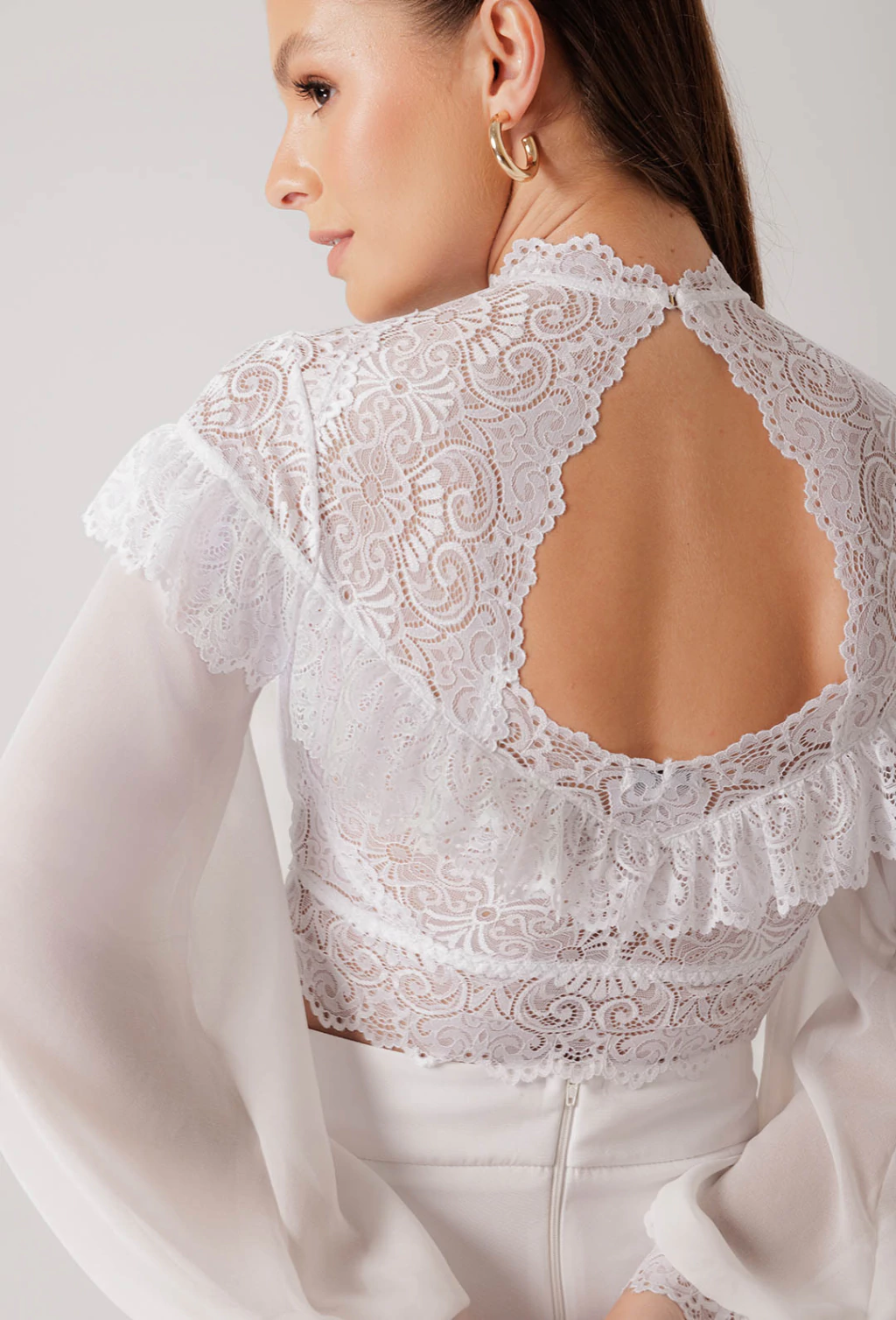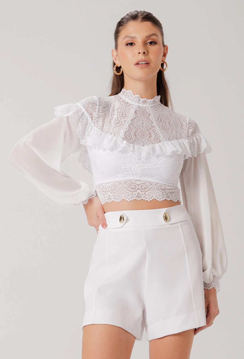 Confeccionado em renda com busto forrado em microfibra comfort e mangas em crepe. O cropped Eleanora é uma peça rica em detalhes que traz muito romantismo e delicadeza à produção. O colo traz a renda vazada com babado em matame de renda contornando toda a peça. As mangas são em crepe, levemente bufantes com punho em matame de renda. As costas trazem um decote discreto e a gola alta possui abertura atrás do pescoço. Uma peça rica em detalhes, ideal para ser a peça chave para elevar a sofisticação do seu visual.