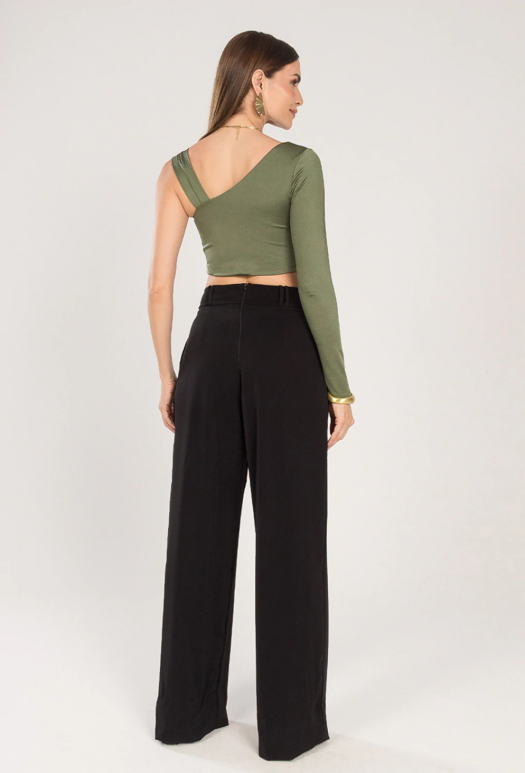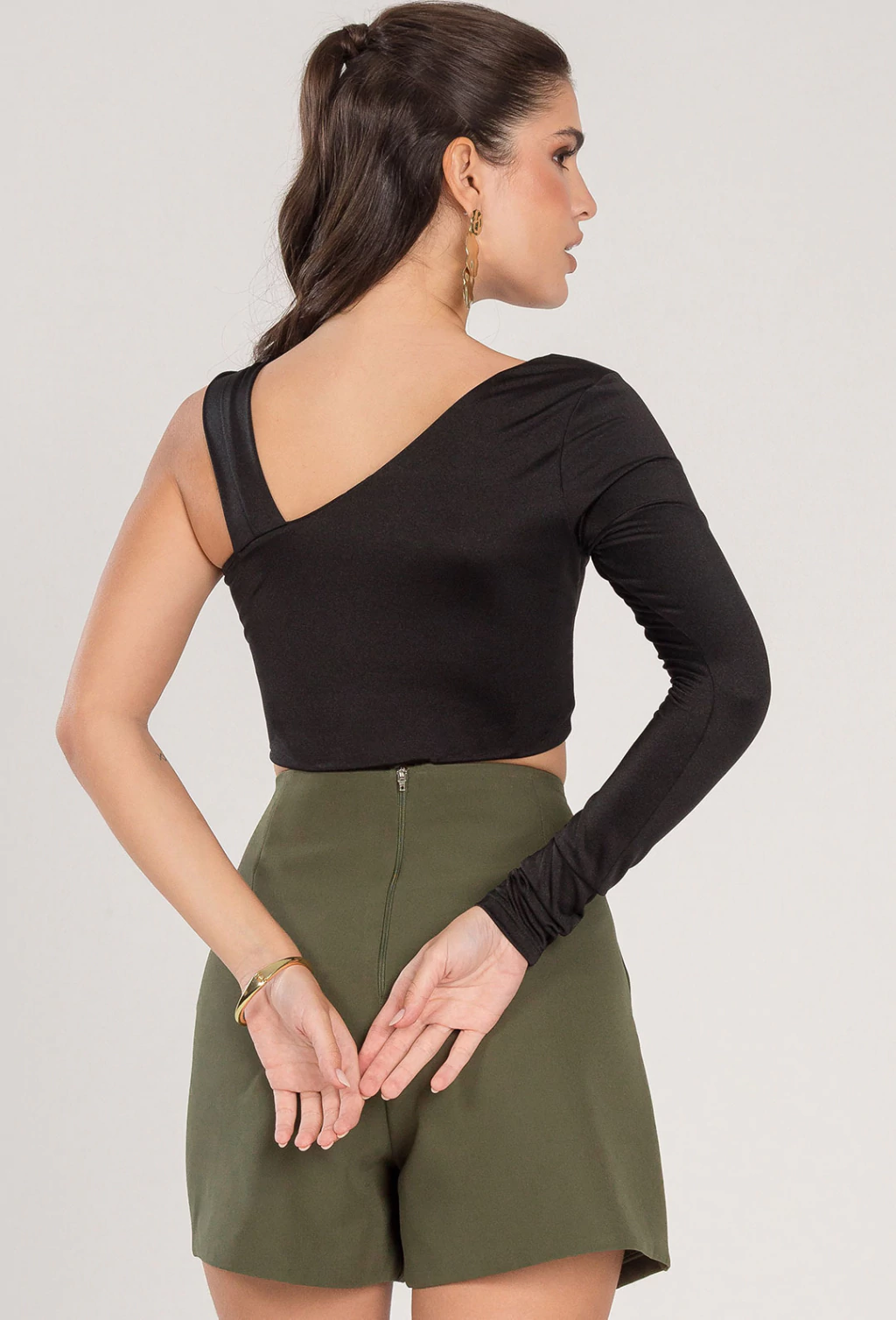 Cropped confeccionado em malha satinada, o cropped Ester possui toquesedoso e caimento elegante, ideal para composições modernas e sofisticadas. O design assimétrico é o destaque da peça: de um lado, uma manga longa que confere sofisticação e do outro, uma alça dupla entrelaçada, criando um contraste ousado e contemporâneo. No centro do busto, um detalhe franzido cria drapeados sutis, que desenham a silhueta e proporcionam um efeito visual elegante e feminino. CARACTERISTICAS: Cropped assimétrico com drapeado no busto