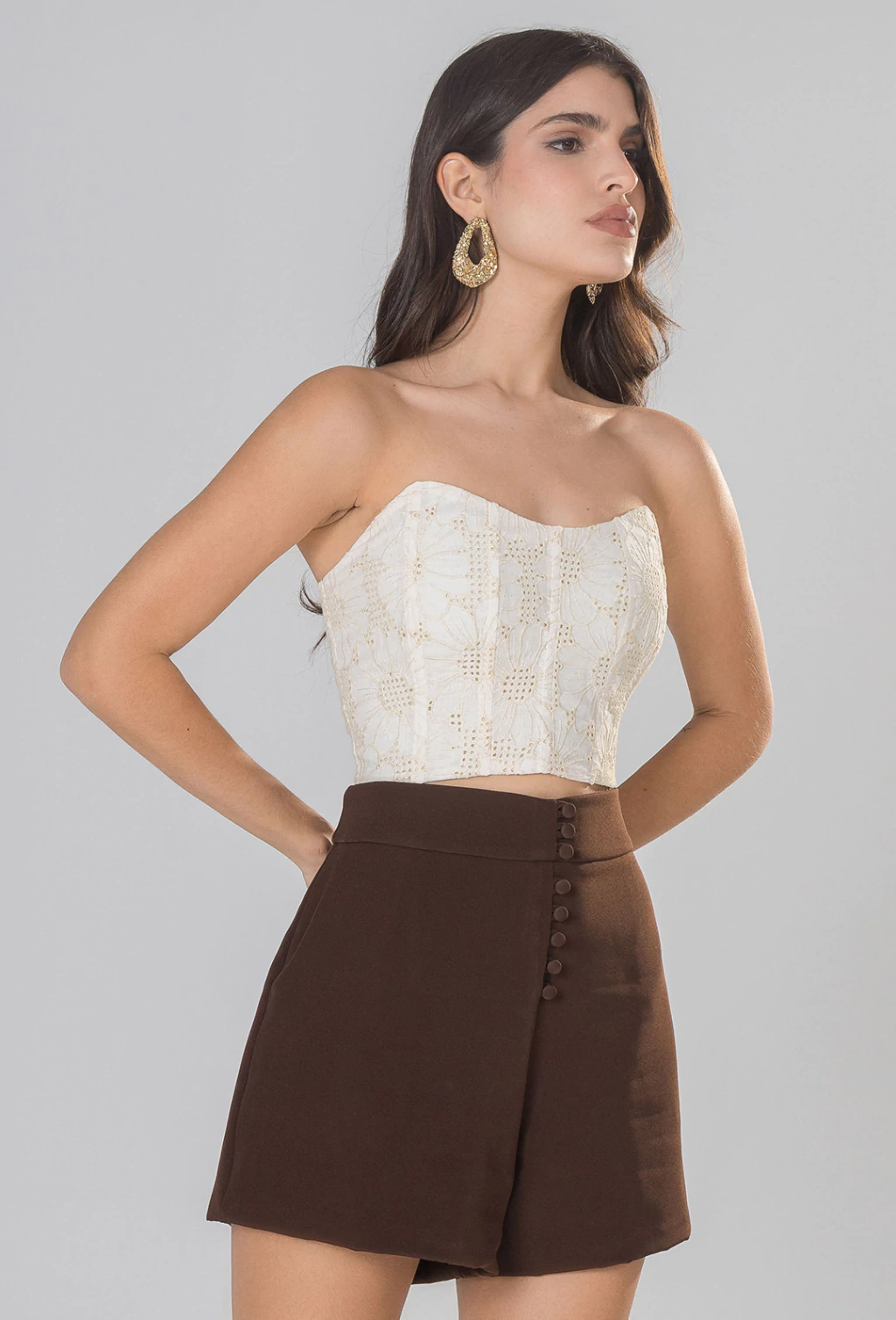 Cropped confeccionado em laise, com toque leve e visual delicadamente trabalhado. A peça traz modelagem tipo corselet, que valoriza a silhueta com estrutura e charme. Para maior conforto, possui elástico embutido, que se adapta ao corpo sem perder o caimento. O fechamento em zíper destacável nas costas confere praticidade e um toque moderno ao design. Ideal para composições femininas com um ar romântico e atual.