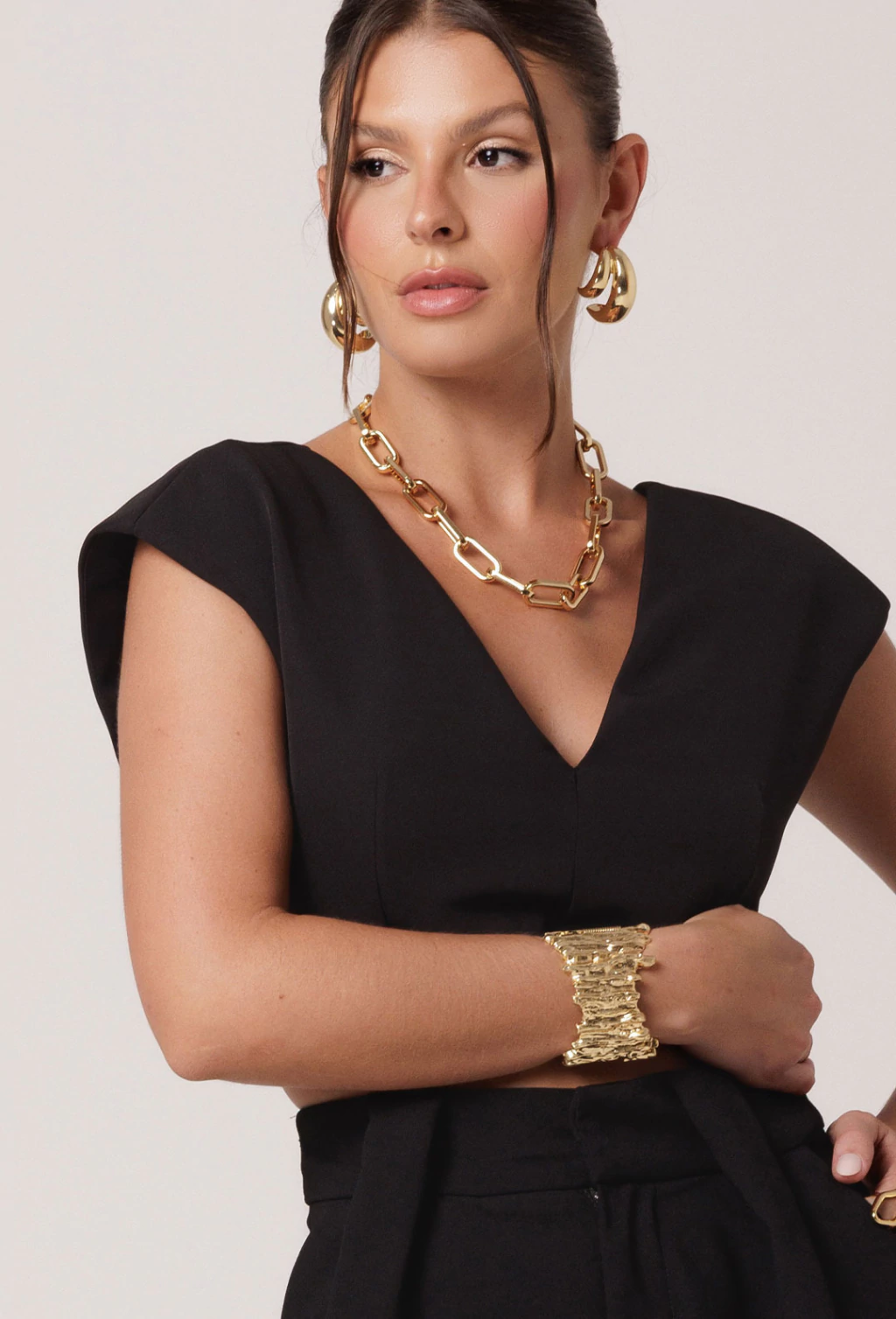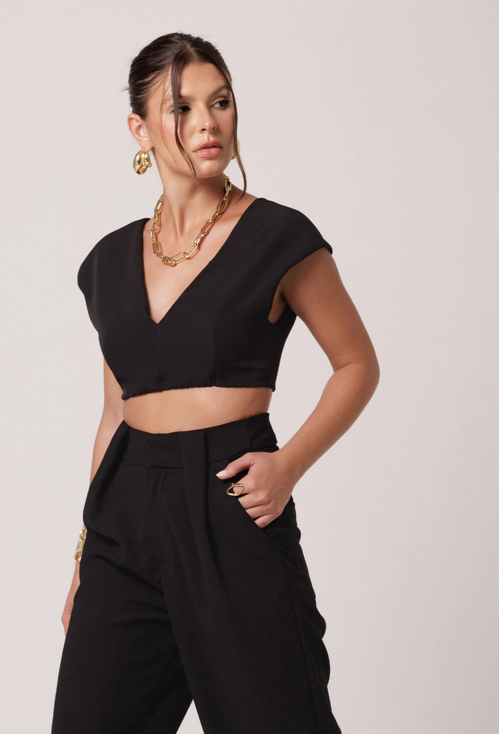Cropped confeccionado em Alfaiataria de alta gramatura. O cropped Olímpia é uma peça cheia de charme com decote em V que valoriza muito o colo. Ele possui ombros bem estruturados dando um volume bem sutil. As costas tem fechamento em botões encapados com o próprio tecido e o decote das costas também é em V assim como na frente. Uma peça coringa que vai fazer toda diferença no look. Características: Cropped de alfaiataria com decote em V e abotoamento nas costas.