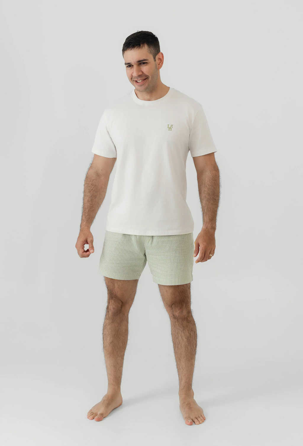 Pijama masculino composto por blusa em malha de algodão de toque suave e respirável, garantindo conforto absoluto para os momentos de descanso. A blusa possui modelagem tradicional, com caimento leve e gola careca, perfeita para noites tranquilas. O short complementa o conjunto com estilo e praticidade, confeccionado em malha trioline listrada, de visual moderno e textura levemente encorpada. Possui cós com elástico embutido, que oferece ajuste confortável ao corpo sem apertar, ideal para o uso prolongado. Um conjunto que combina conforto, funcionalidade e estilo discreto, ideal para quem valoriza bem-estar na hora de dormir ou relaxar em casa.