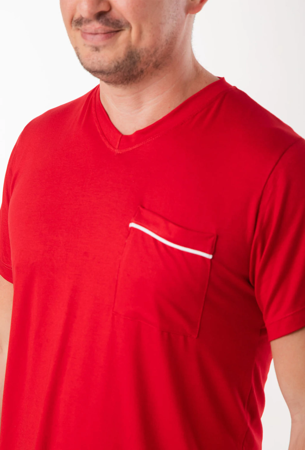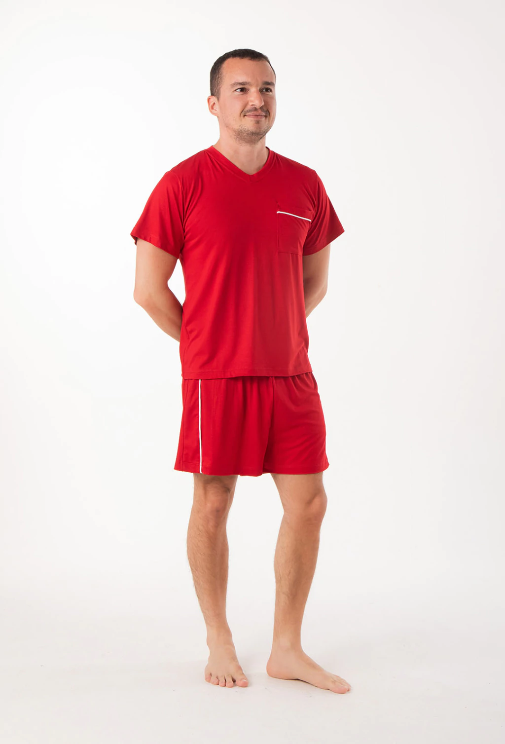 Pijama masculino confeccionado em malha de viscose anti-pilling. Composto por uma blusa com gola em leve ¿V¿, mangas curtas e bolso frontal. O short traz detalhe discreto de vivo nas laterais e elástico na cintura.