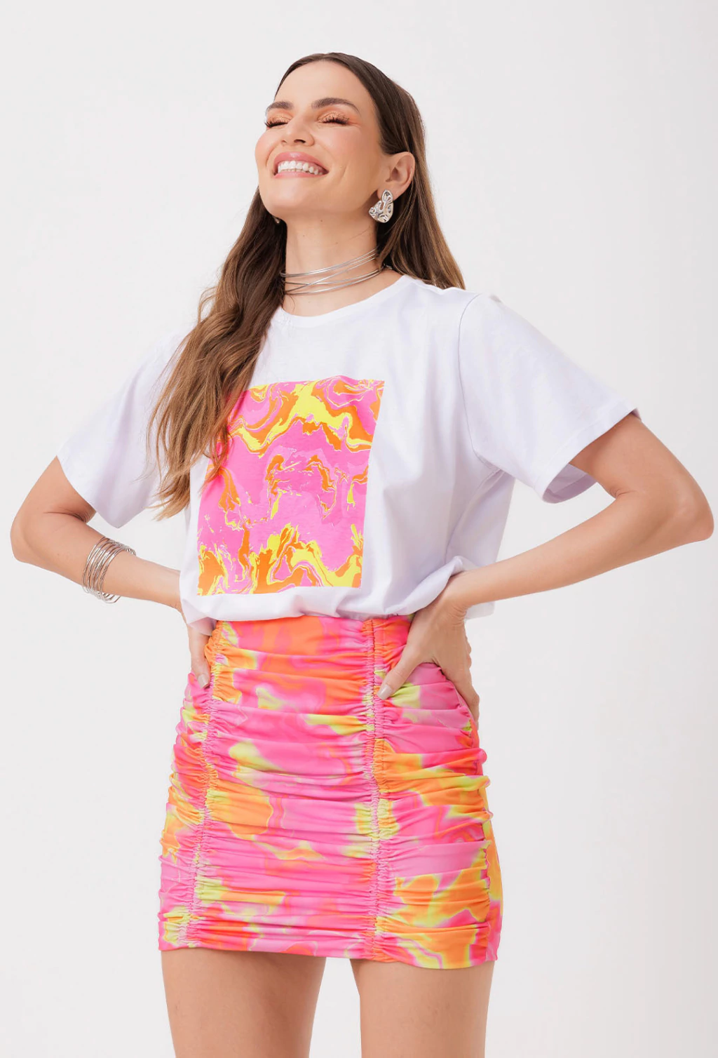 Confeccionado em Lycra estampada. A saia Freya foi feita para você que gosta de usar roupas justas aliadas ao conforto, sem esquecer de valorizar seu corpo! Com dois recortes perto das laterais, a saia possui um franzido super moderno, elástico na cintura interno para boa sustentação e um forro super macio e confortável.