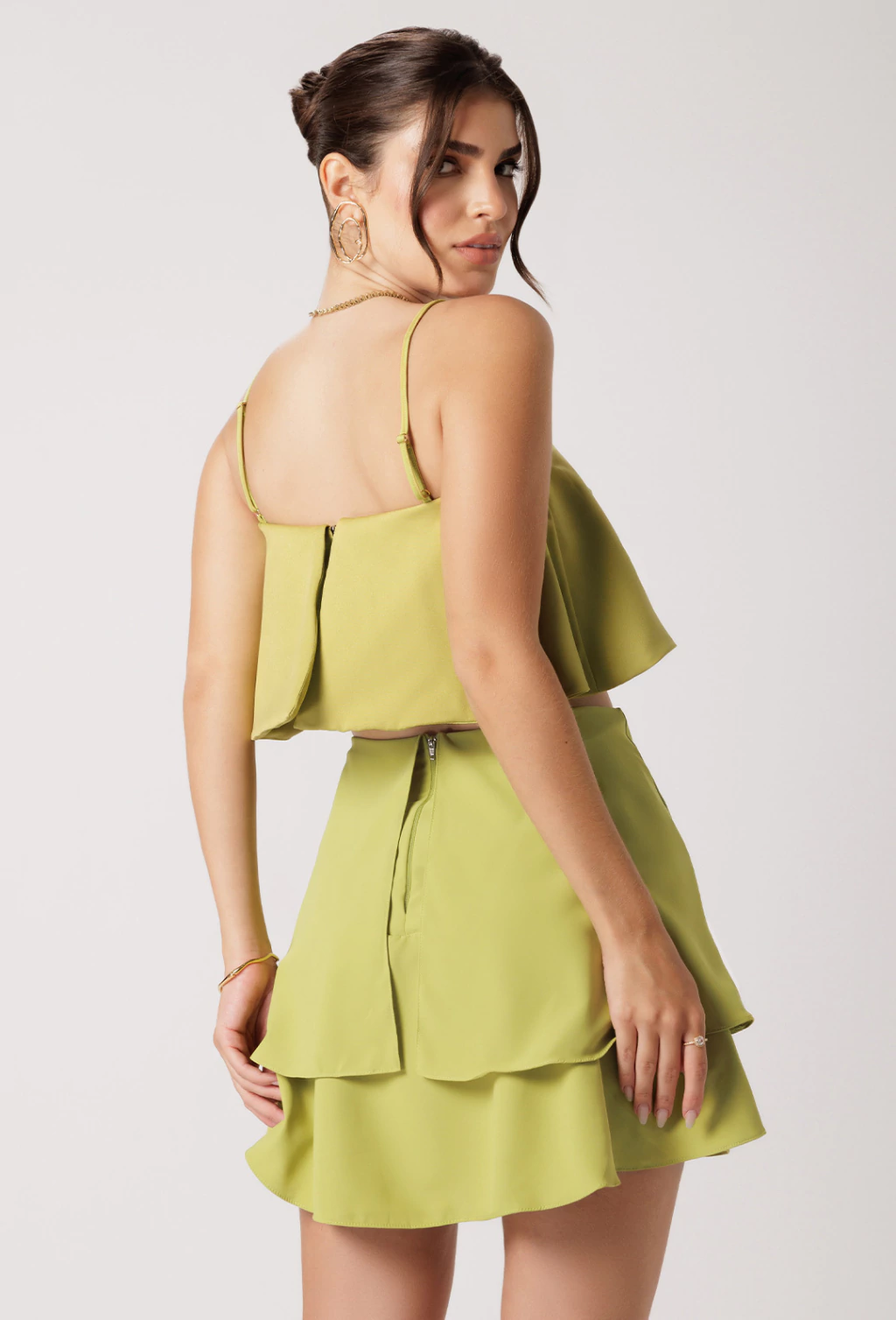 Confeccionada em alfaiataria leve, a saia Lila exala romantismo. Com modelagem mais soltinha a saia possui camadas de babado trazendo movimento e delicadeza ao look. Seu fechamento é em zíper na parte de traze e mesmo sendo mais soltinha a peça é bem marcada na cintura valorizando o corpo. Seu comprimento é acima do joelho proporcionando frescor e suavidade a peça.