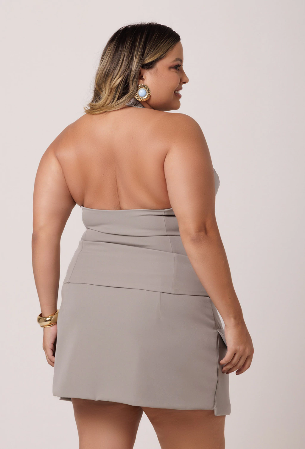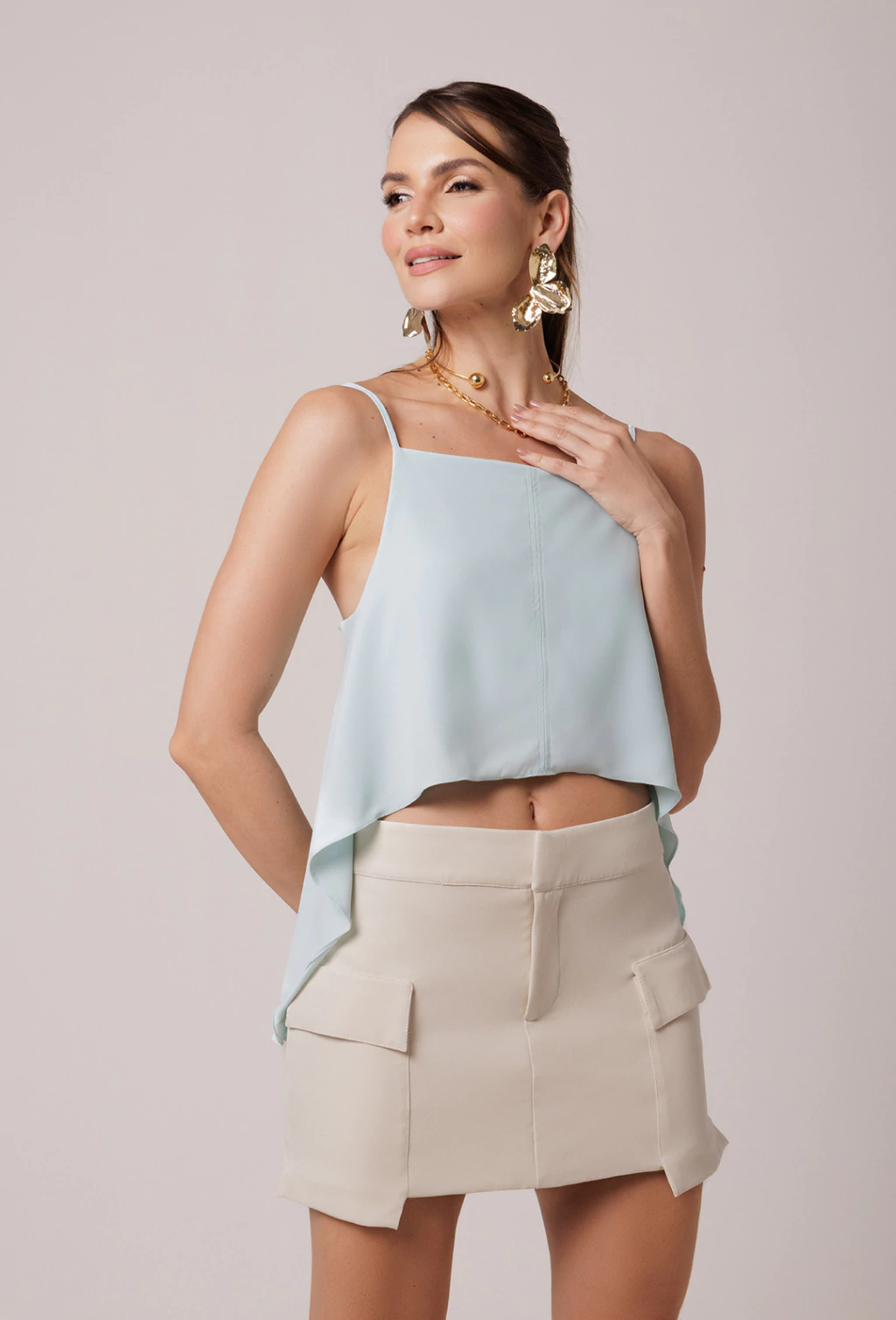 Saia confeccionada em Alfaiataria de alta gramatura. A saia Lorena possui modelagem curtinha super moderna e despojada. Seu cós é reto e cintura baixa com fechamento em colchete e braguilha com fechamento em zíper. Os bolsos são tipo cargo frontais passando um pouco do comprimento e com lapelas. A peça é bem estruturada com forro do próprio tecido. Uma peça perfeita para compor looks casuais. Características: Mini saia com cintura baixa e bolso cargo