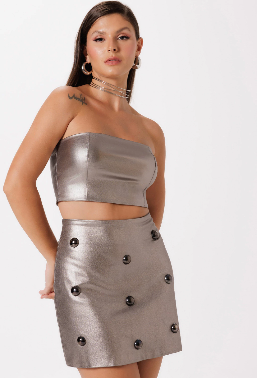 Saia confeccionada em alfaiataria sarjada metalizado, a saia Ramona é a nossa aposta sofisticada para você arrasar em looks super fashionistas e cheios de tendências! A saia possui comprimento curto, modelagem reta ajustada ao corpo e aplicações de esferas boleadas cor chumbo, com fechamento em zíper nas costas e forro embutido no mesmo tecido estruturado.