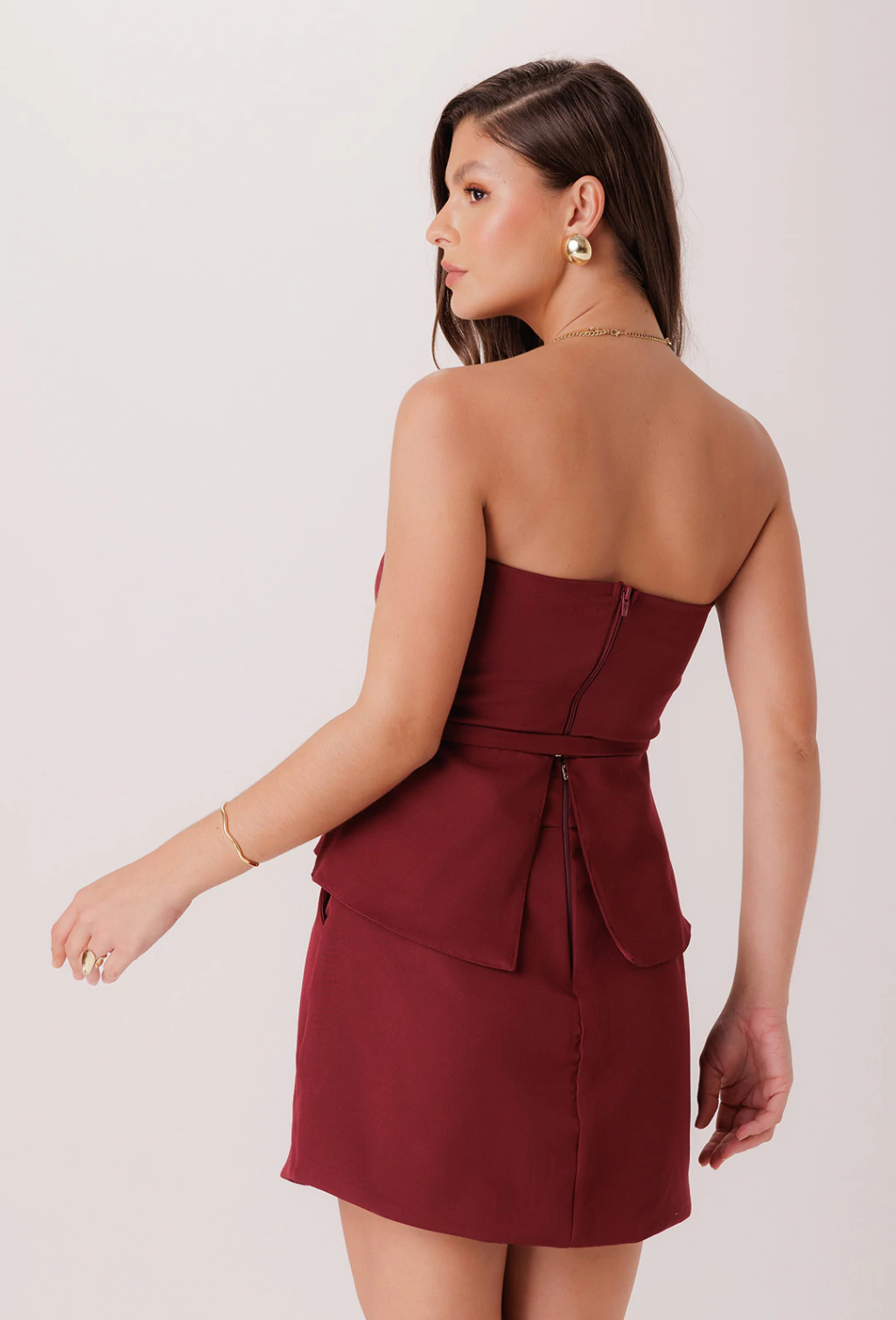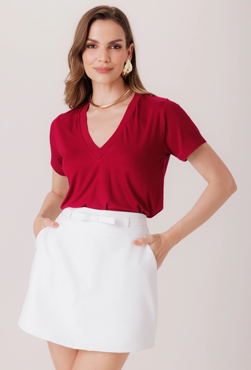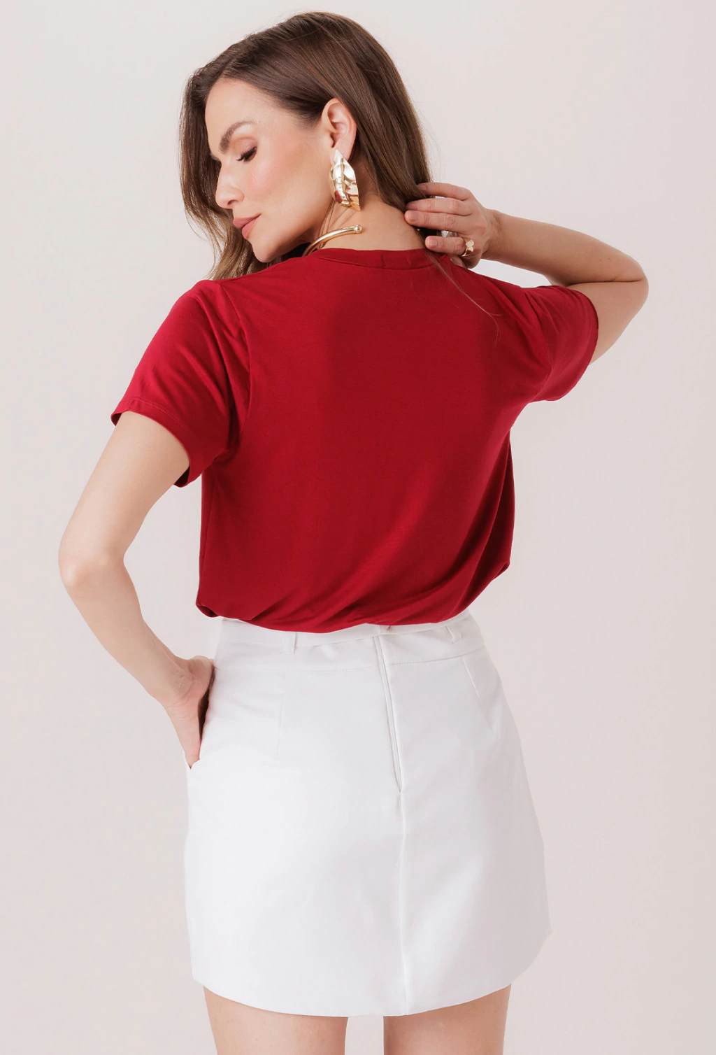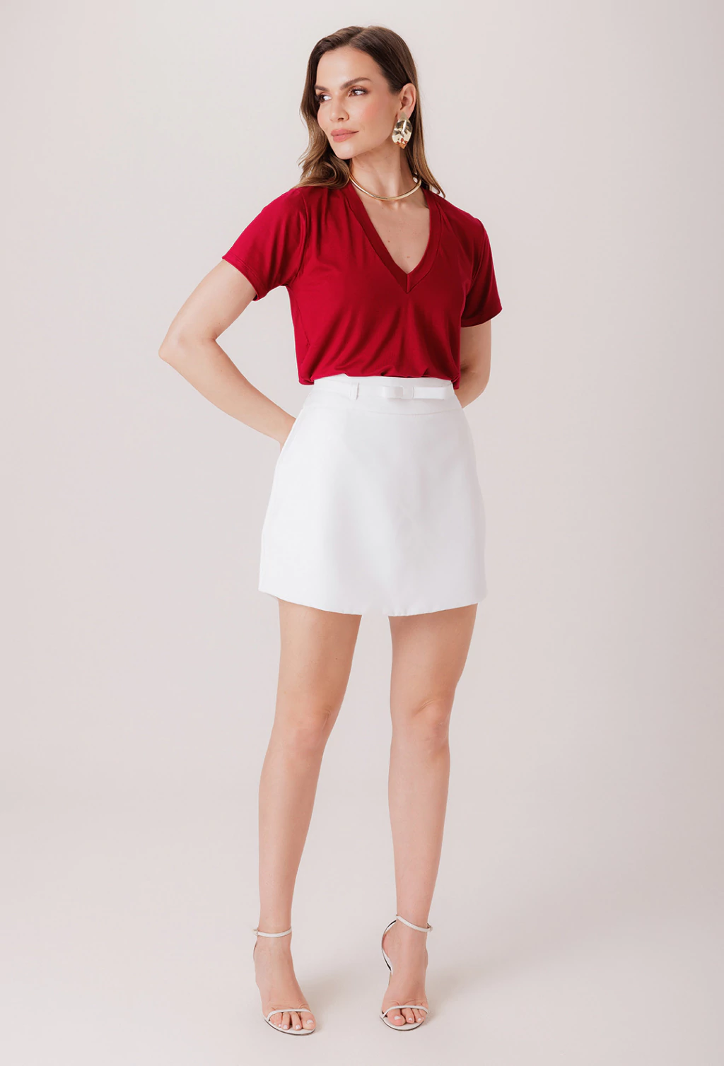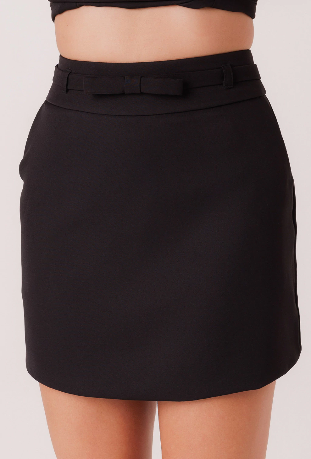 Saia confeccionada em alfaiataria de alta gramatura, uma saia clássica que, com seu comprimento curto que se ajusta nas formas do corpo e gera uma silhueta que realça as curvas, e também é versátil, pois sendo uma peça curinga, ela pode ser combinada com diversas peças pra criar um look bonito de acordo com a ocasião pedida. A peça possui cós largo para dar espaço para um detalhe que é um de seus maiores charmes: O cinto de lacinho é o detalhe que soma ao charme da peça, e com seu fechamento de botão de pressão, o laço pode ser posicionado tanto na frente quanto nas costas da peça.