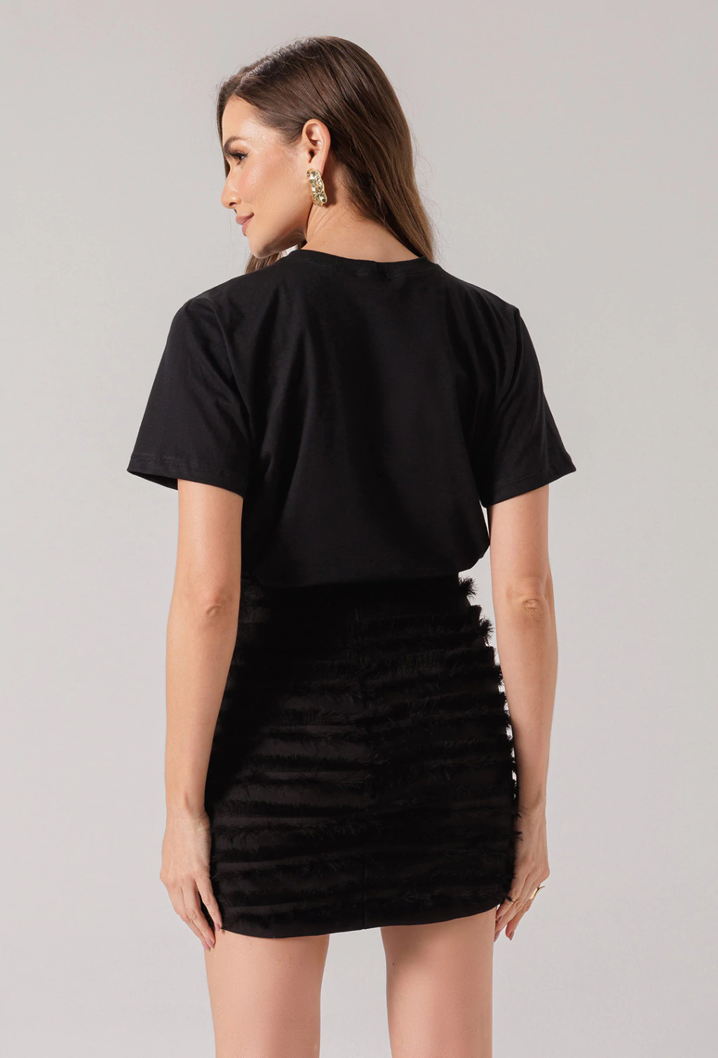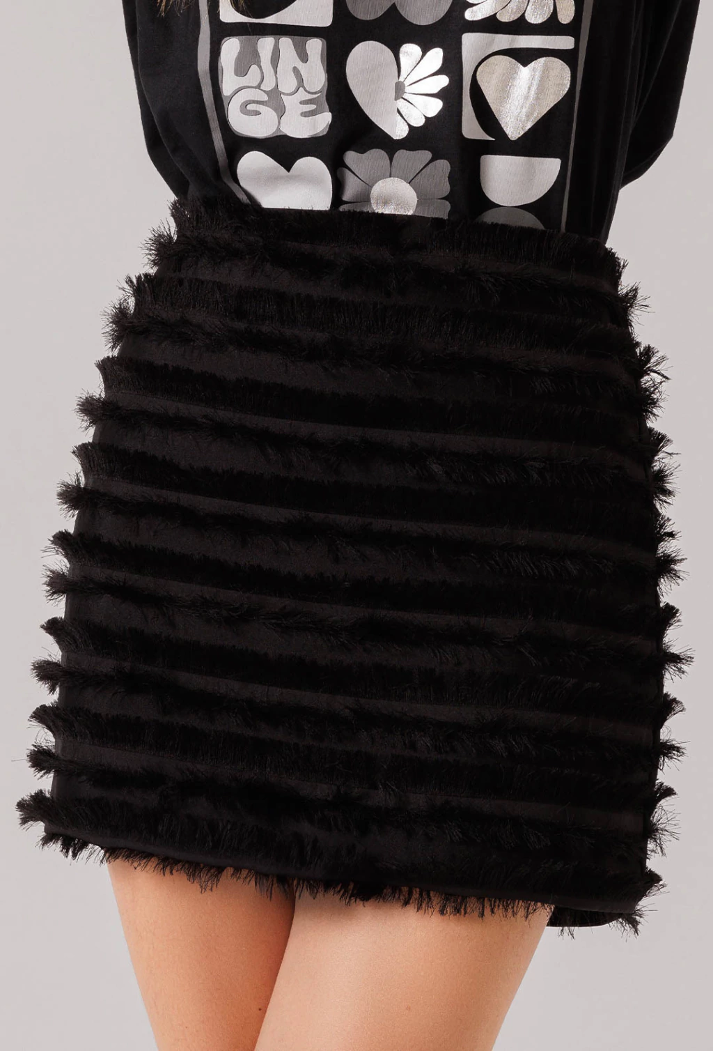 Confeccionado em tecido diferenciado com listras de pelinhos, a saia Tayn é uma aposta sofisticada e interessante com charme único, possuindo uma modelagem levemente ajustado ao corpo, ela é forrada por dentro com tecido de alfaiataria que garante conforto e estrutura para a peça. Ideal para ser uma peça de destaque em looks fashionistas, ela é uma peça indispensável para quem gosta de peças dramáticas que exalem personalidade.