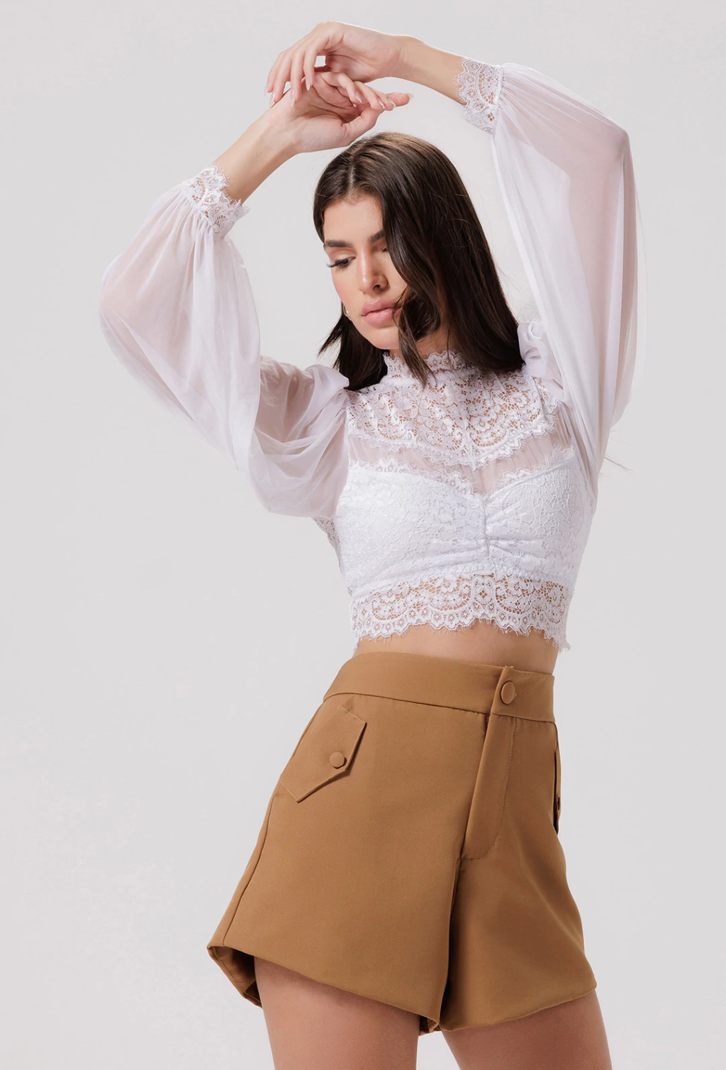 Características: Short cintura alta com bolso faca com detalhe de aba nas diagonais com botões forrados