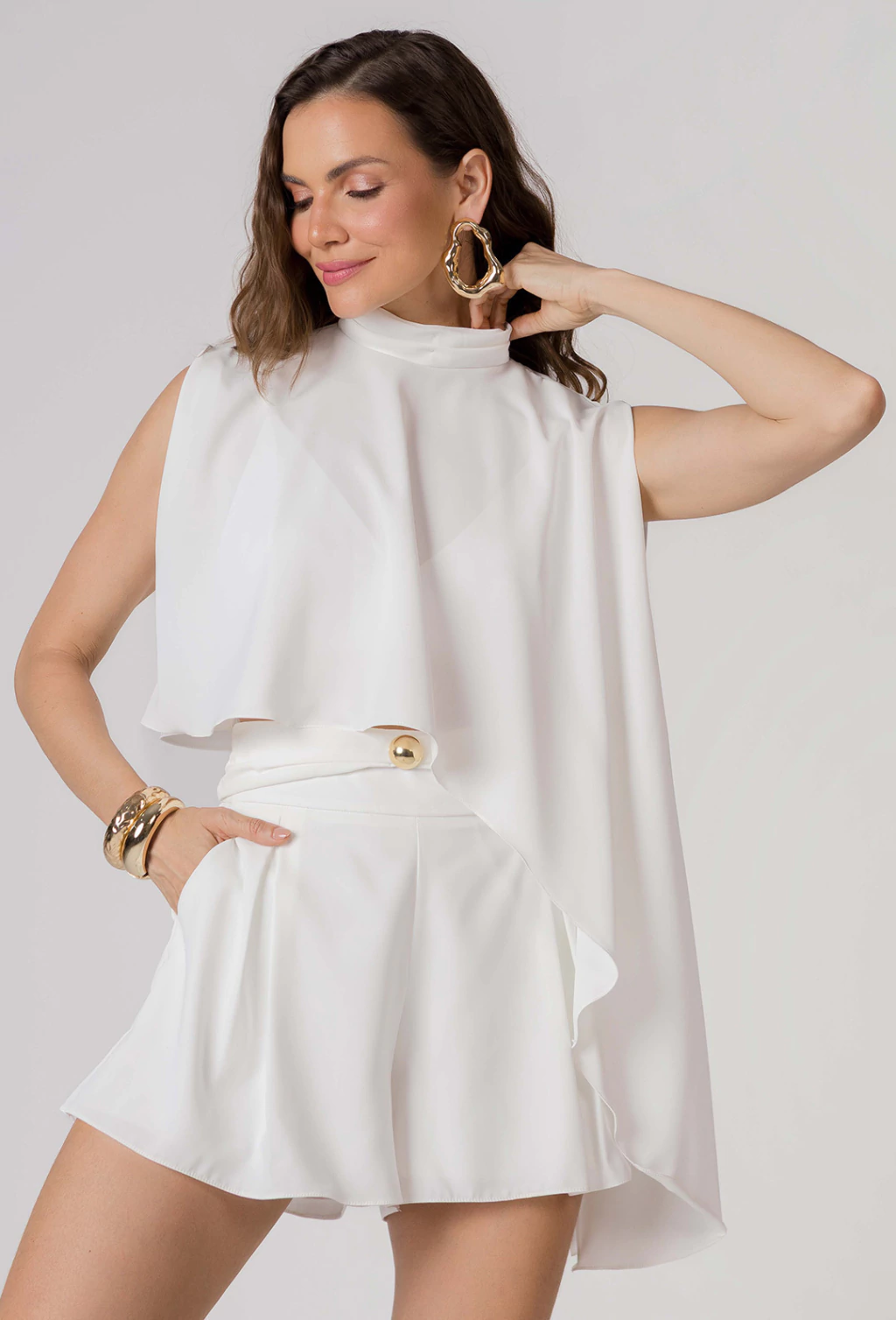 Confeccionado em Alfaiataria Leve, o short Natasha possui modelagem soltinha com bolsos facas para praticidade e uma pala com detalhe franzido, este modelo é realçado por um elegante aviamento dourado no centro. Perfeito para um look casual chic, combina conforto e estilo com facilidade.