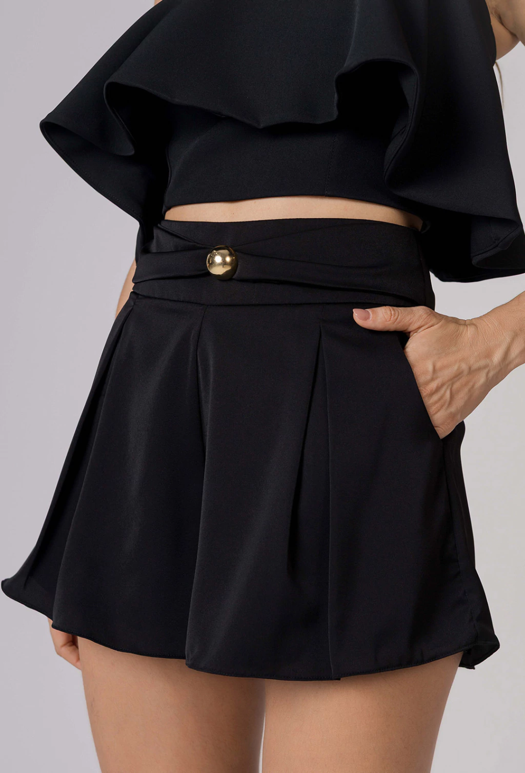 CARACTERISTICAS: Short soltinho com bolsos facas e pala com detalhe franzido com aviamento dourado no centro