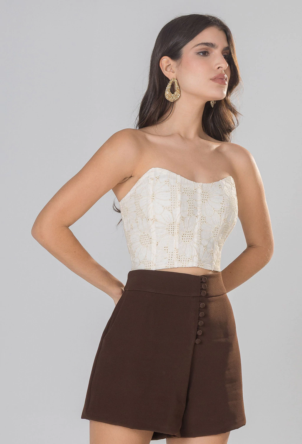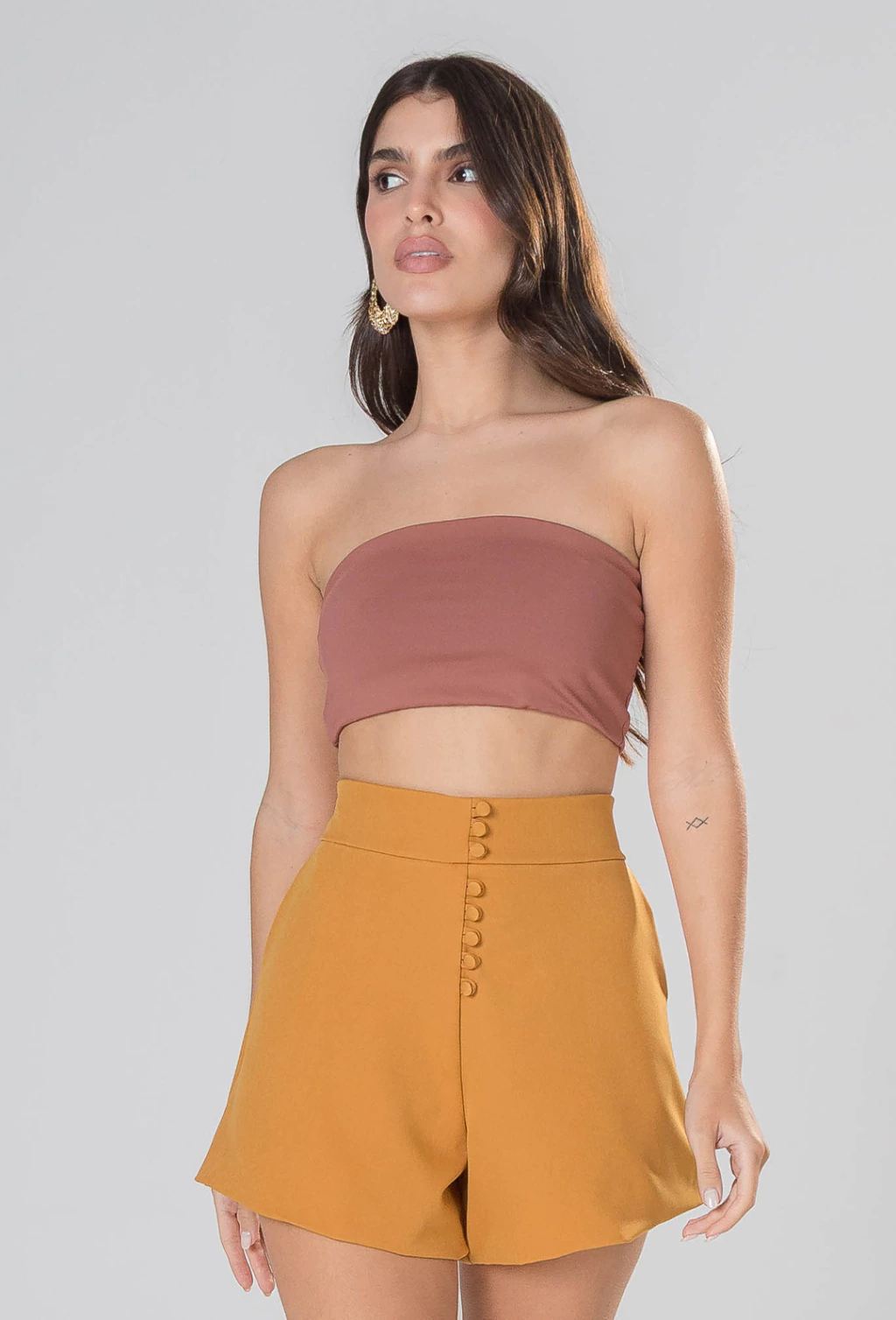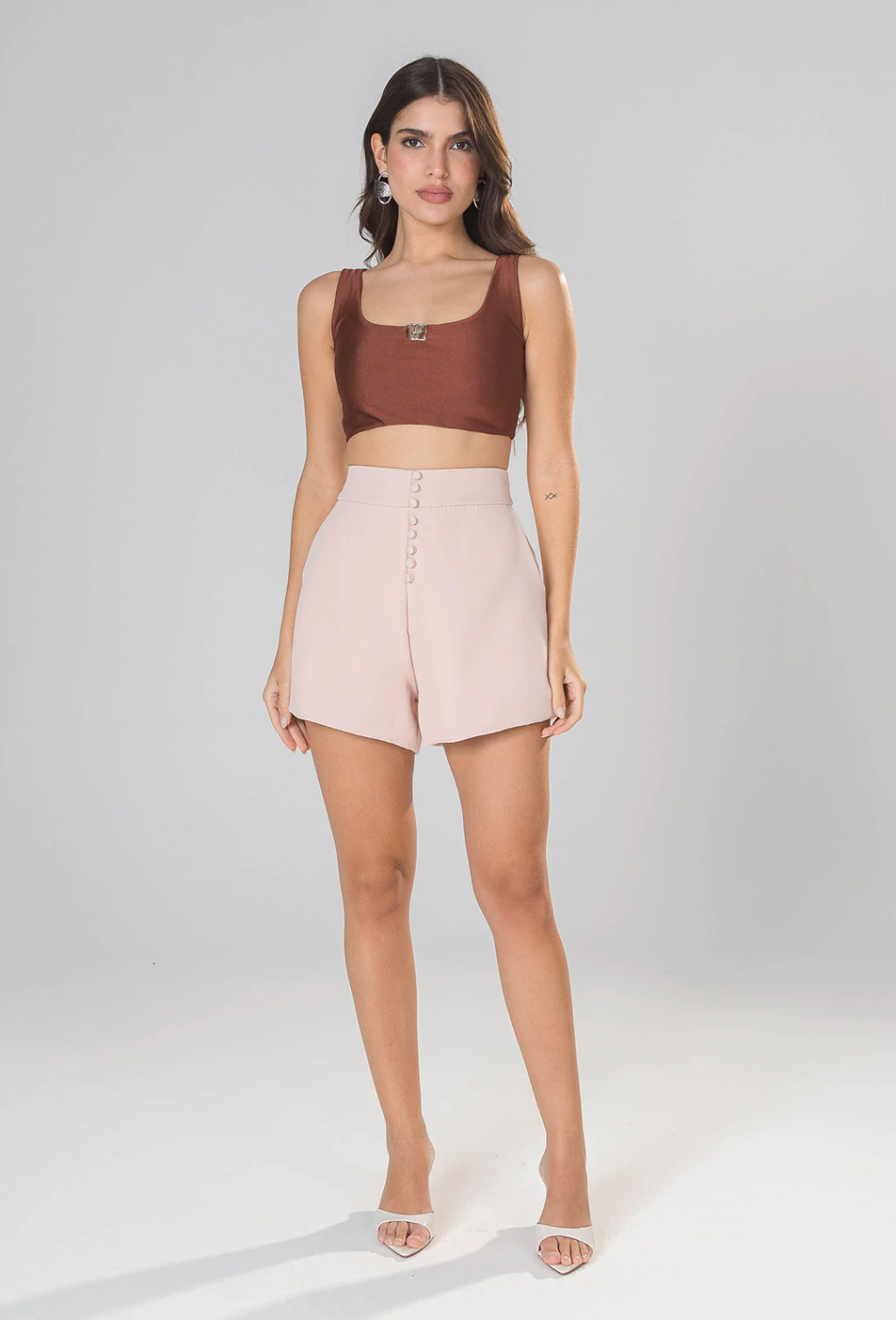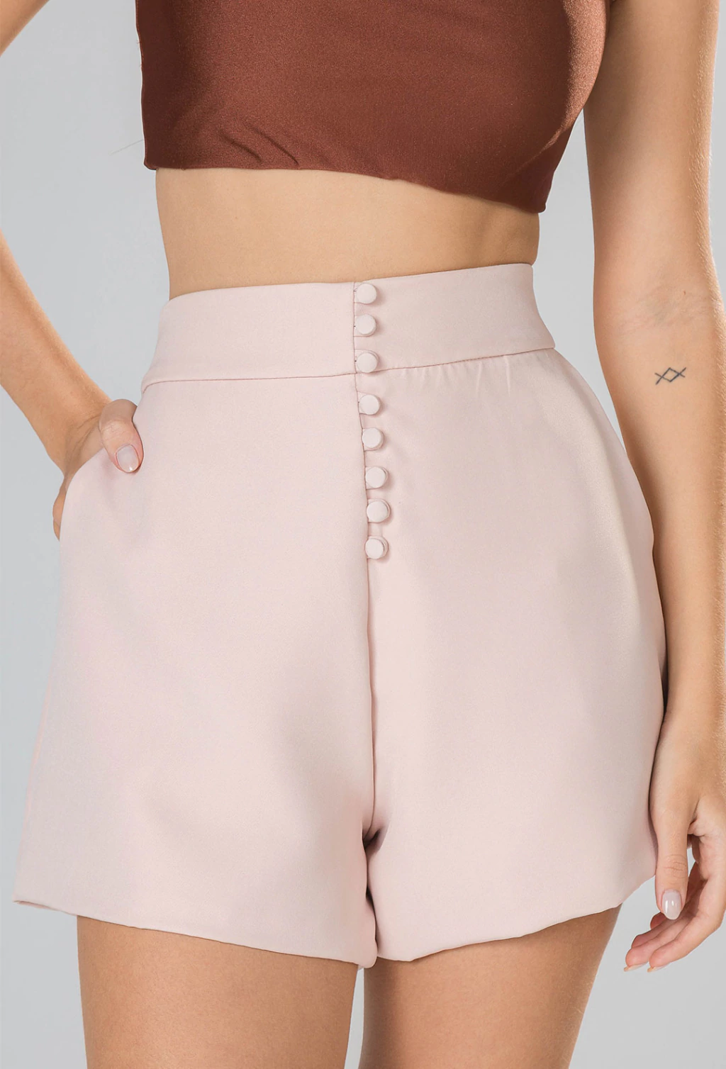 Short em alfaiataria de alta gramatura, que garante excelente estrutura e caimento impecável. Possui bolsos faca funcionais, práticos e discretos, e detalhe frontal com botão decorativo, que adiciona um toque de sofisticação ao design. O fechamento é em zíper na parte de trás. Seu comprimento acima do joelho equilibra elegância e modernidade, tornando a peça ideal para composições versáteis e estilosas.