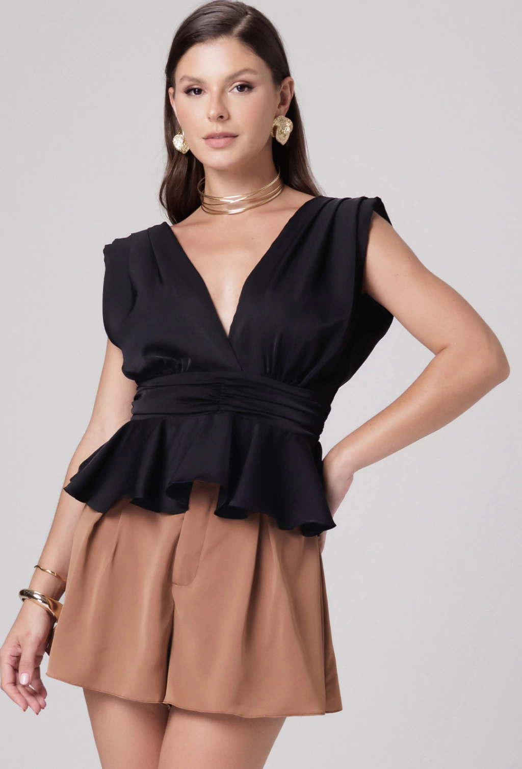 Características: Short soltinho com pregas frontais