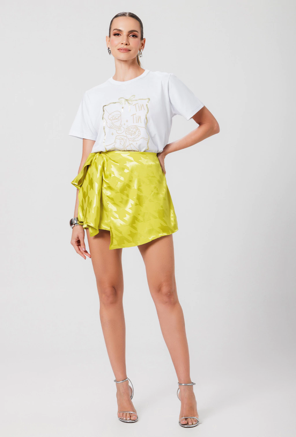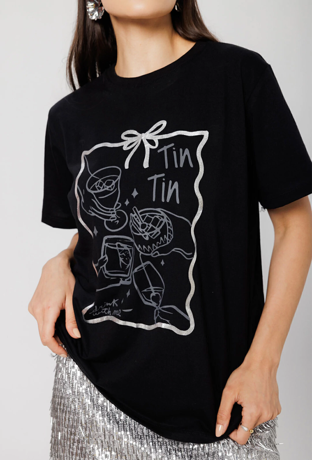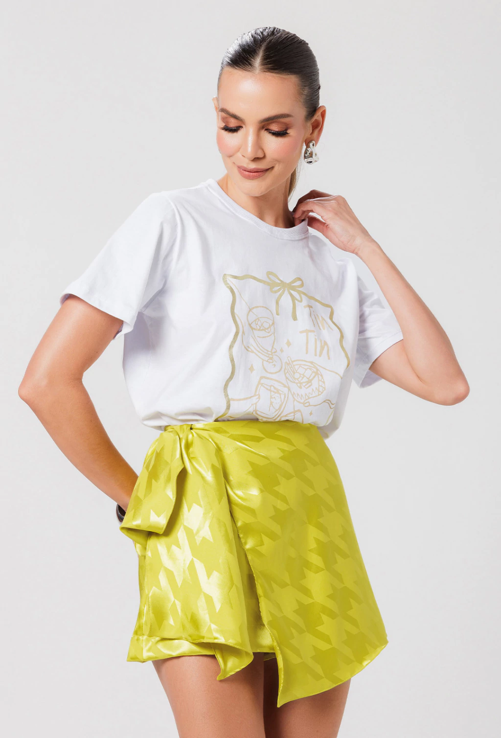 A t-shirt Tricia é uma peça de roupa descontraída, confeccionada em malha 100% algodão, com um estilo amplo e confortável, que é característico da modelagem "oversized". A estampa de brinde de taças é perfeita para ocasiões informais, como encontros com amigos, festas descontraídas ou até para um look de fim de semana. Ela mistura o estilo casual com um toque de sofisticação divertida, sendo ideal para quem adora se expressar de maneira descontraída, mas ainda com um toque de estilo. O visual amplo e a estampa de celebração fazem dessa camiseta uma peça ideal para quem quer marcar presença com um look moderno e festivo, sem abrir mão do conforto.