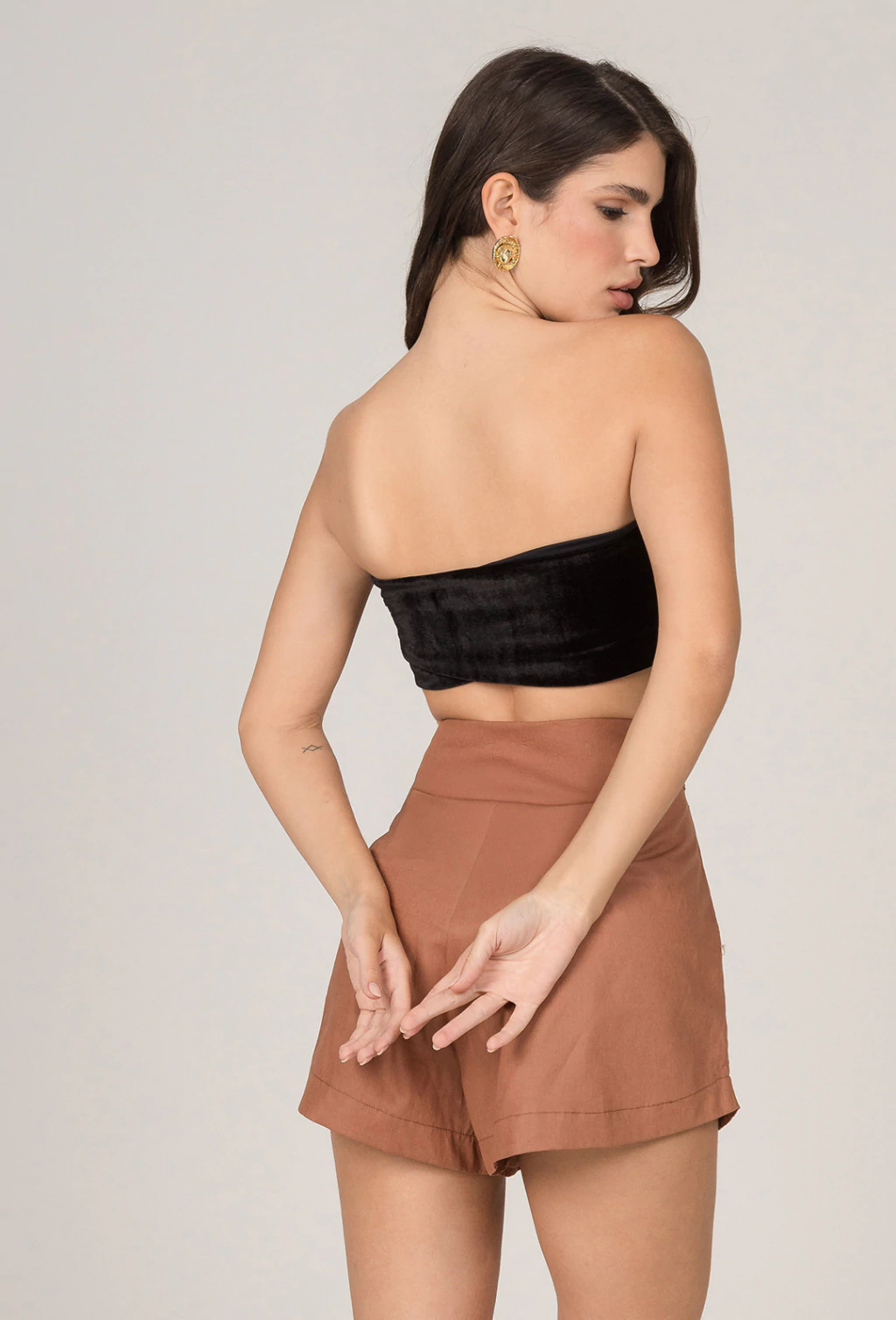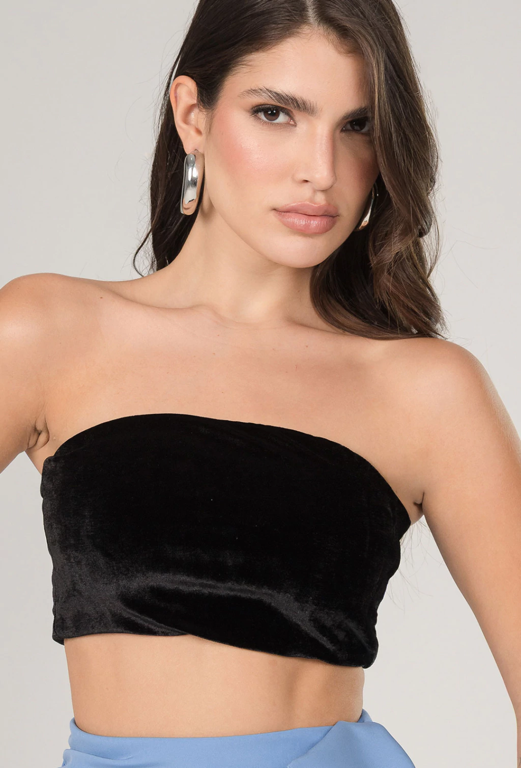 Confeccionado em tecido macio e com leve brilho característico do veludo, ele proporciona um caimento ajustado ao corpo, valorizando a silhueta de forma elegante. O top Naomi não possi alças mas tem acabamento firme na parte superior e inferior, que garante segurança e liberdade de movimento. Ideal para compor looks modernos e versáteis do casual ao noturno o top faixa em veludo combina com saias, calças de cintura alta ou sobreposições, sendo uma peça-curinga no guarda-roupa.