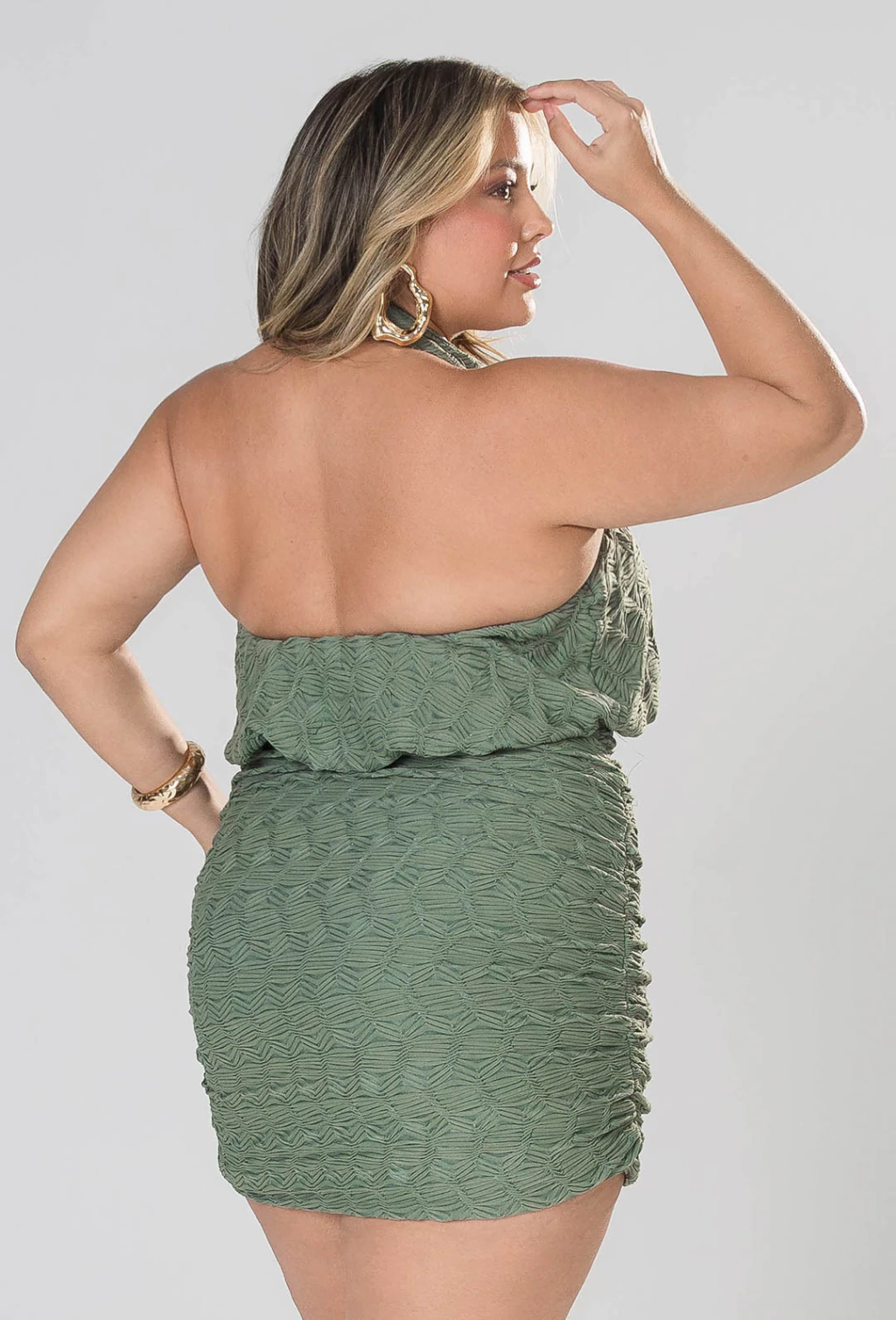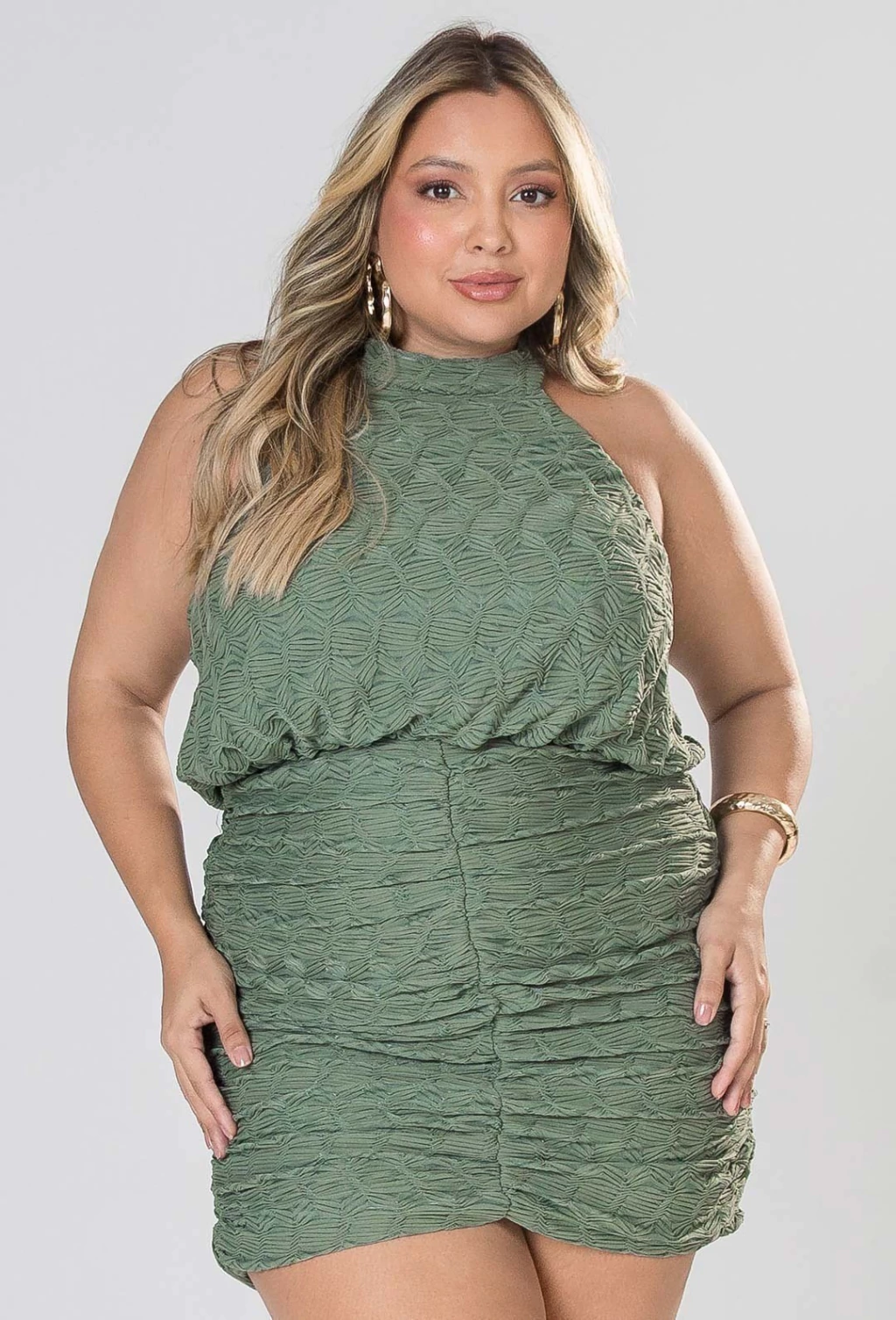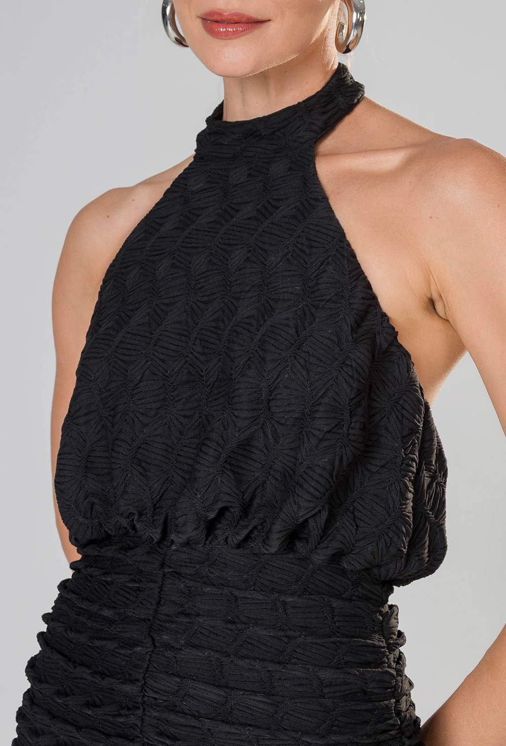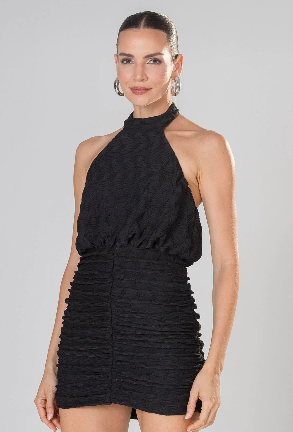 Vestido confeccionado em tecido diferenciado com textura, que confere sofisticação e um toque contemporâneo à peça. A modelagem é ajustada ao corpo, valorizando a silhueta de forma elegante e feminina. Na parte frontal, o destaque fica para o drapeado interno, que acrescenta movimento e profundidade ao design, além de trazer um charme sutil e refinado. O grande protagonista, no entanto, é o decote acentuado nas costas, que revela a pele com sensualidade e equilíbrio, criando um visual marcante e inesquecível.