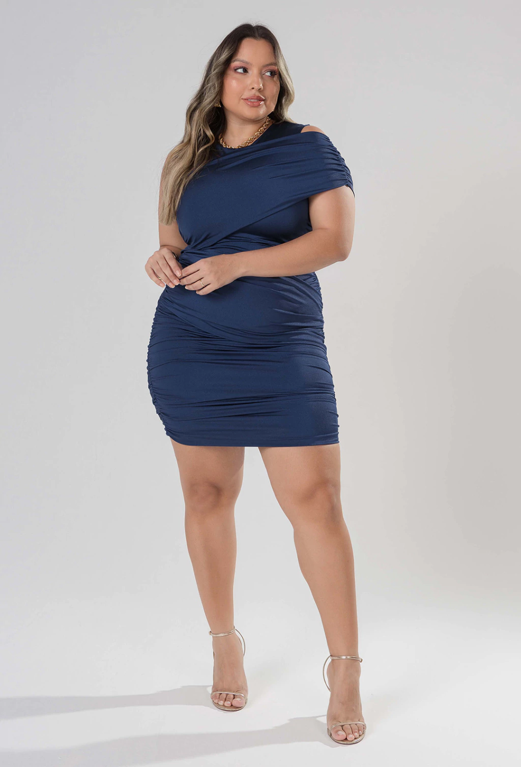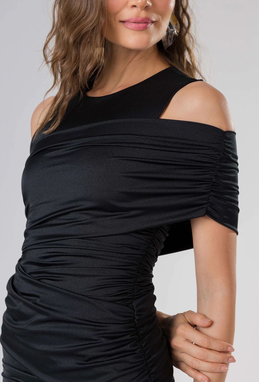 CARACTERISTICAS: Vestido curto com drapeado e sobreposição