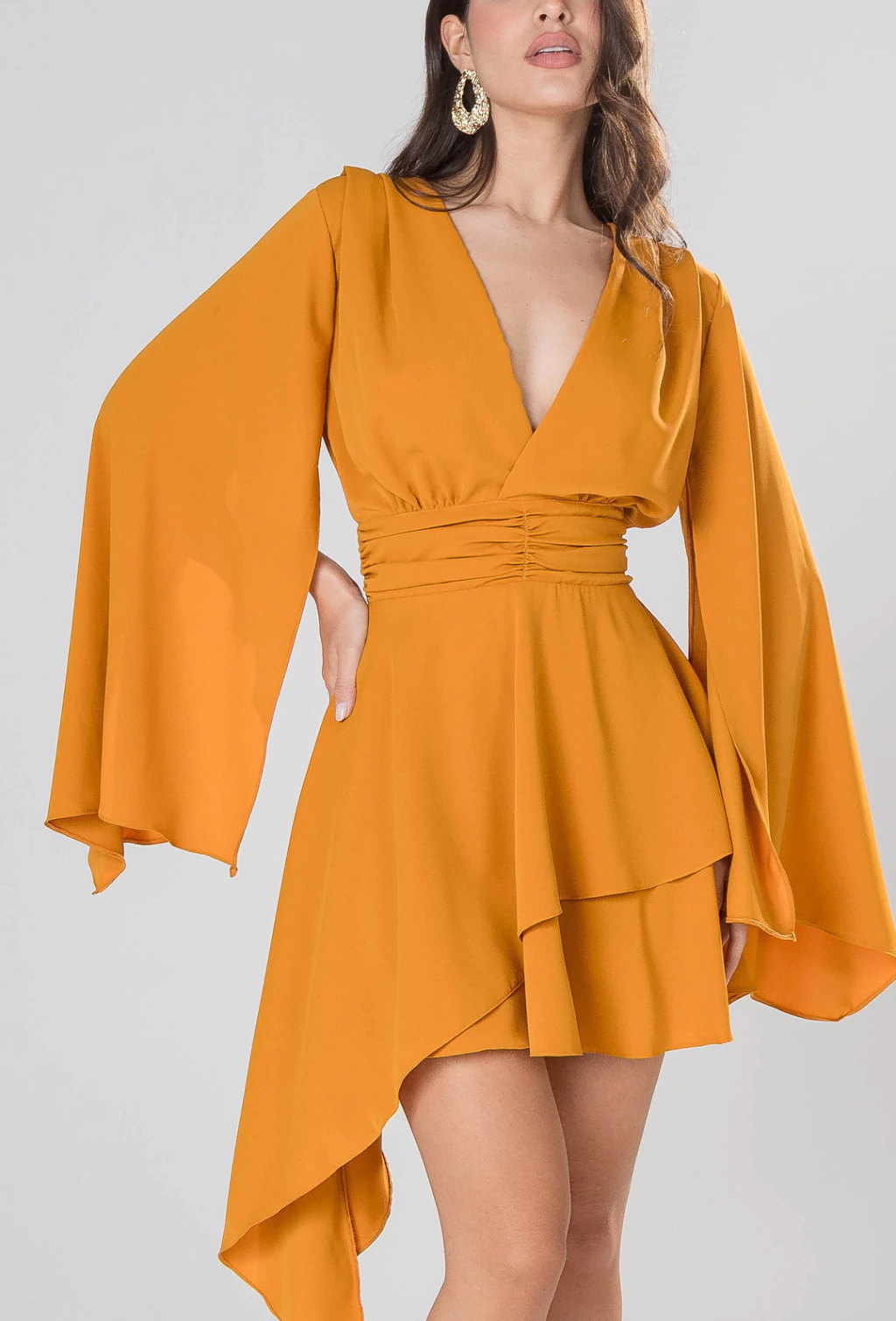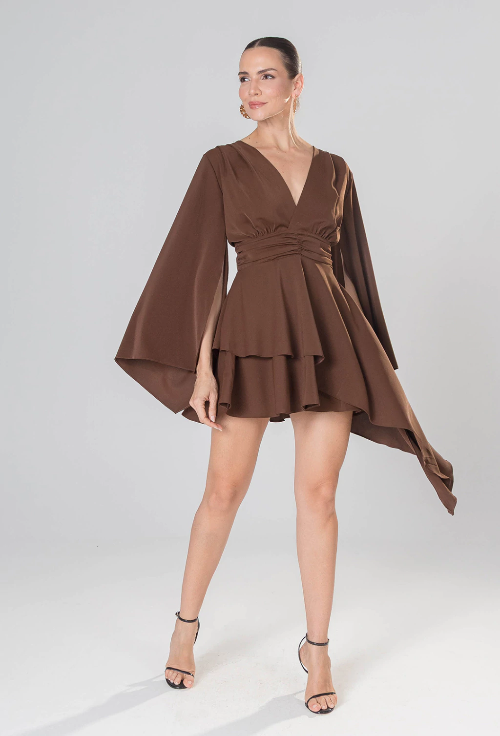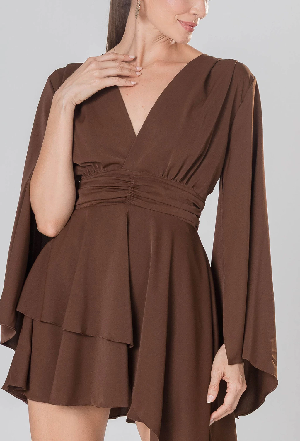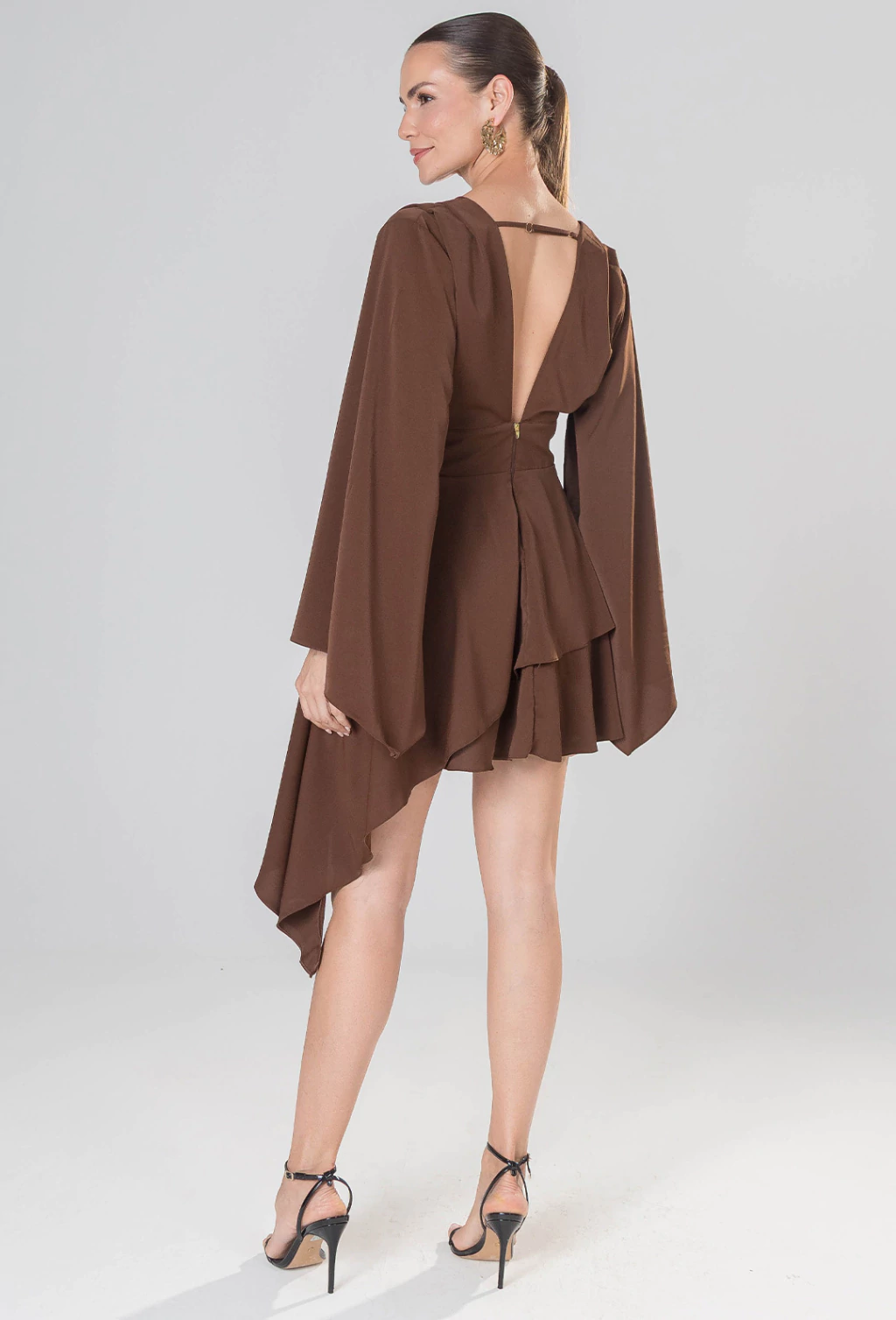 Vestido confeccionado em alfaiataria leve, com caimento suave e toque sofisticado. A peça apresenta mangas fluidas, que conferem leveza e movimento, além de uma sobreposição na parte inferior, criando um efeito moderno e delicado. O decote frontal valoriza a região do colo com sutileza, enquanto a pala com leve drapeado adiciona textura e sofisticação ao design. Com comprimento acima do joelho, o modelo é ideal para composições elegantes e femininas em diversas ocasiões.