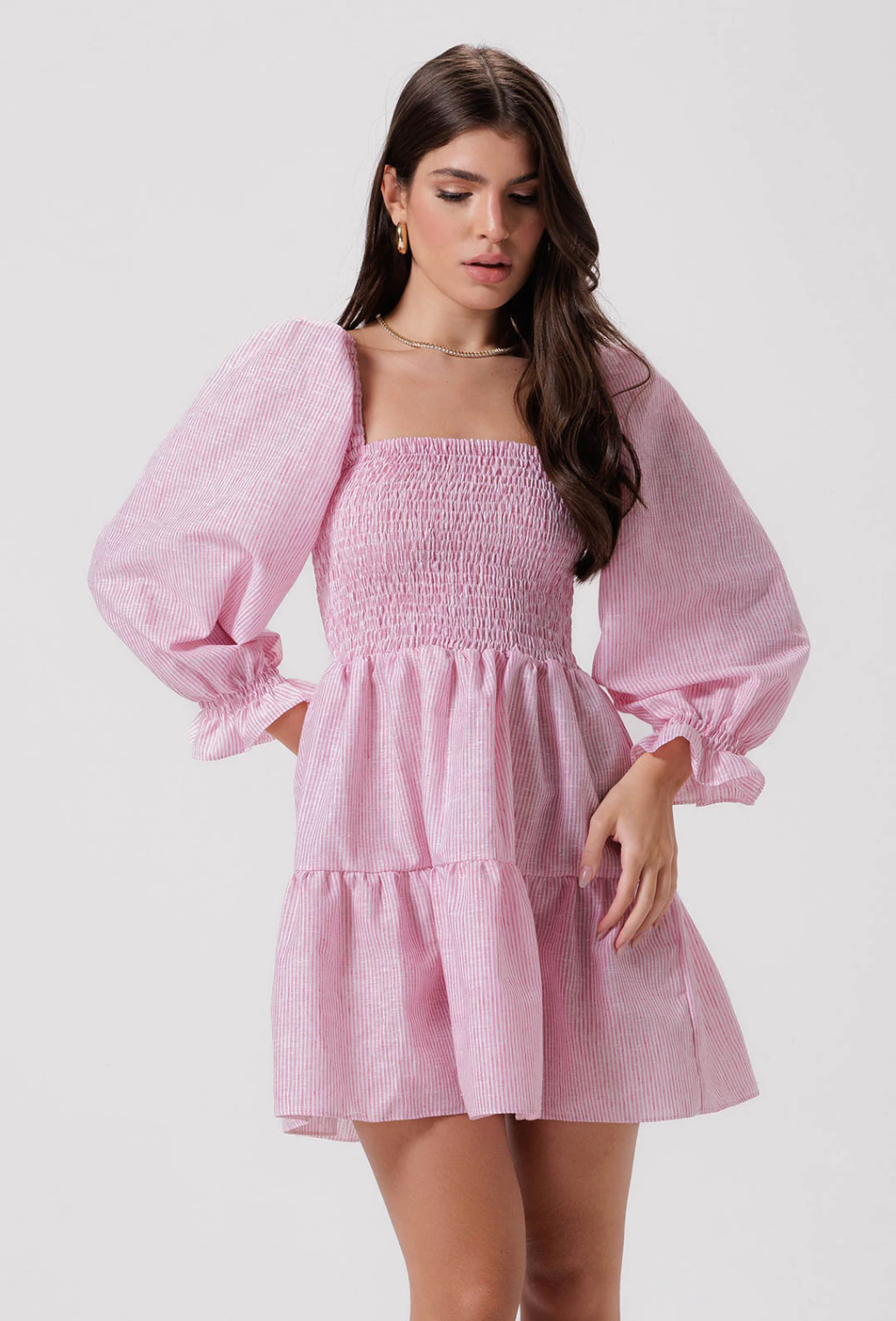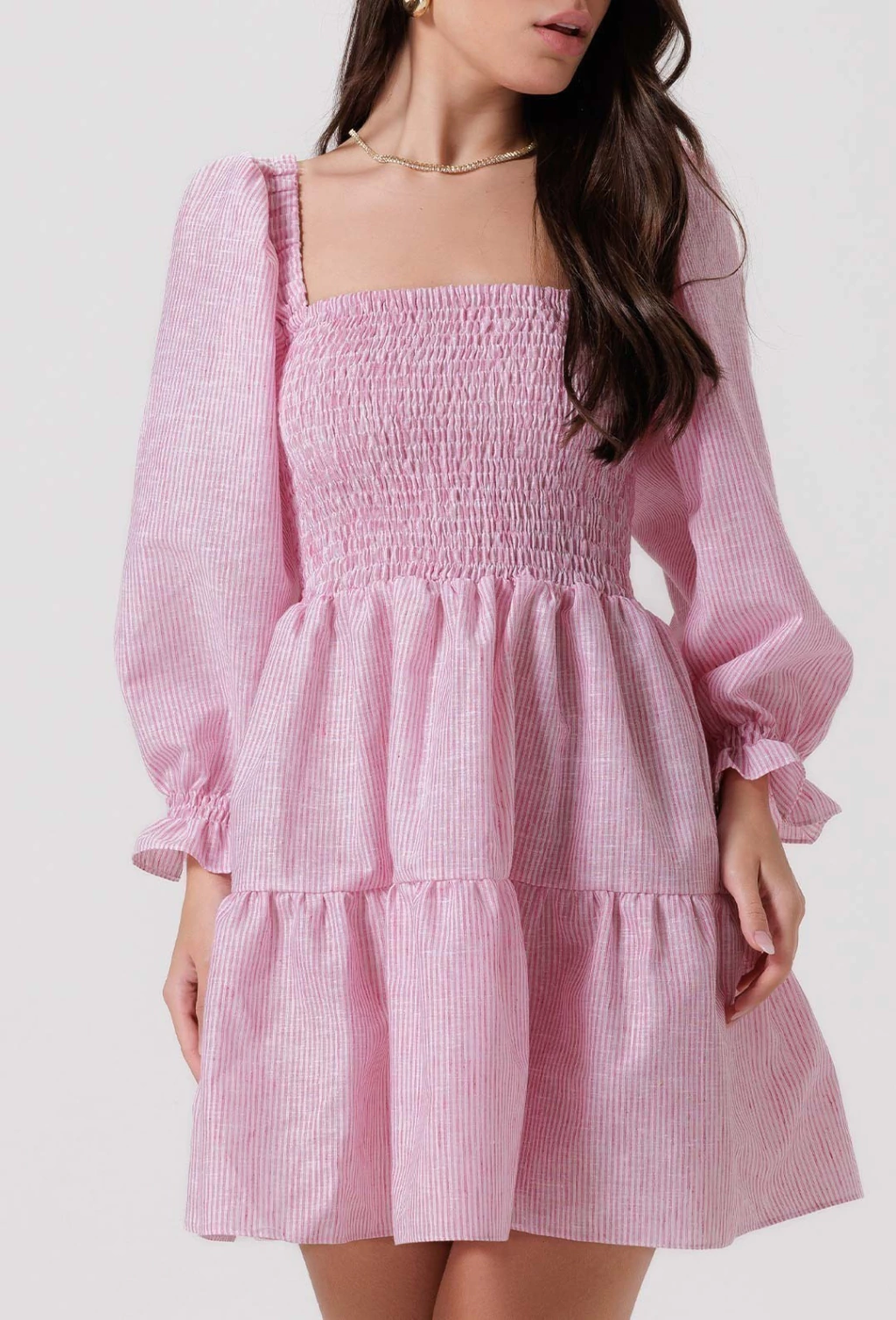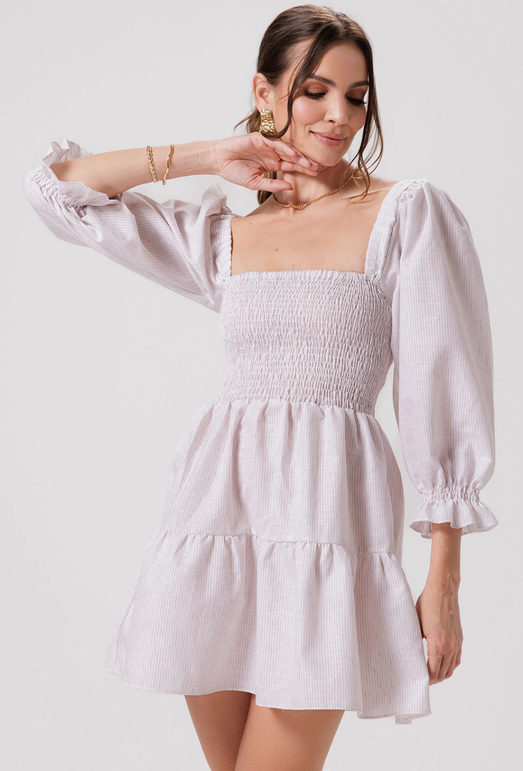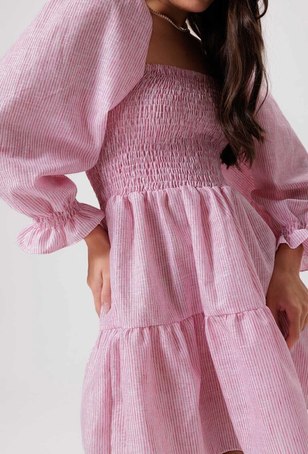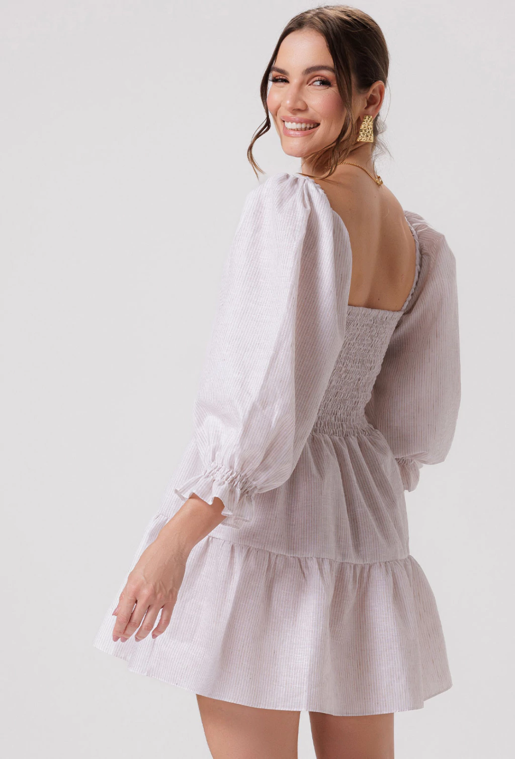 Confeccionado em alfaiataria de algodão listrada, o vestido Ritinha é uma peça romântica e moderna. Com seu decote quadrado e busto em lastex, ele possui um ajuste perfeito às curvas do corpo, que se complementa bem com as mangas 3/4 bufantes que dão uma delicadeza a mais na peça. Sua saia traz modelagem godê com um babado aplicado na barra que proporciona um volume sofisticado a composição.