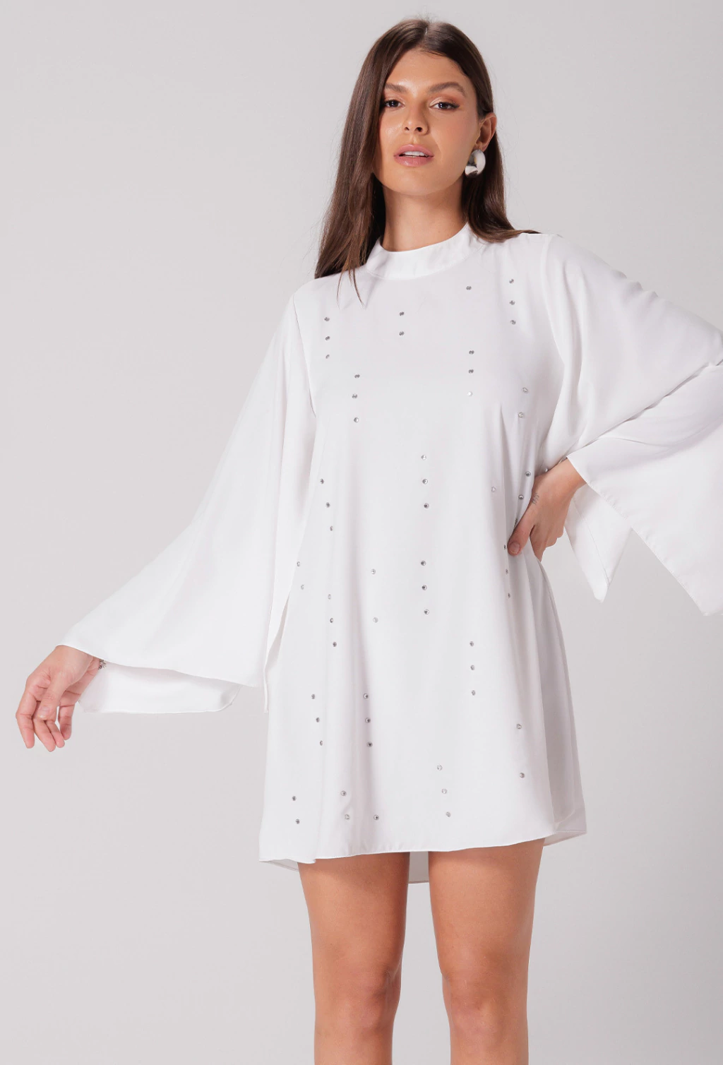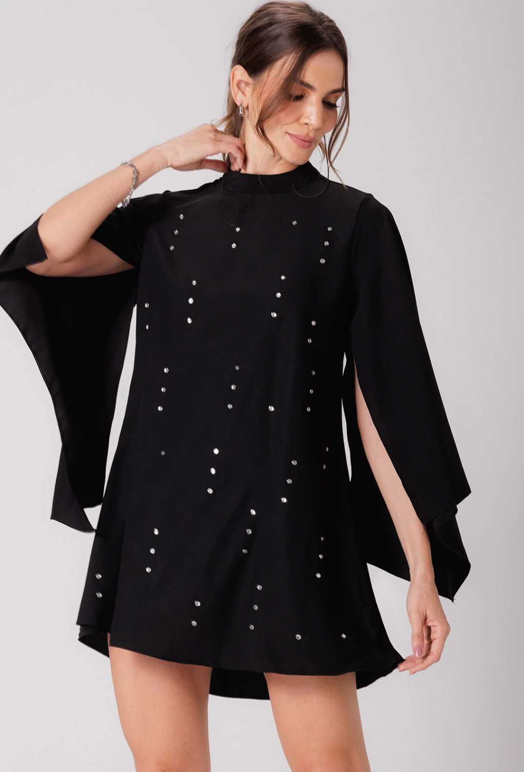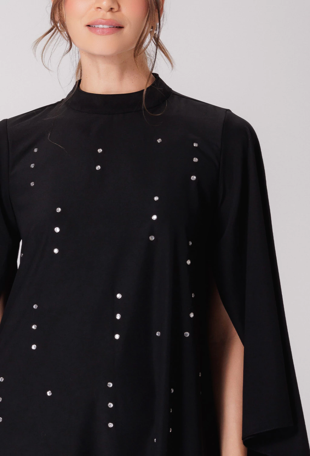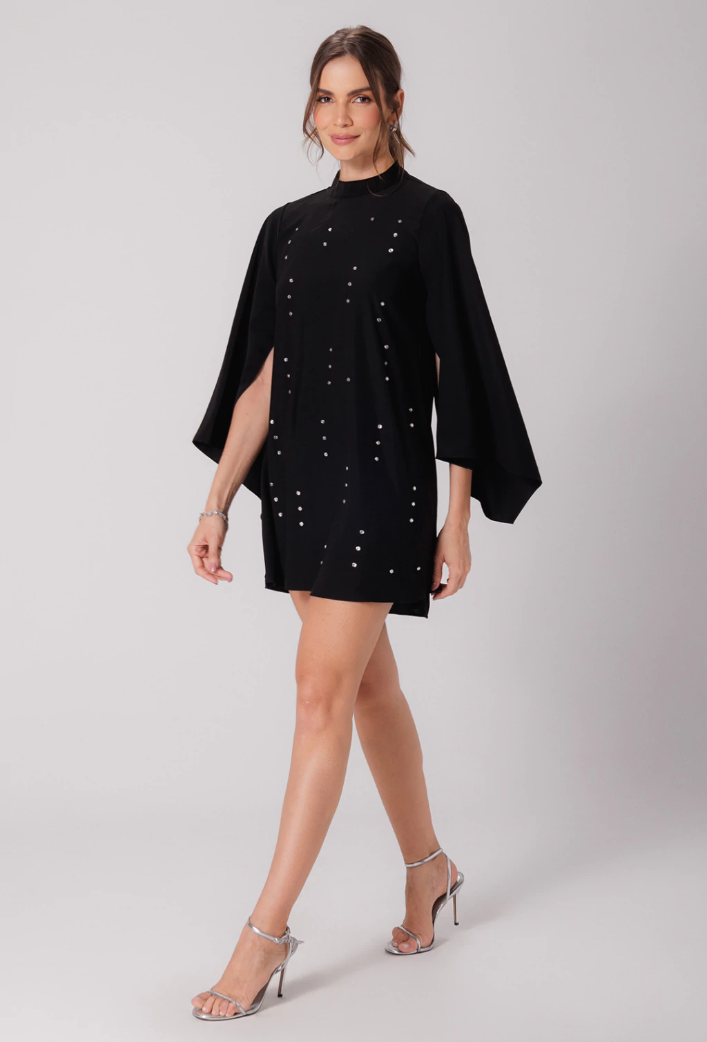 Confeccionado em alfaiataria leve o vestido Tamara é uma peça que exala elegância. Sua modelagem evasê soltinha proporciona liberdade de movimento e um caimento suave no corpo, enquanto as mangas longas abertas adicionam um toque de graciosidade com seu caimento fluido, que se combinam com a gola alta, fechada atrás por botões, criando um visual com estilo refinado. Outro detalhe é que o corpo do vestido é adornado com aplicações de pedraria que adicionam brilho e sofisticação.