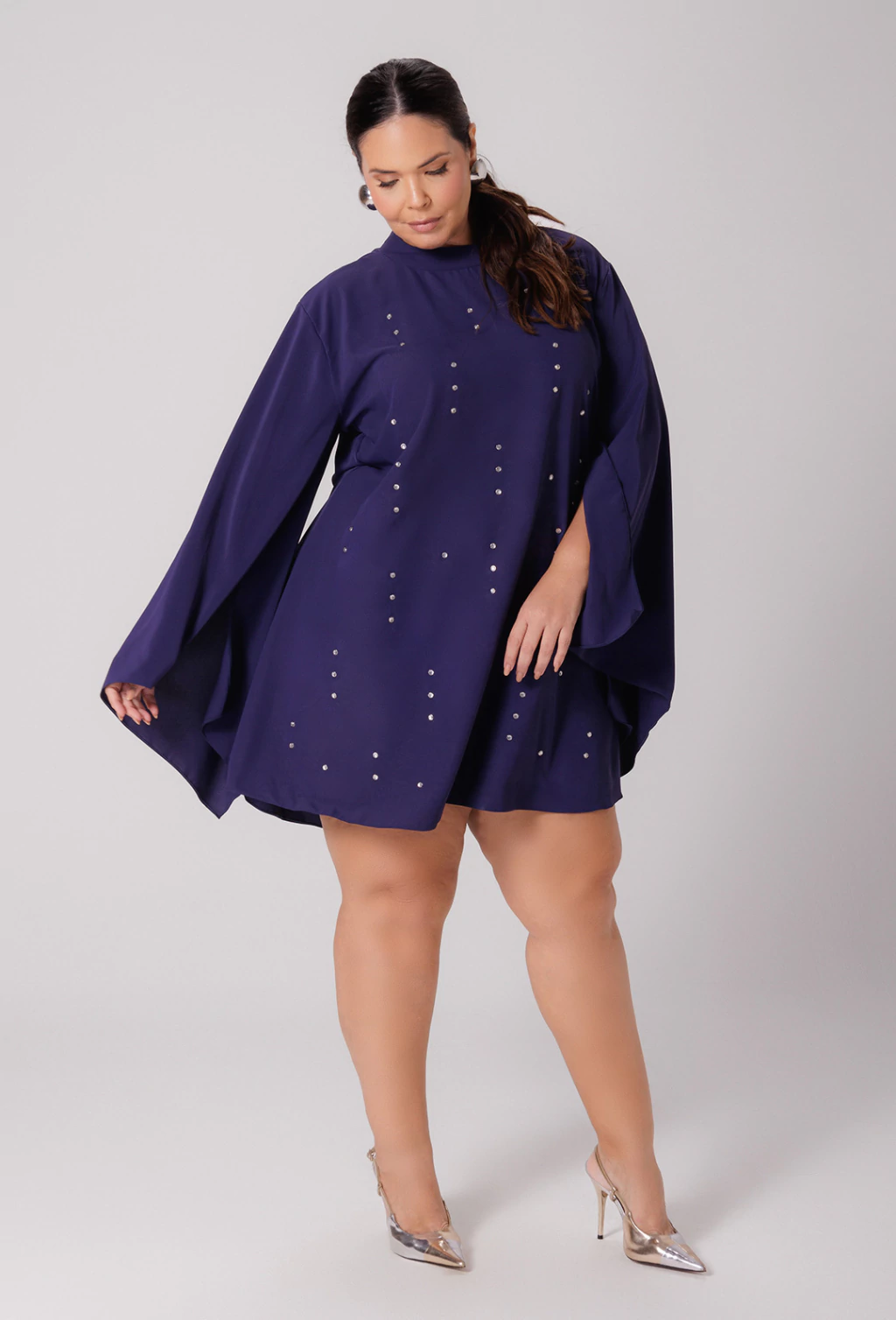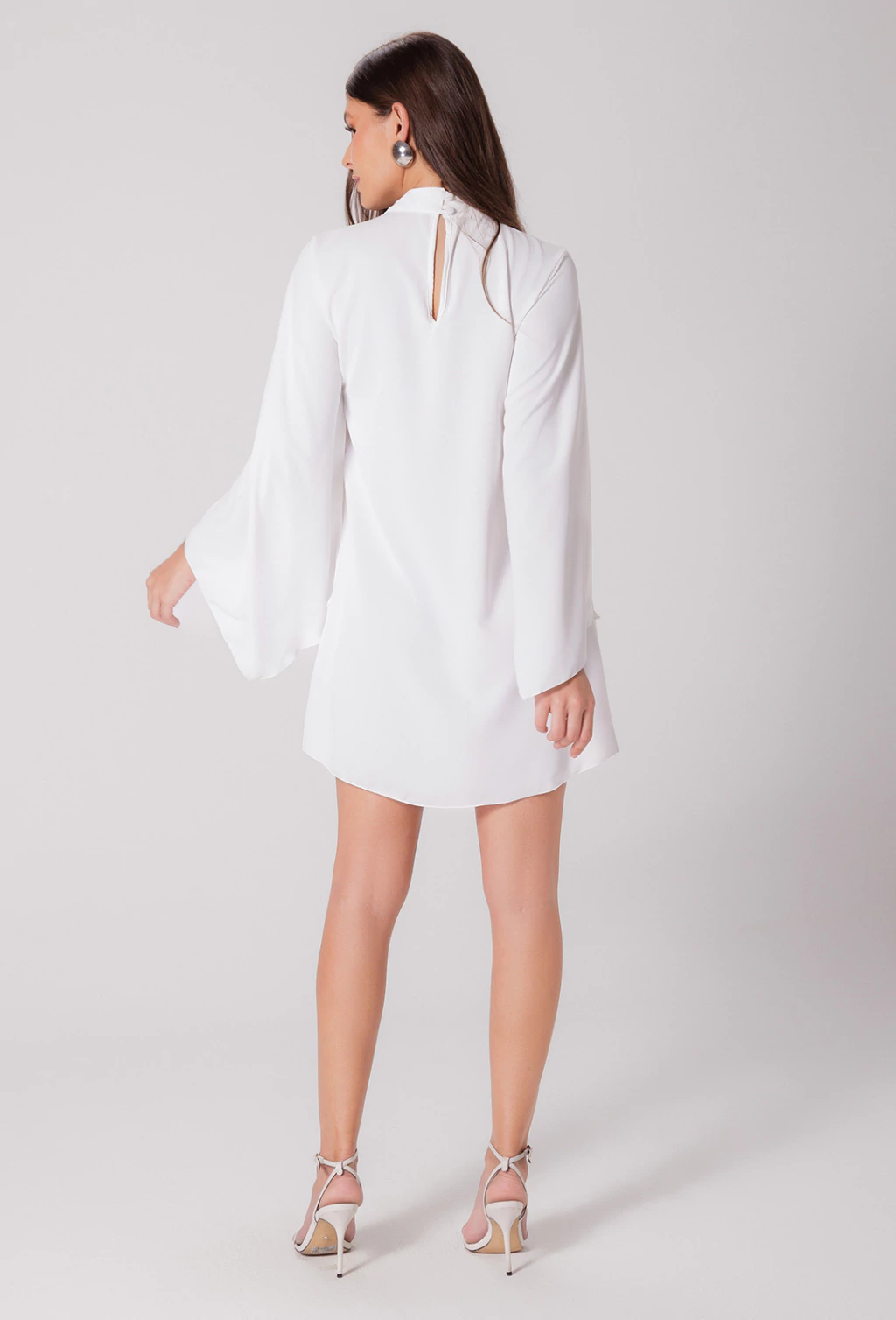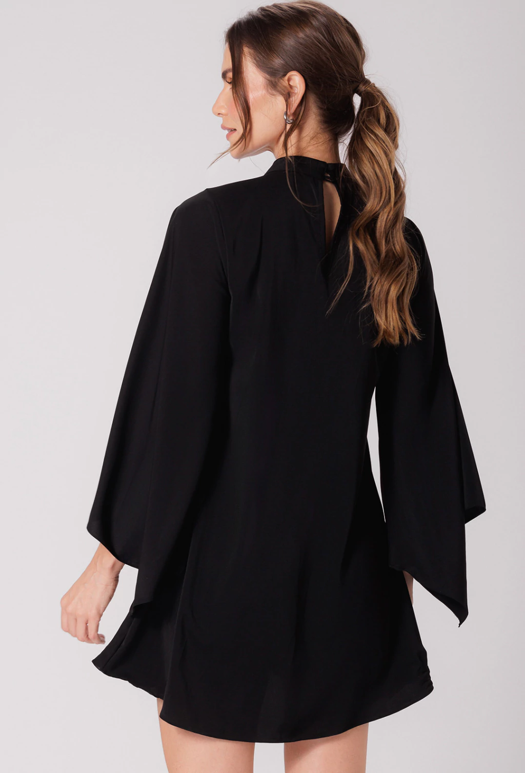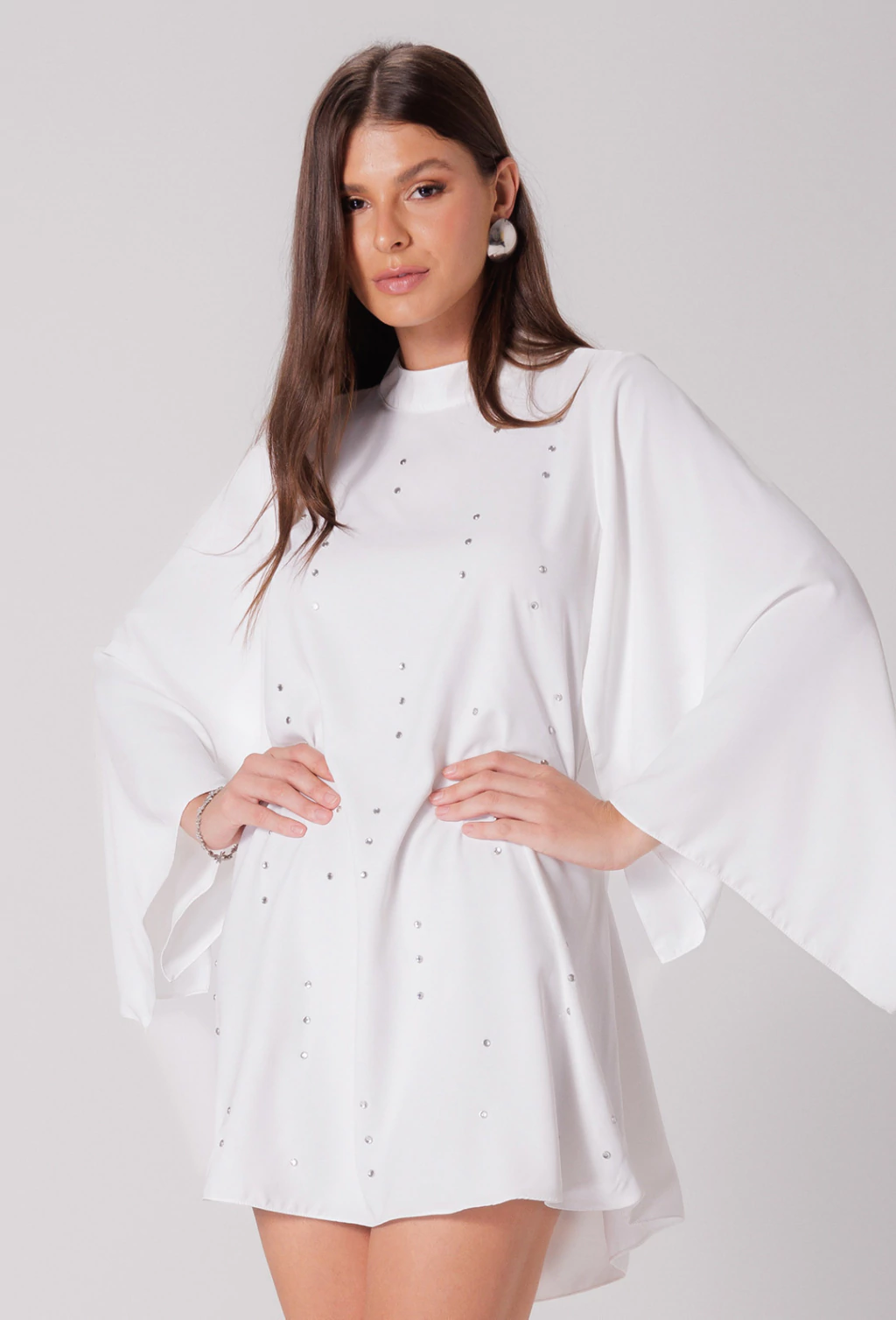 Confeccionado em alfaiataria leve o vestido Tamara é uma peça que exala elegância. Sua modelagem evasê soltinha proporciona liberdade de movimento e um caimento suave no corpo, enquanto as mangas longas abertas adicionam um toque de graciosidade com seu caimento fluido, que se combinam com a gola alta, fechada atrás por botões, criando um visual com estilo refinado. Outro detalhe é que o corpo do vestido é adornado com aplicações de pedraria que adicionam brilho e sofisticação.