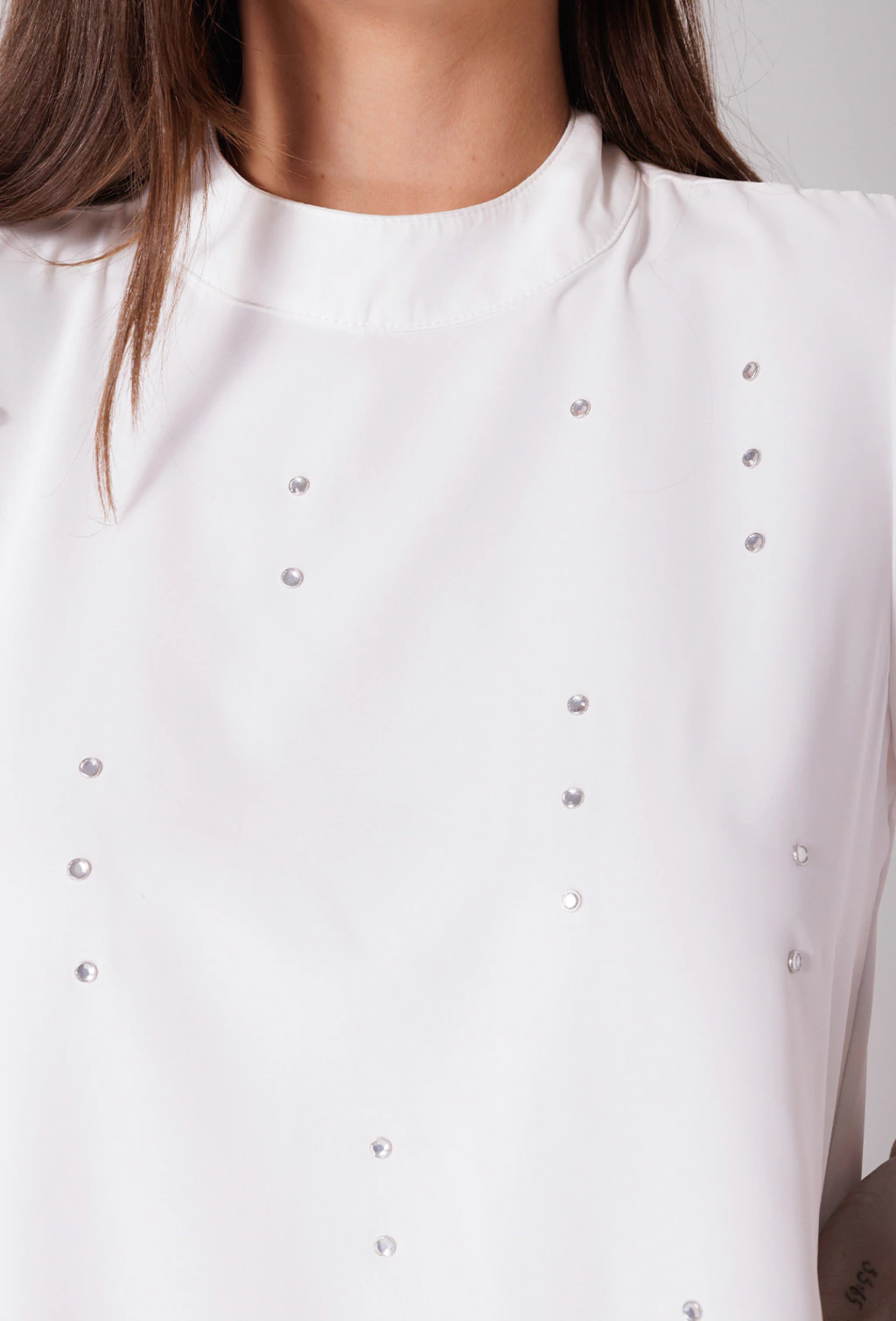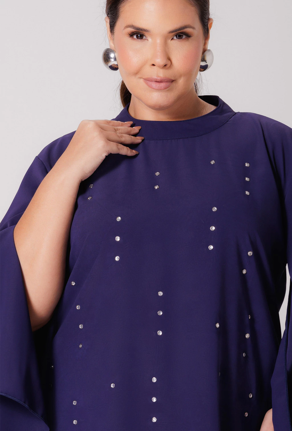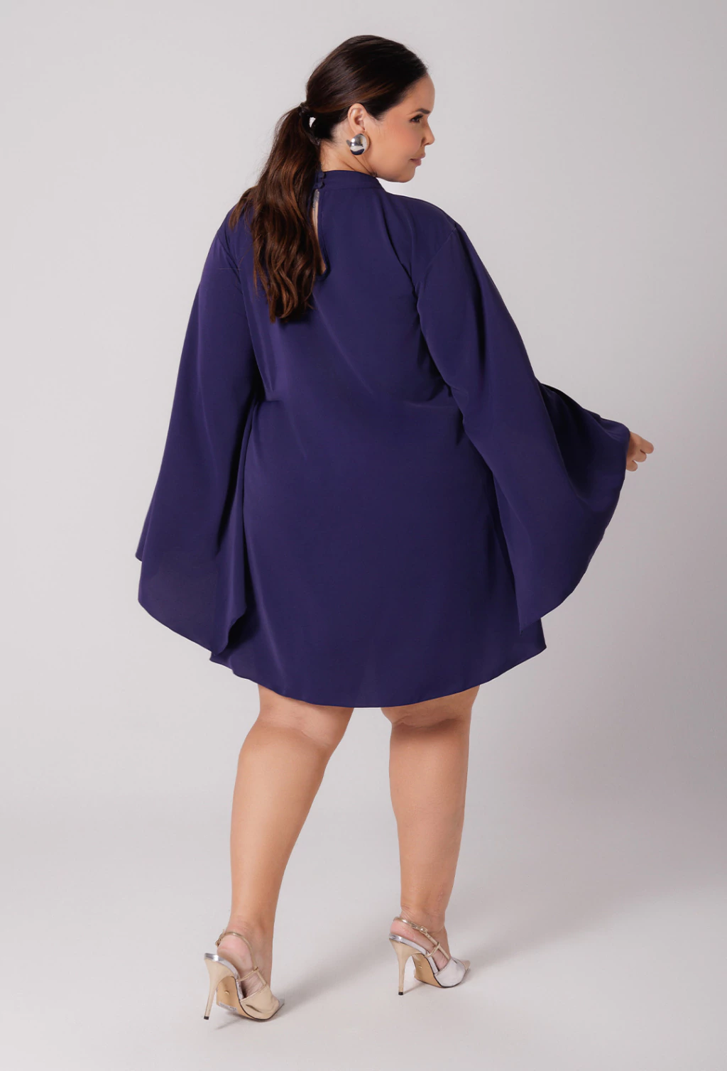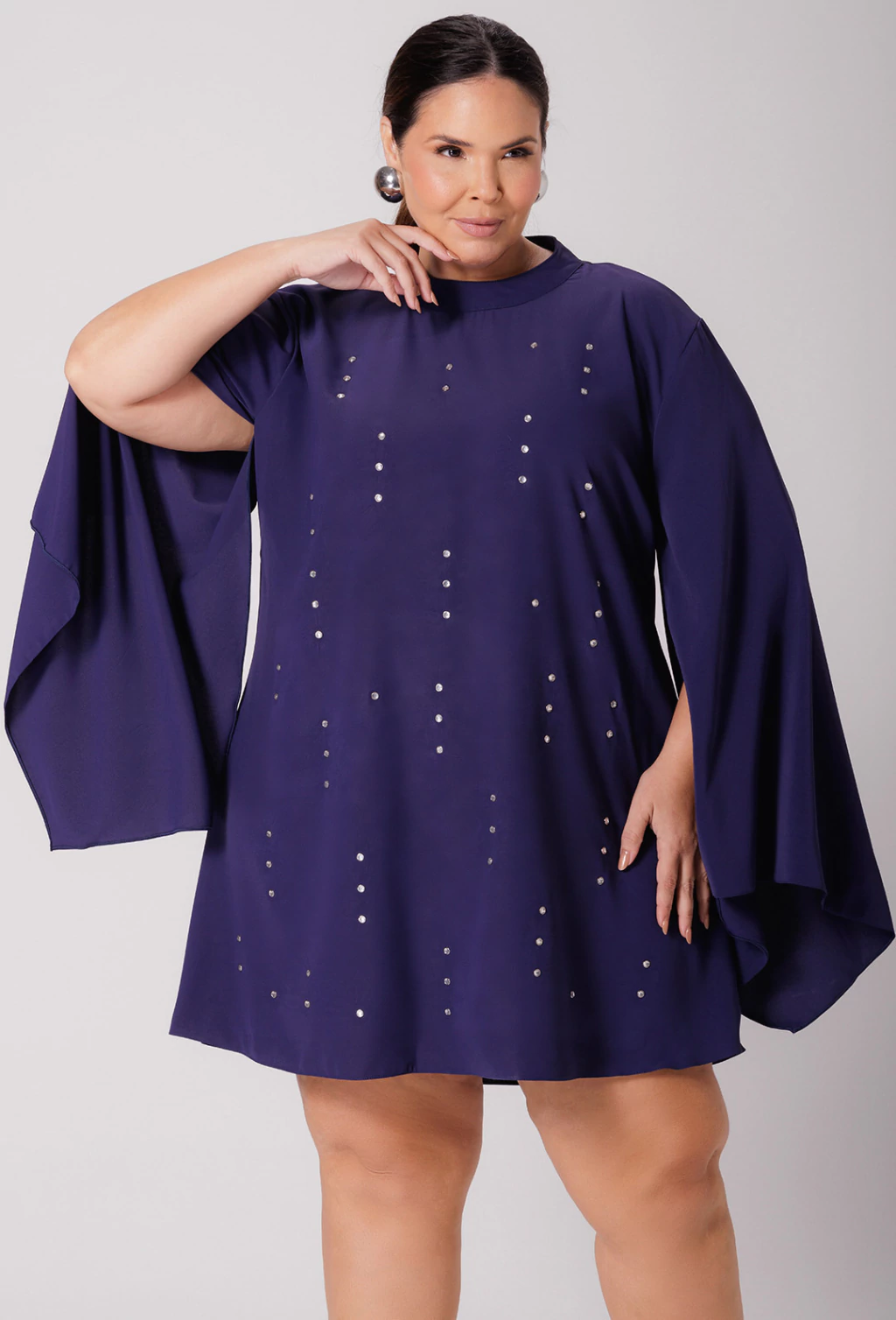 Confeccionado em alfaiataria leve o vestido Tamara é uma peça que exala elegância. Sua modelagem evasê soltinha proporciona liberdade de movimento e um caimento suave no corpo, enquanto as mangas longas abertas adicionam um toque de graciosidade com seu caimento fluido, que se combinam com a gola alta, fechada atrás por botões, criando um visual com estilo refinado. Outro detalhe é que o corpo do vestido é adornado com aplicações de pedraria que adicionam brilho e sofisticação.
