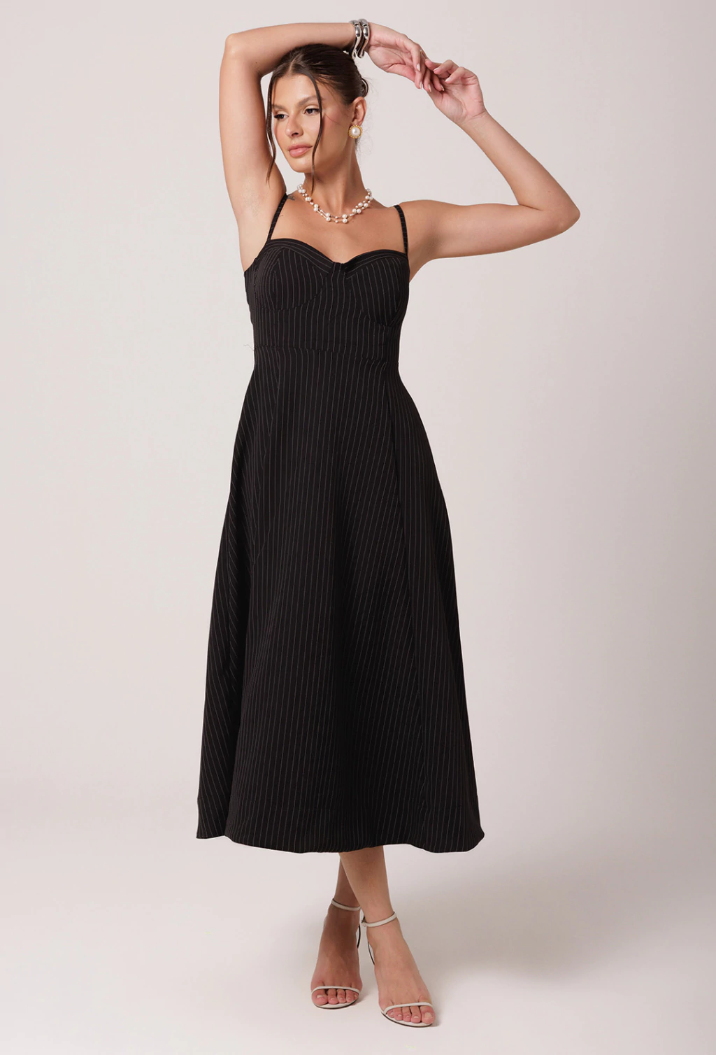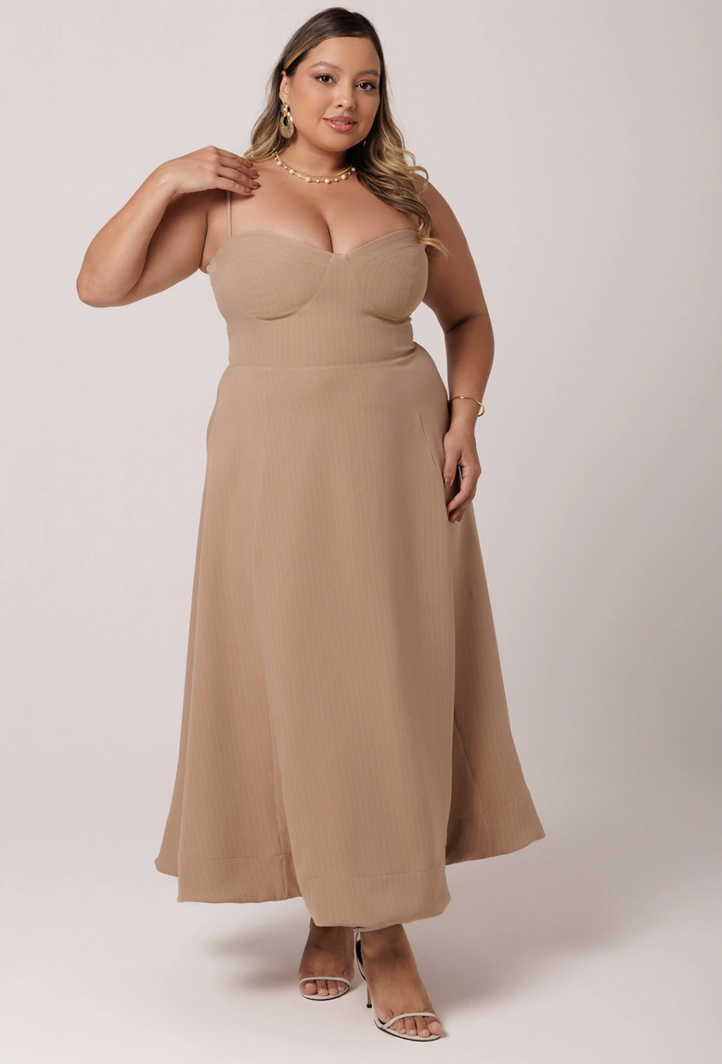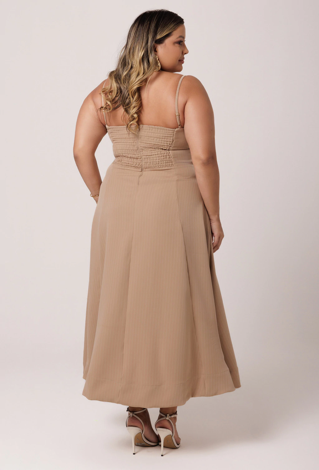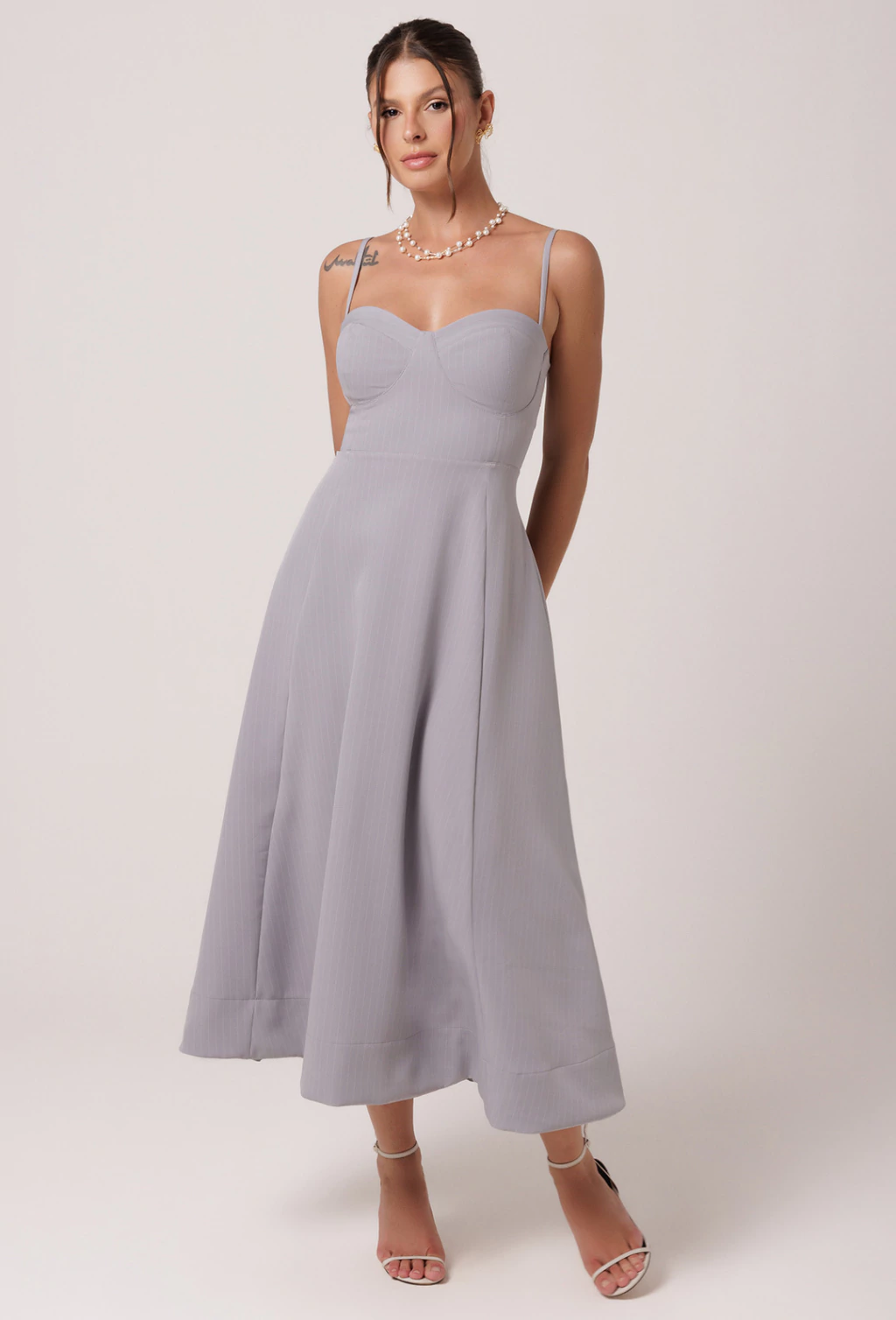 Vestido confeccionado em Alfaiataria risca de giz. O Vestido Viola é um verdadeiro encanto com sua saia godê ele proporciona volume e movimento a peça. Seu comprimento é longuete, tendo sua barra na faixa do tornozelo. A parte do busto tem o desenho de um corselet, valorizando muito o busto com o decote bem estruturado. As alças possuem regulador dando mais conforto a diferentes corpos. A cintura bem marcada valoriza ainda mais a silhueta.