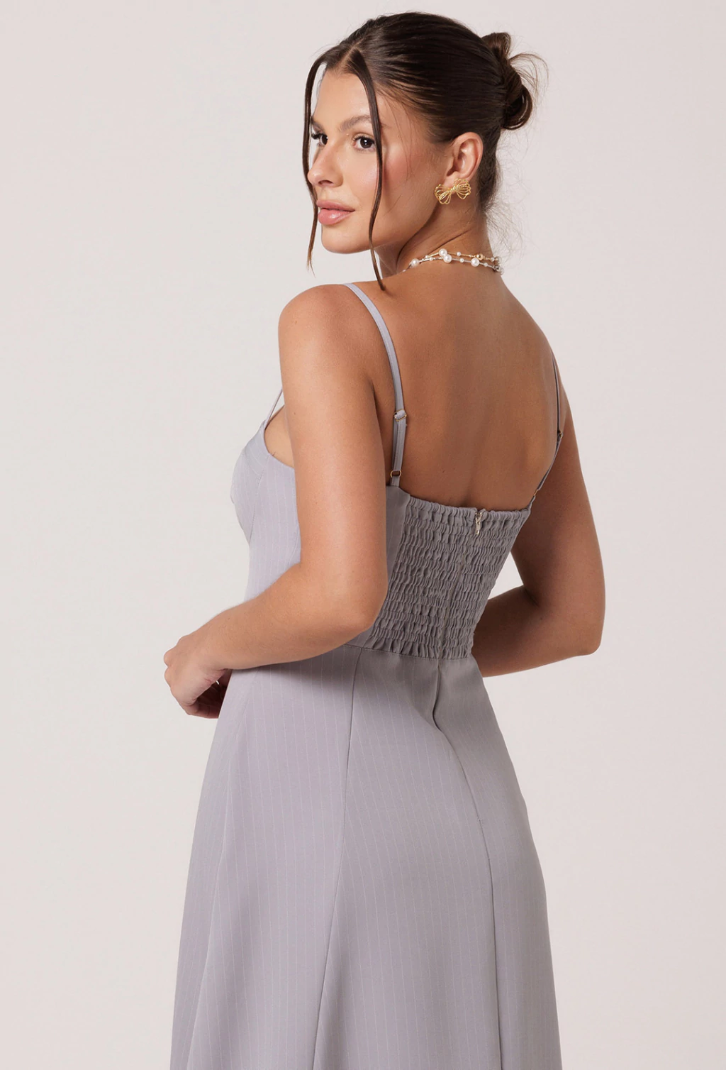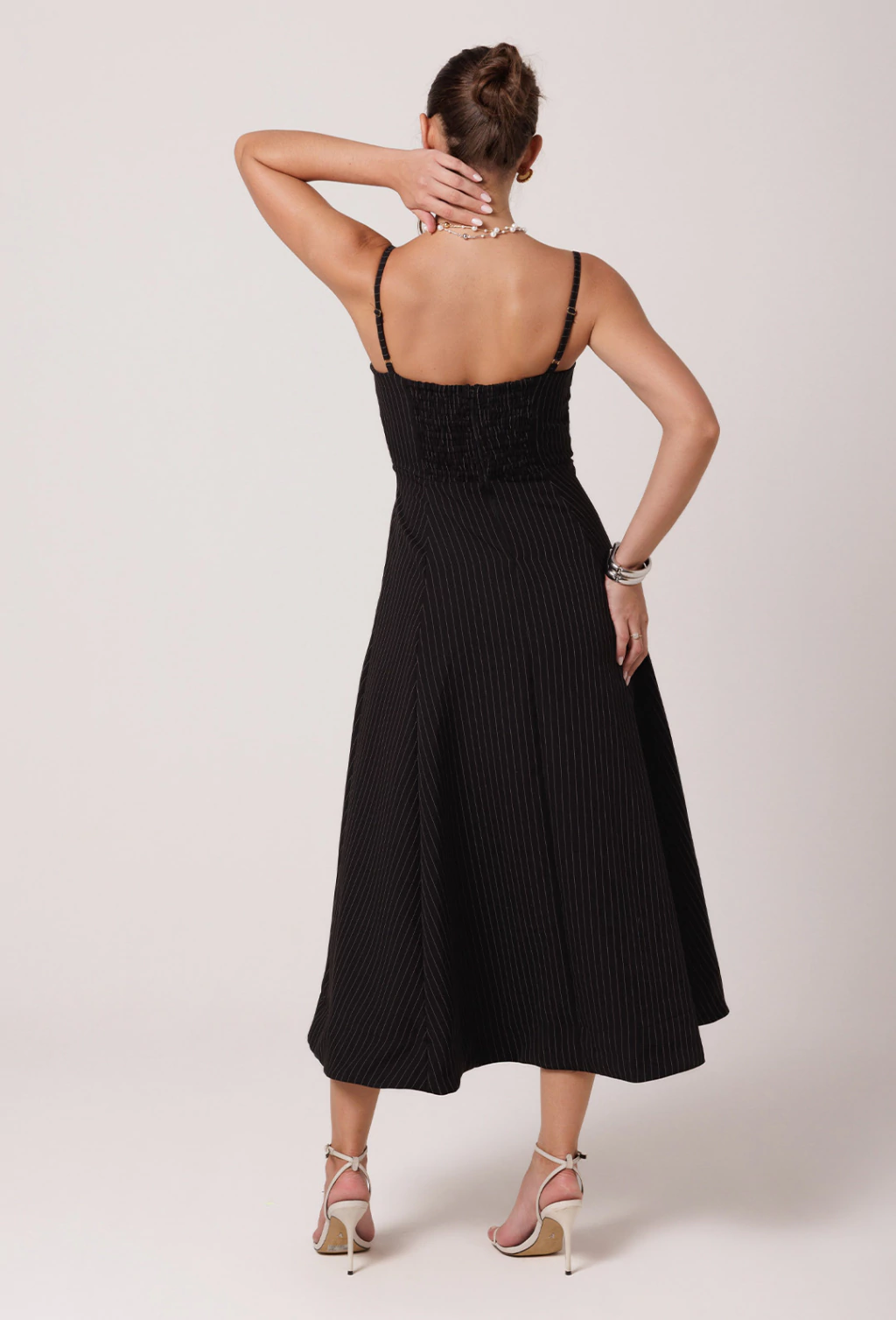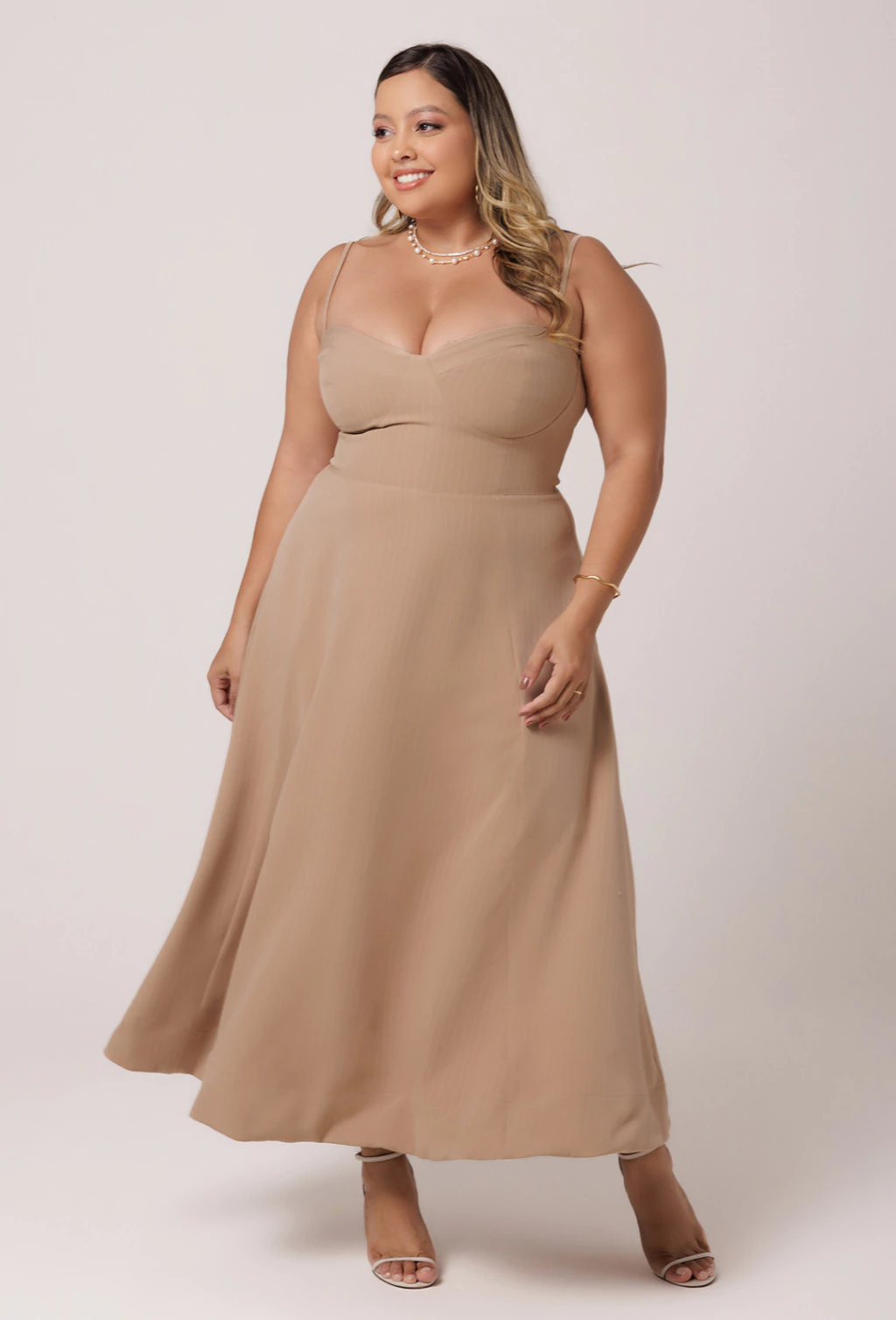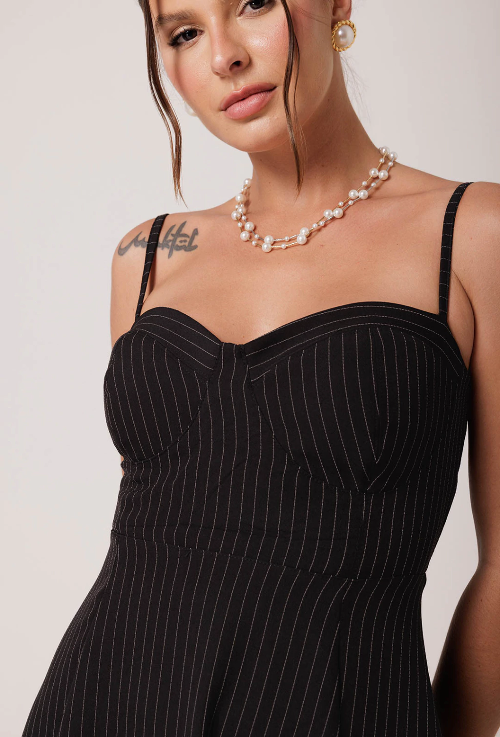 Vestido confeccionado em Alfaiataria risca de giz. O Vestido Viola é um verdadeiro encanto com sua saia godê ele proporciona volume e movimento a peça. Seu comprimento é longuete, tendo sua barra na faixa do tornozelo. A parte do busto tem o desenho de um corselet, valorizando muito o busto com o decote bem estruturado. As alças possuem regulador dando mais conforto a diferentes corpos. A cintura bem marcada valoriza ainda mais a silhueta.